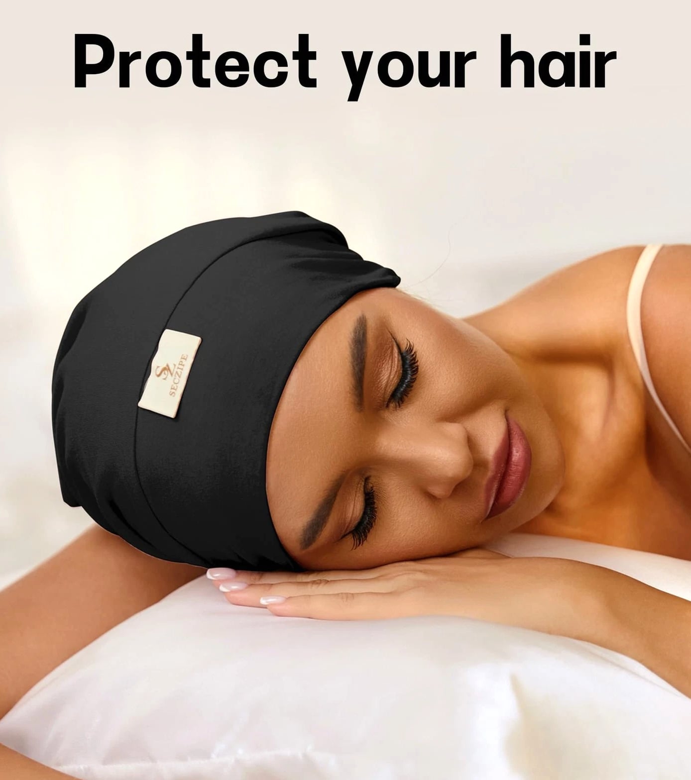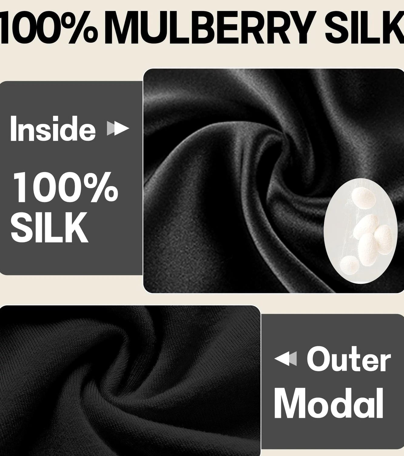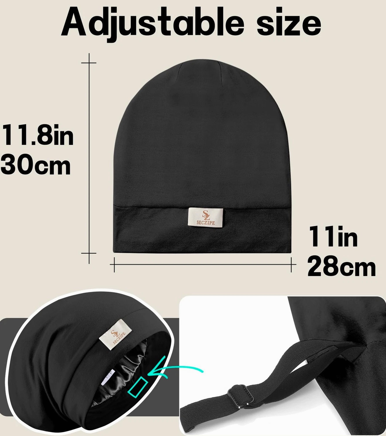 SECZIPE 100% Mulberry Silk Bonnet for Sleeping Curly Hair, One Size Black Product Details 100% Mulberry Silk: Lining made of 100% mulberry silk, the silk sleep cap has the characteristics of softness, warmth, and comfort, allowing you to experience unparalleled comfort during sleep Efficiently Protect Hair: Silk night caps have the delicate texture and moisture absorption of silk effectively block dust and grease, protecting hair from friction and damage, reducing the possibility of tangling and breakage Suitable for Multiple Occasions: This silk sleep bonnet not only provides protection during sleep, but can also be used for bathing, makeup, yoga, and other occasions. Lightweight and portable, perfect for travel or outdoor use Design Details: This bonnet is made of a dual-layered construction, with a Modal outer layer and a silk lining. The Modal outer layer is wrinkle-resistant and easy to clean, while the silk inner layer is smooth and soft, offering protection for the hair. The hidden adjustable strap design allows for tightening or loosening based on personal preference. Easy Cleaning: Hand wash with cold water(<30 ℃/ 80℉) with mild detergent, then air dry in a cool place. Silk material is easy to clean and maintain, keeping the sleep cap clean and hygienic