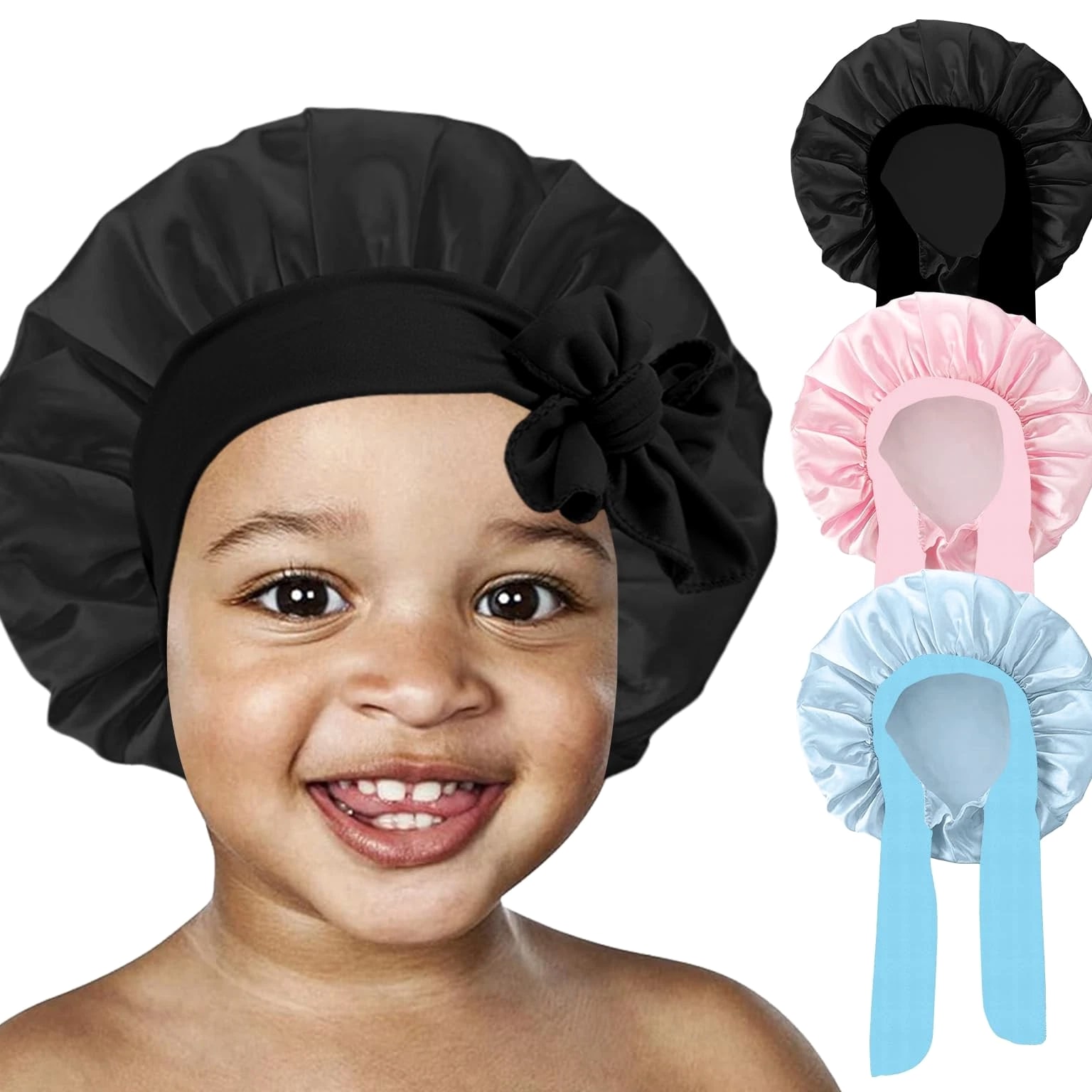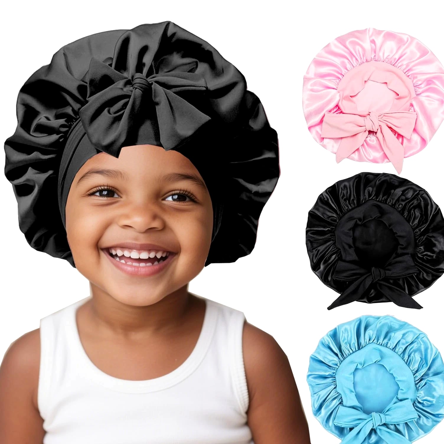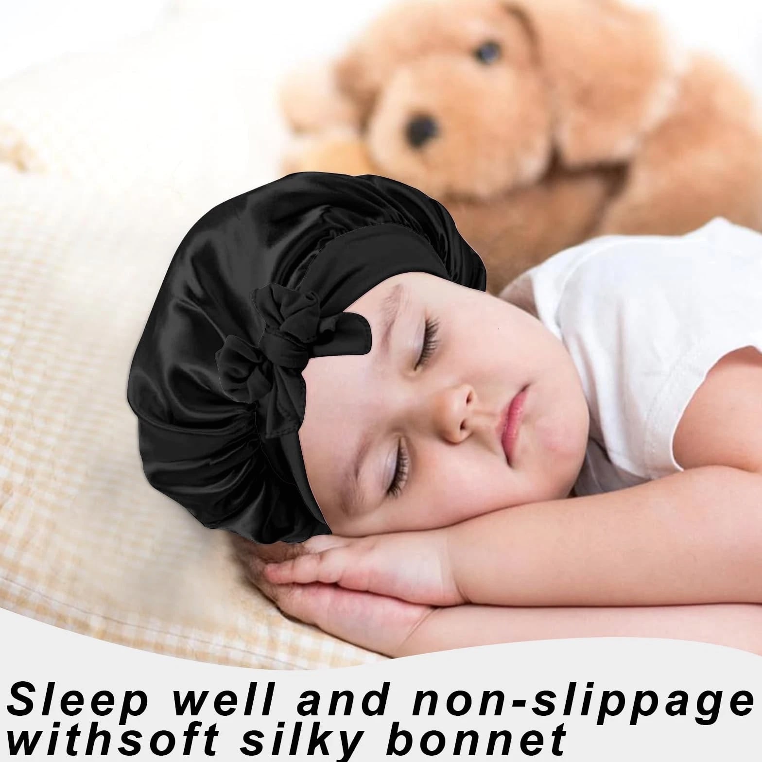 3 Pcs Kids Satin Bonnet for Sleeping - Baby Silk Bonnet for Sleep, Kids Hair Bonnets for Curly Hair Girls Boys with Wide Elastic Band, Sleeping Cap for Teens Toddler Child (Pink+Black+Light Blue) 【You Will Receive】- Package contains 3pcs in 3 colors Kids Satin Cap, colors pink, light blue, black, bright colors, deep children like, no additives, safe and environmentally friendly, hypoallergenic, more suitable for baby's physique, sufficient quantity allows you to use, change and share according to your preferences. High Quality Soft Satin Material:- Our silk baby hood is made of satin material, soft, shiny, smooth, like silk, breathable, lightweight, good elasticity, more suitable for babies, suitable for all seasons and occasions. Elastic Headband: The Kids Silk Caps are suitable for children aged 5-8. Equipped with baby hood, makes the sleeping hood suitable for most children's head sizes, easily wrap your hair with moderate tension, ties a lovely medium sized bow as needed to better protect your child's head, simple and practical, perfect for all hair lengths and thickness. Multifunction Use: This sleeping cap can not only be used to protect the scalp while sleeping at night, while the child is playing at home, bring dust to reduce contaminated skin, bathing time can help baby away from moisture, very practical. 【Satisfactory After-Sales Service】 - No matter what questions about the product, you can reach us at any time, we will give you a satisfactory answer within 24 hours. Please hand wash or machine wash in cold water with mild detergent, squeeze out excess water and then dry naturally.