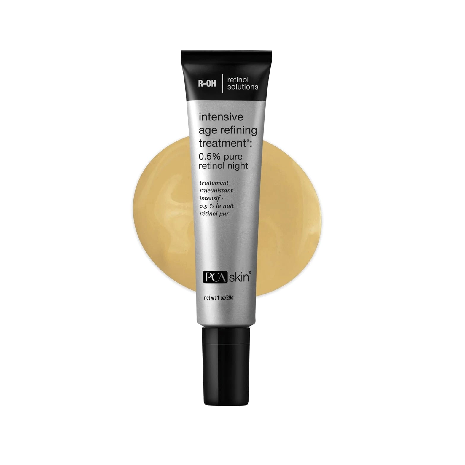 PCA SKIN Intensive Anti Aging Retinol Serum, 0.5% Pure Retinol Face Serum, Minimizes Fine Lines and Wrinkles, 1 fl oz Tube PCA SKIN Intensive Anti Aging Retinol Serum is a 0.5% pure Retinol serum for face that evens skin tones overnight and helps reduce water loss to help firm the skin and minimize the appearance of fine lines and wrinkles from appearing. This hyperpigmentation treatment serum combines 0.5% pure Retinol, Niacinamide, and Resveratrol together to reduce water loss and skin discoloration while you sleep for a more even skin tone and firmer look. Formulated with Niacinamide, this Retinol and Niacinamide serum reduces age-related skin yellowing and redness, promoting a clearer complexion and more even skin tone. This discoloration correcting serum employs OmniSome delivery technology, which stabilizes Salicylic Acid to increase penetration into the skin, to help you achieve a clearer complexion more quickly. For optimal results, apply a small amount of this advanced Retinol face serum after cleansing at night, gradually increasing frequency to twice per week and follow with your favorite PCA SKIN moisturizer.