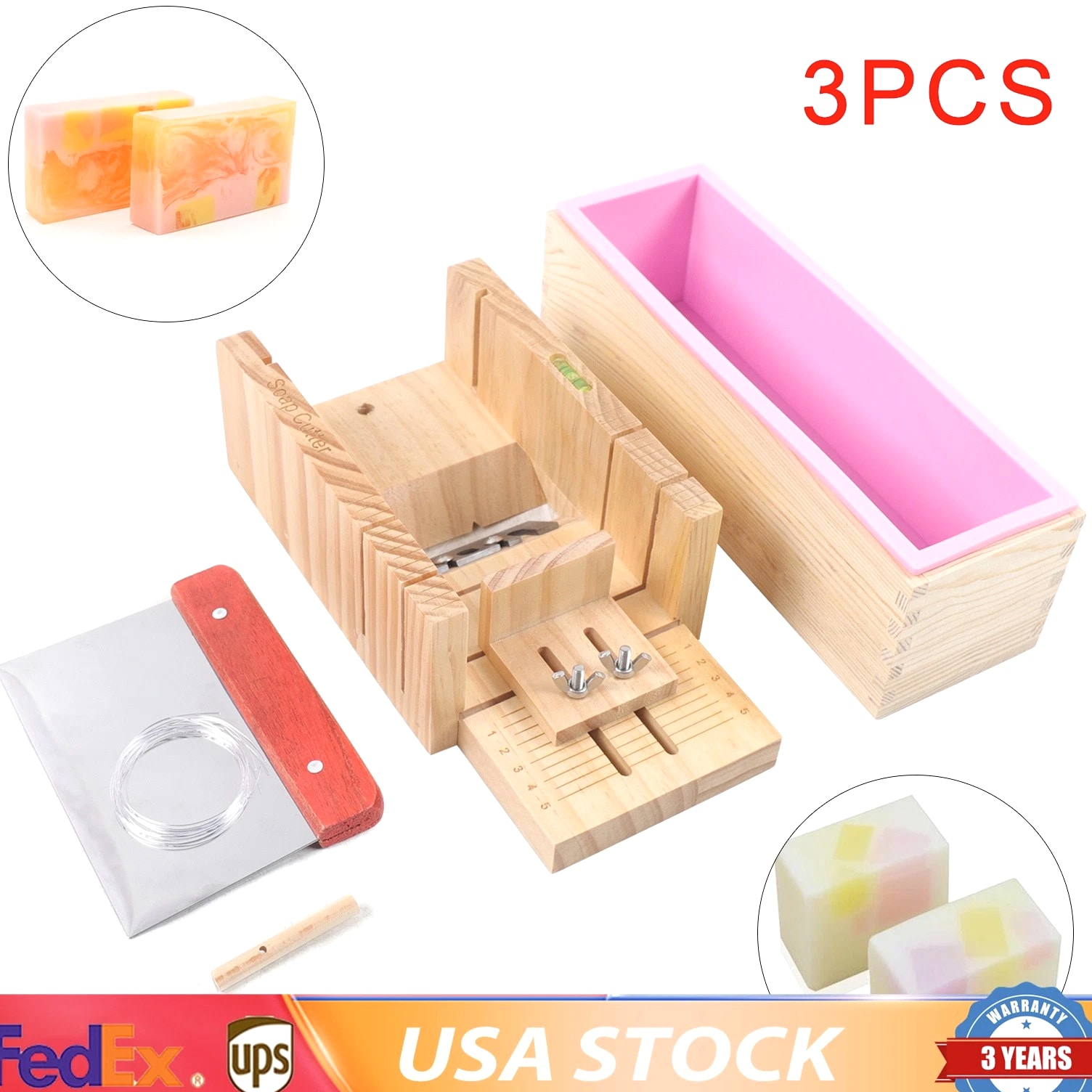 Professional Soap Making Supplies Kit 3 Pcs Set Soap Tools, Cakes Mold, Handmade DIY NEW Description 3 Pcs Soap Making Tool Kit Loaf Soap Mould Adjustable Wooden Soap Cutter Slicer Gift Description: Name: Soap cutter set Style: modern and simple Process: grinding, polishing Specification: 3 Pcs set Material: wood + silicone + stainless steel Product Size: Wooden mold box: 9.6" × 2" × 2.8" Wooden Soap cutter Mold: 10.8" × 3.5" × 5" Straight knife: 5.9" × 4.3" Function: used to make handmade soap candles, cakes, etc. Applicable occasions: holidays, weddings, birthdays, full moons, travel commemorations, graduations, parties, etc. Features: 1. Multifunctional: suitable for cutting soap and candles 2. The surface of the accessories is smooth and easy to clean 3. Adjustable thickness: clear scale reading, you can adjust the thickness of soap, easy to observe during operation, easy to get the correct soap size you need. 4. High quality and easy to clean: made of exquisite solid wood and food-grade stainless steel, safe high temperature resistance, corrosion resistance, long service life Tips: When You Start To Make A Soap, You Need To Put The Silicone Mold Into The Wood Box. And Then Pour Liquid Soap Into The Silicone Mold. After The Liquid Soap Is Hardened, You Take Out The Silicone Mold And Remove The Soap. Wire Cutter Should Be Used When The Soap Is Still A Bit Soft. Packing list: 1 × Wooden box with silicone container 1 × Wooden Soap cutter Mold 1 × Straight knife Packing size: 29 × 17 × 13cm / 11.4" × 2.7" × 5.2" Package weight: 1.35kg / 3lb DESCRIPTION: Payment, Delivery details, Terms of sales, About us, Contact us Payment We accept multiple payment methods. Fees such as import duties, taxes are not included in the item price or shipping costs. These charges are the buyer's responsibility. Delivery details Shipping: 2-9 working days to USA Terms of sales We maintain high standards of excellence and strive for 100% customer satisfaction. Feedback is very important to us. We hope that you contact us immediately before