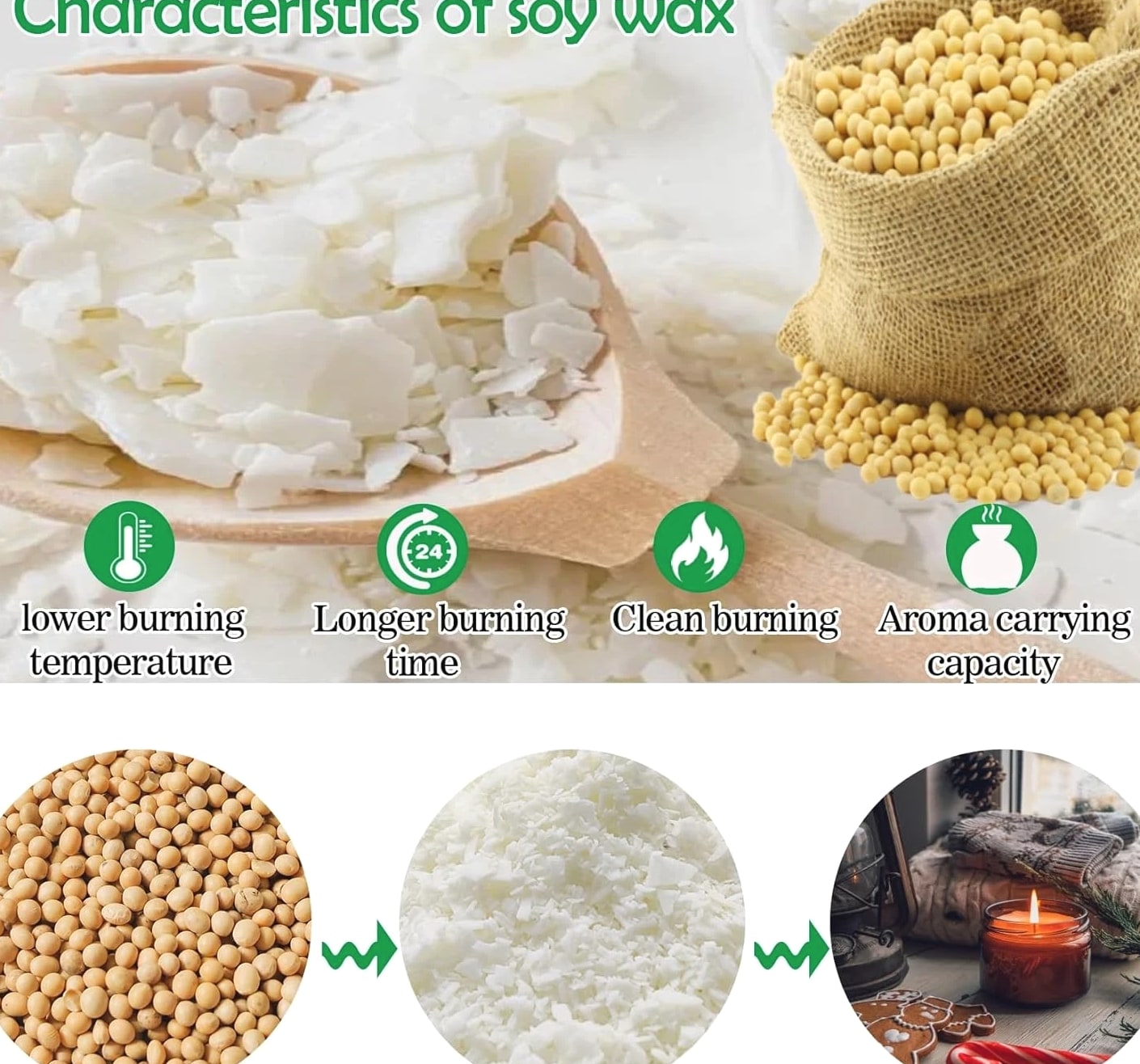 Pure Soy Wax Flakes - DIY Candle Making Soy Wax, Soy Wax Bulk, DIY Soy Candle Wax, Candle Making Soy Wax for Container Candles, Cup Wax, DIY Candle (420 Grams) FREE AND FAST SHIPPING! About this item Longer Burning Time - Soy wax for candle making is a common candle making material with low melting point and extended burning time. You can DIY soy candle wax according to your creativity and preference; such as pillar candles, hand carved candles, scented candles, seaweed candles, colorful candles and so on. It is perfect for indoor (e.g. home, office, restaurant, hotel, etc.) decoration or providing ambient lighting. Skincare & Textiles - Soy wax bulk is commonly used as an auxiliary ingredient in skincare and cosmetics. It provides moisturizing, hydrating and skin protection. Soy wax flakes can be applied in the treatment and processing of textiles and spun yarns. It improves the luster, softness and anti-static properties of textiles. Good Scent Carrying Capacity & Easy To Dye - Soy wax can effectively carry and release scent, so that the candle will give out a long-lasting fragrance when burning. It can be mixed with aroma oils or essential oils to produce different aroma effects. Soy wax accepts pigments and dyes well, making it easy to color and decorate. This makes making colored and decorative candles easier and more flexible. Suitable For Banquet And Event Venues: - Soy wax candles are widely used in banquets, weddings, parties and other special event venues. They can create a romantic, solemn or joyful atmosphere. If you receive the wax showing chunks, please rest assured that this is a normal phenomenon and does not affect the effect of use. After-Sale Guarantee - If you have any suggestions about our wax, please feel free to contact us. We support returns and refunds. Product We offer a 30-Day Return Policy on items which you are not completely satisfied with. You have the option for a full refund or an exchange of the item. No returns are available on items
