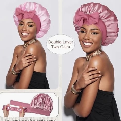 Satin Bonnet Sleep Cap Double Layer Hair Bonnet with Bean Paste + Pink