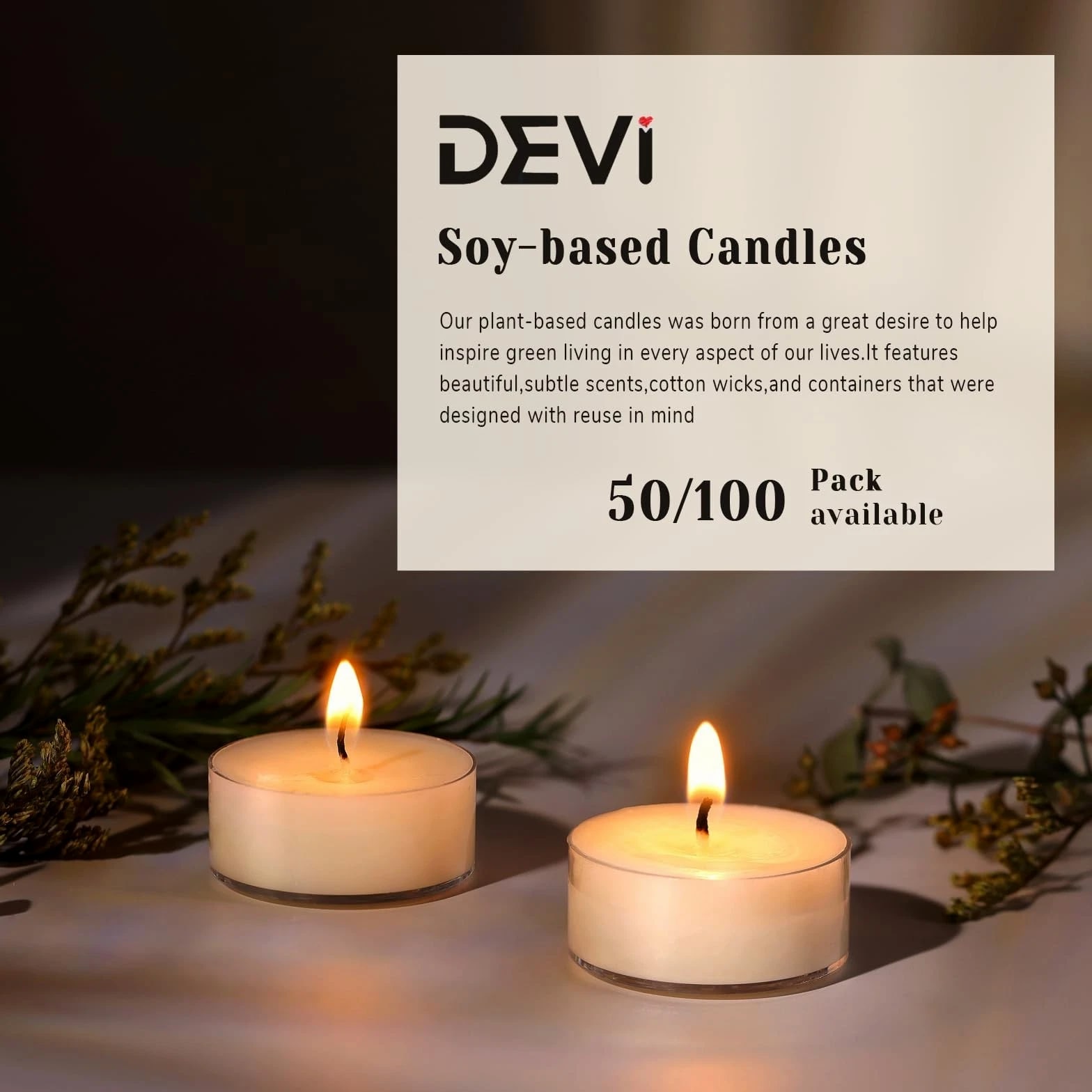 DEVI Soy Tea Lights Candles 50 Pack, Unscented White Tealight - 4 Hours Long Burning