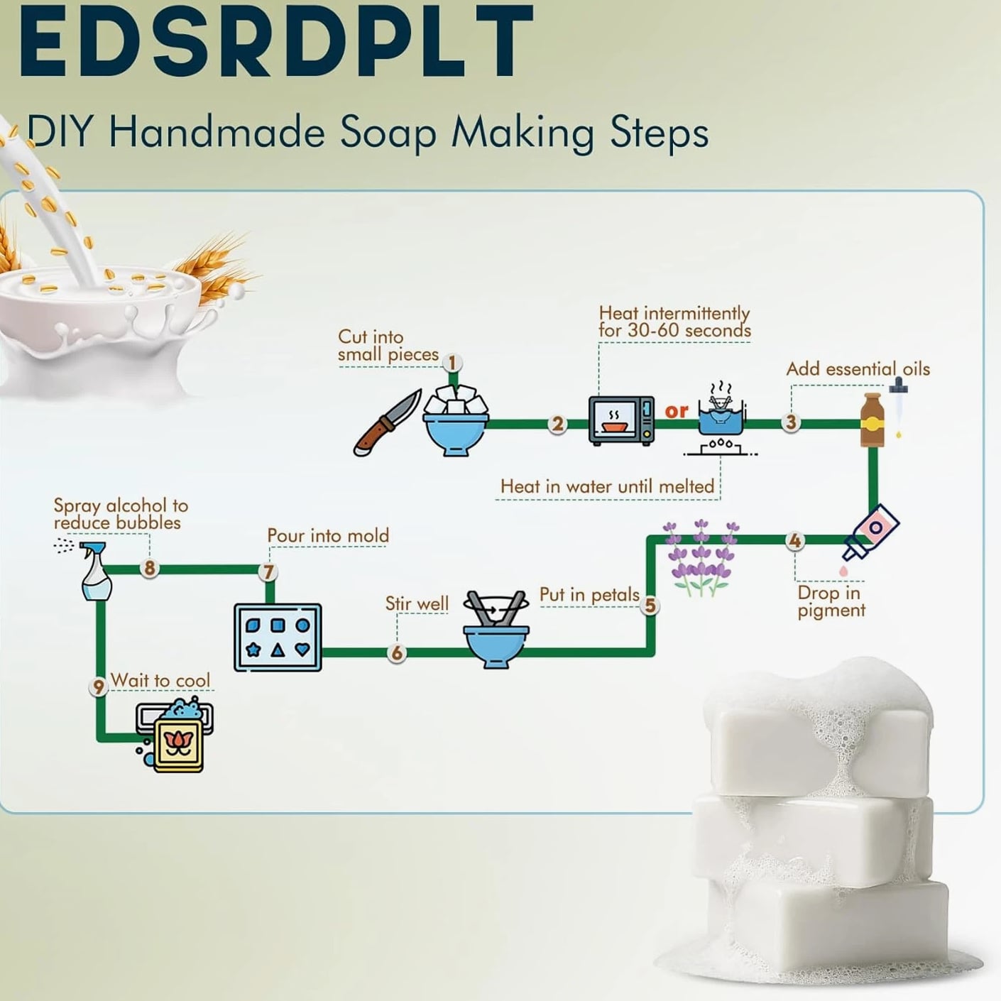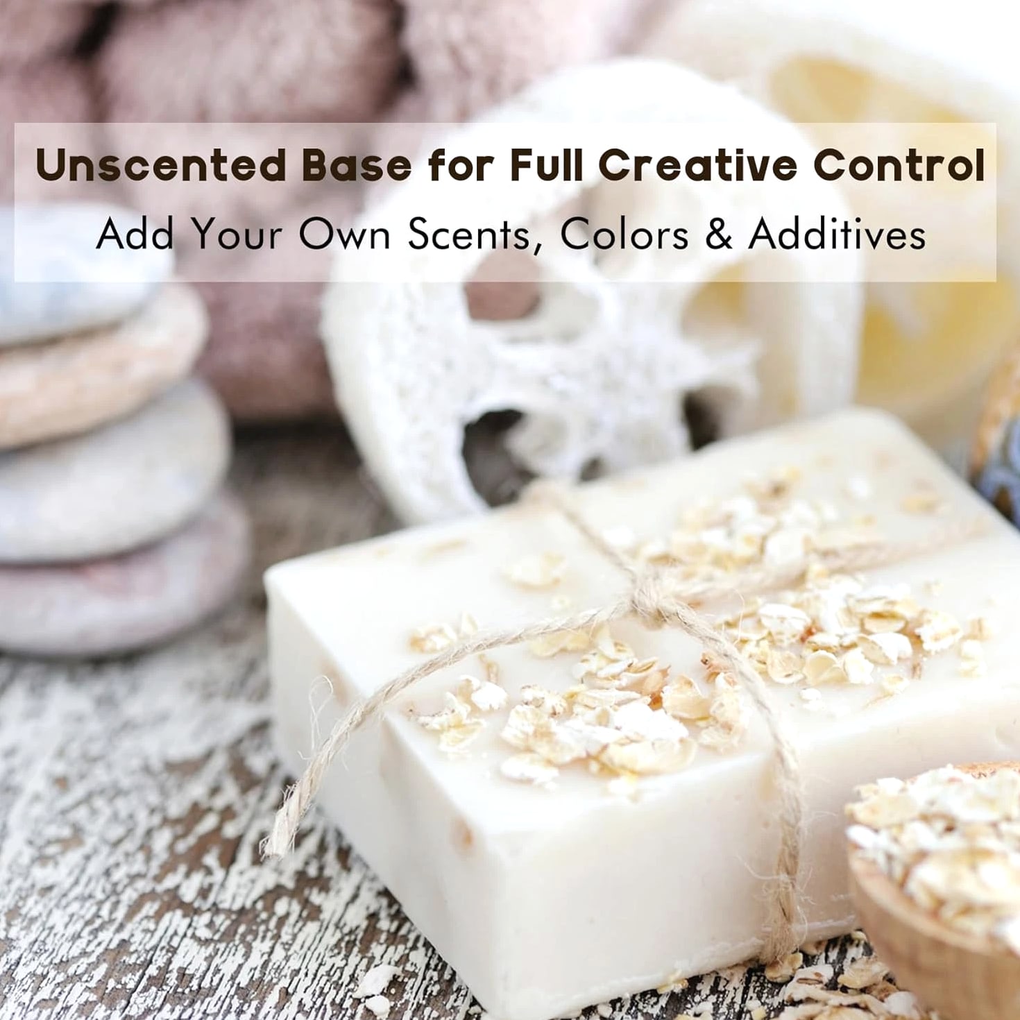 Deeper Pre-Scored Cuts for Effortless Portioning: Upgraded with deeper, clearly defined pre-scored lines, making cutting or snapping clean and precise. No scale needed—easily portion the exact amount you need for consistent melts and less prep time. Smooth Melt & Bubble-Free Melt and Pour Soap Base: This melt and pour soap base features an enhanced formula that melts evenly with minimal air bubbles. Heats smoothly in a microwave or double boiler for a cleaner, more professional finish. Improved Flow for Easy, Even Pouring: Refined melting performance creates a silky, pourable consistency that flows naturally into molds without clumping or uneven layers—ideal for detailed designs and layered soap projects. Unscented Base for Full Creative Freedom: Free from added fragrance, this soap base won't interfere with your formulations. Easily customize with essential oils, fragrance oils, colorants, or additives to create soaps your way. Beginner-Friendly, Reliable for Experienced Crafters: Designed to simplify every step—from cutting to melting to pouring—this upgraded soap base offers consistent results, making it ideal for both first-time soap makers and advanced DIY enthusiasts. Smooth Melt & Bubble-Free formula: This melt and pour soap base features an enhanced formula that melts evenly with minimal air bubbles. Heats smoothly in a microwave or double boiler for a cleaner, more professional finish. Improved Flow for Easy, Even Pouring: Refined melting performance creates a silky, pourable consistency that flows naturally into molds without clumping or uneven layers—ideal for detailed designs and layered soap projects. Unscented Base for Full Creative Freedom: Free from added fragrance, this soap base won't