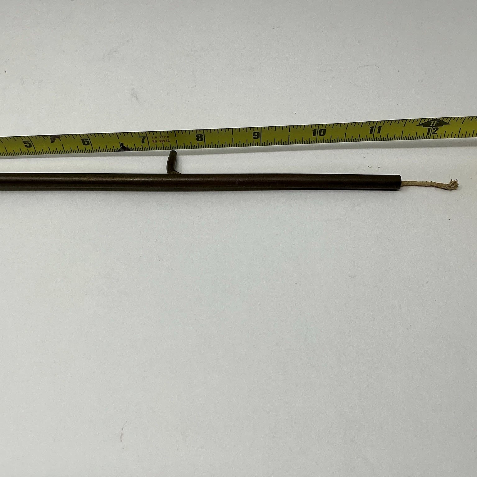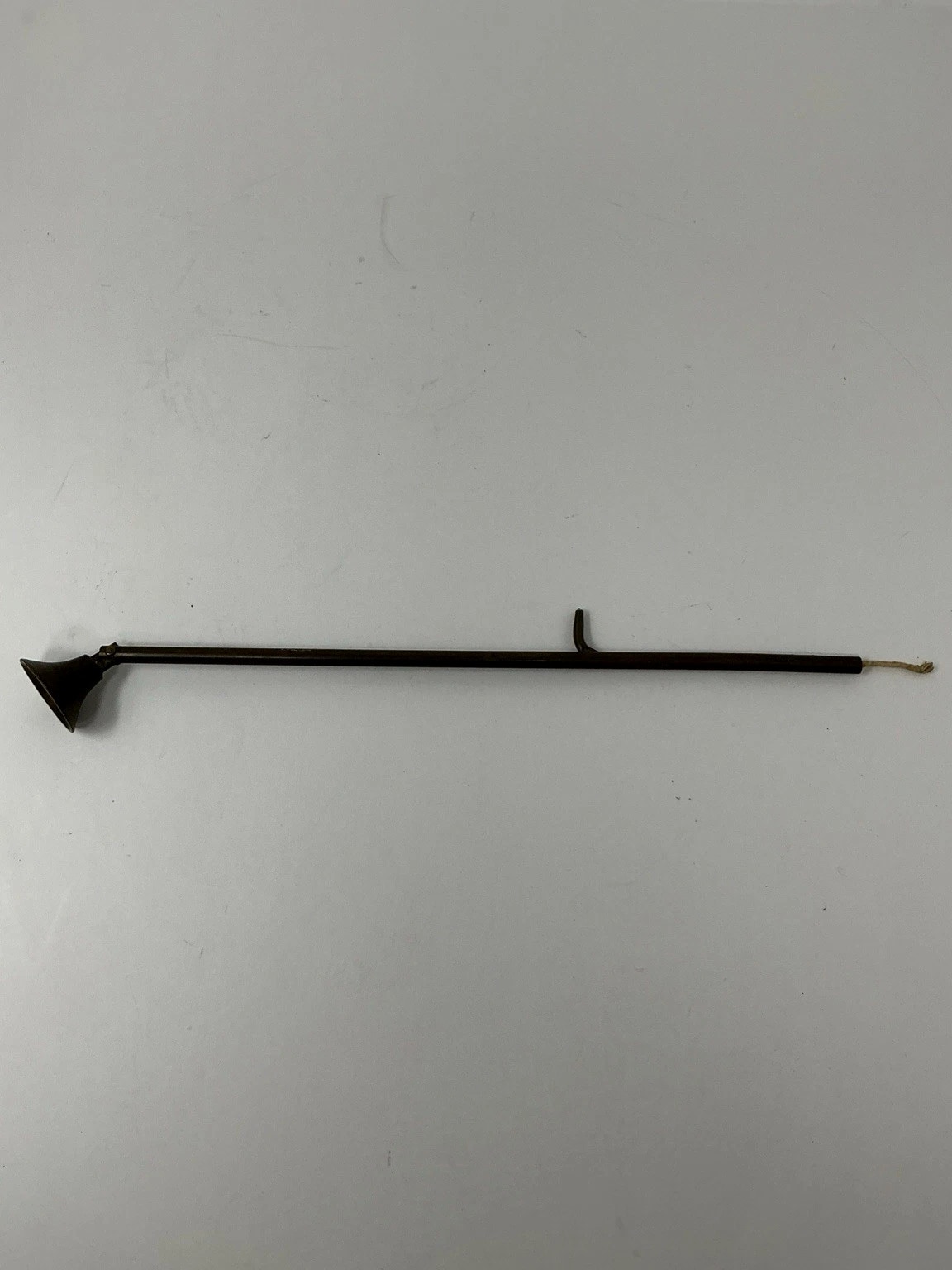 Vintage antique-style candle snuffer crafted from metal (likely brass or bronze tone), featuring a long handle and a classic bell-shaped extinguisher head. This piece is designed to safely extinguish candles without smoke and includes a rare retractable wick pull mechanism (snuffer wick hook) that can be extended and retracted. Such tools were commonly used in the 18th–19th centuries for candle maintenance in homes, churches, and estates. The long handle allows you to reach candles in high holders or chandeliers, making it both functional and decorative. Condition: Good vintage condition with natural patina consistent with age. Shows minor wear signs, which adds to its authentic antique character. Details: • Material: metal (brass/bronze tone) • Length: approximately 12 inches • Features: bell snuffer + retractable wick pull • Era style: 18th–19th century inspired Perfect for: • Antique collectors • Vintage home décor • Candle enthusiasts • Historical or Victorian-style interiors Vintage condition with natural patina; wick pull mechanism fully functional.
