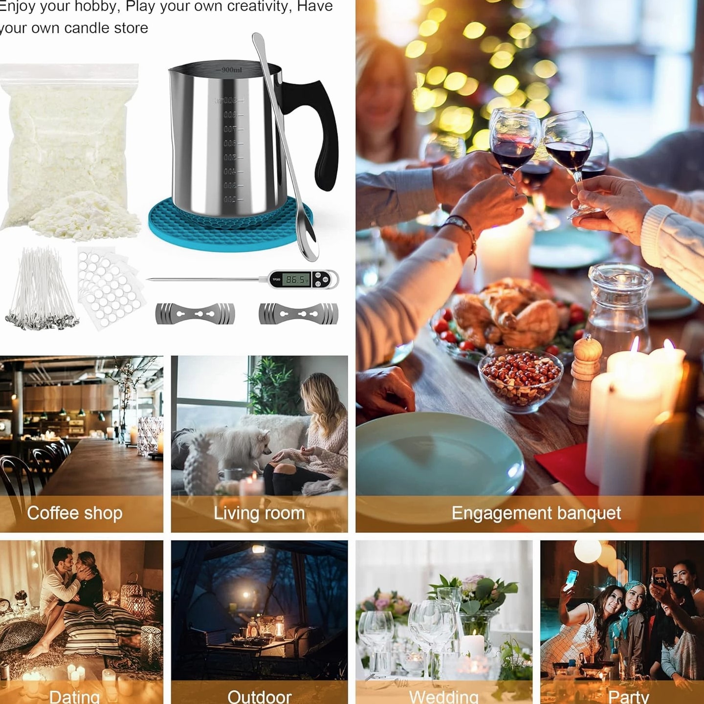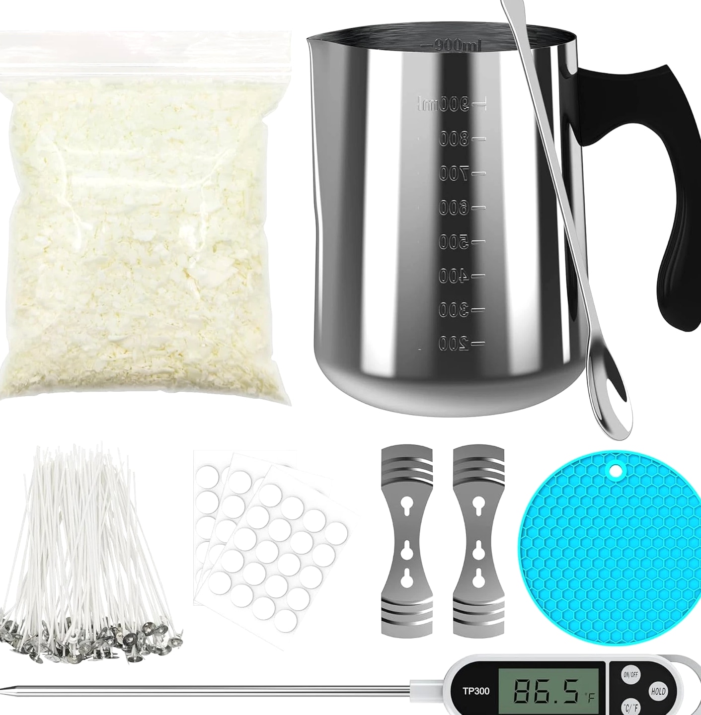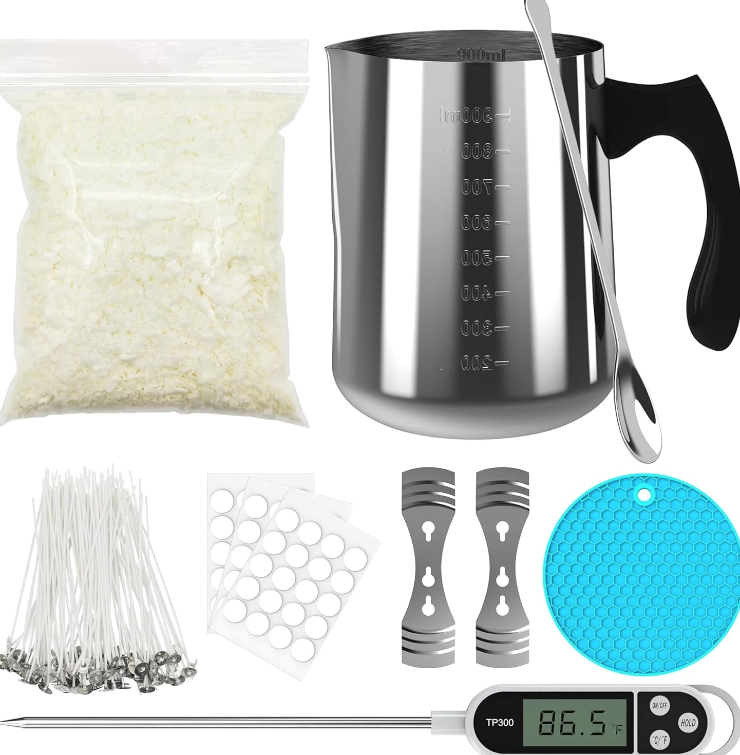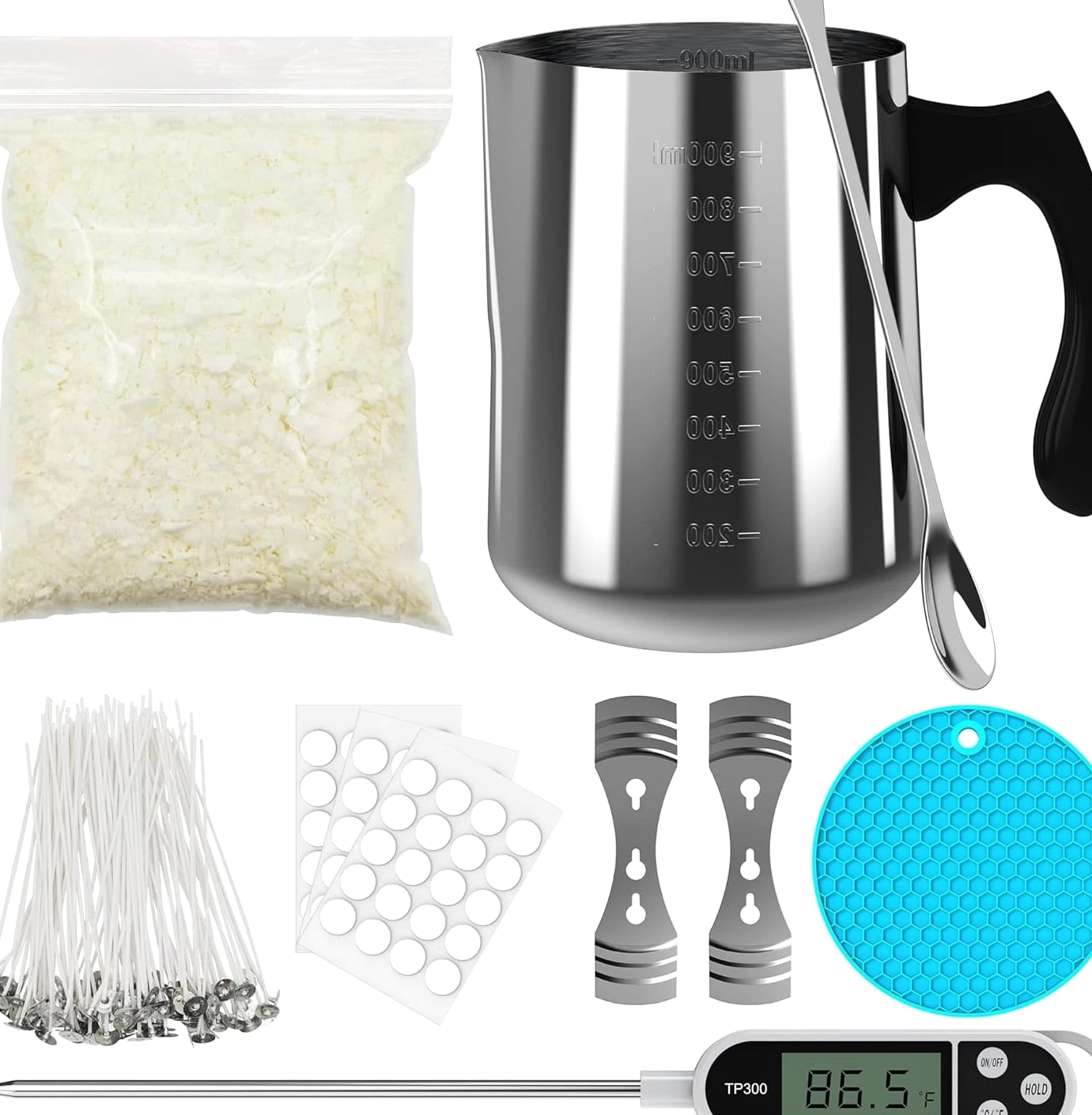 【Upgraded Candle Making Kit】900ml 304 Stainless Steel Candle Pouring Pot x 1, Anti-hot Silicone Mat x1, 12.4oz Soy Candle Wax x1, 5.1'' Candle Wicks x50, Candle Wicks Sticker x60, Stainless Steel Wicks Holder x2, Thermometer x1, Spoon x1, DIY Candle Making Supply, perfect for beginners. (Suggested candle container diameter is 1.9-2.4 inches) 【Large Capacity Candle Pouring Pot】Our Candle Kits feature a large capacity candle pouring pot: 900ml candle melting pot and spoon crafted from 304 stainless steel, offering strong rust resistance and high temperature/corrosion resistance. Scales marked inside and outside the pot allow you to control candle wax amount based on jar size. Food grade standard means it works great for melting butter, chocolate, cheese, candy, caramel, and more. 【Natural Soy Wax And Candle Wicks】12.4oz soy wax for candle making; candle wick measures 5.1 inch in length with 0.5inch/12.5mm diameter base. Wax made from natural soy; candle wicks are 100% cotton. Our soy wax candle making kits for adults burn excellently with no unpleasant odors, non-toxic, free of lead and zinc, completely safe to use. 【Candle Wick Sticker And Wick Holder】White round adhesive sticker dots with double sided foam, measuring 0.7inch in diameter and 1mm thickness. Use together with the wick holder to secure candles firmly in position. Detailed manual included for any questions. 【Easy To Use & Quality Service】Essential items for a better life! Candle making supplies include everything needed, suitable for both beginners and professionals, and makes an excellent gift for loved ones, family and friends. Contact us anytime with questions.