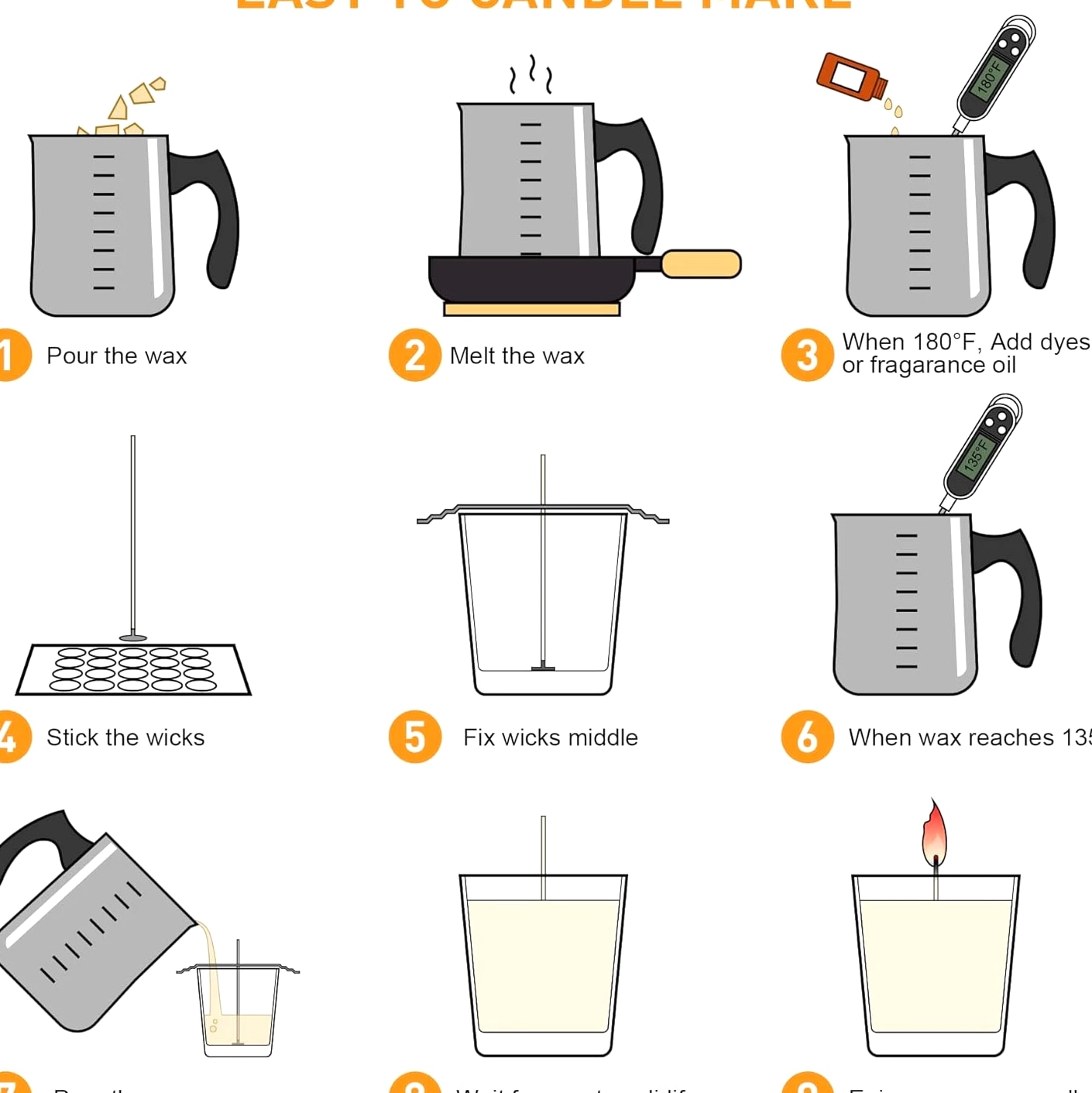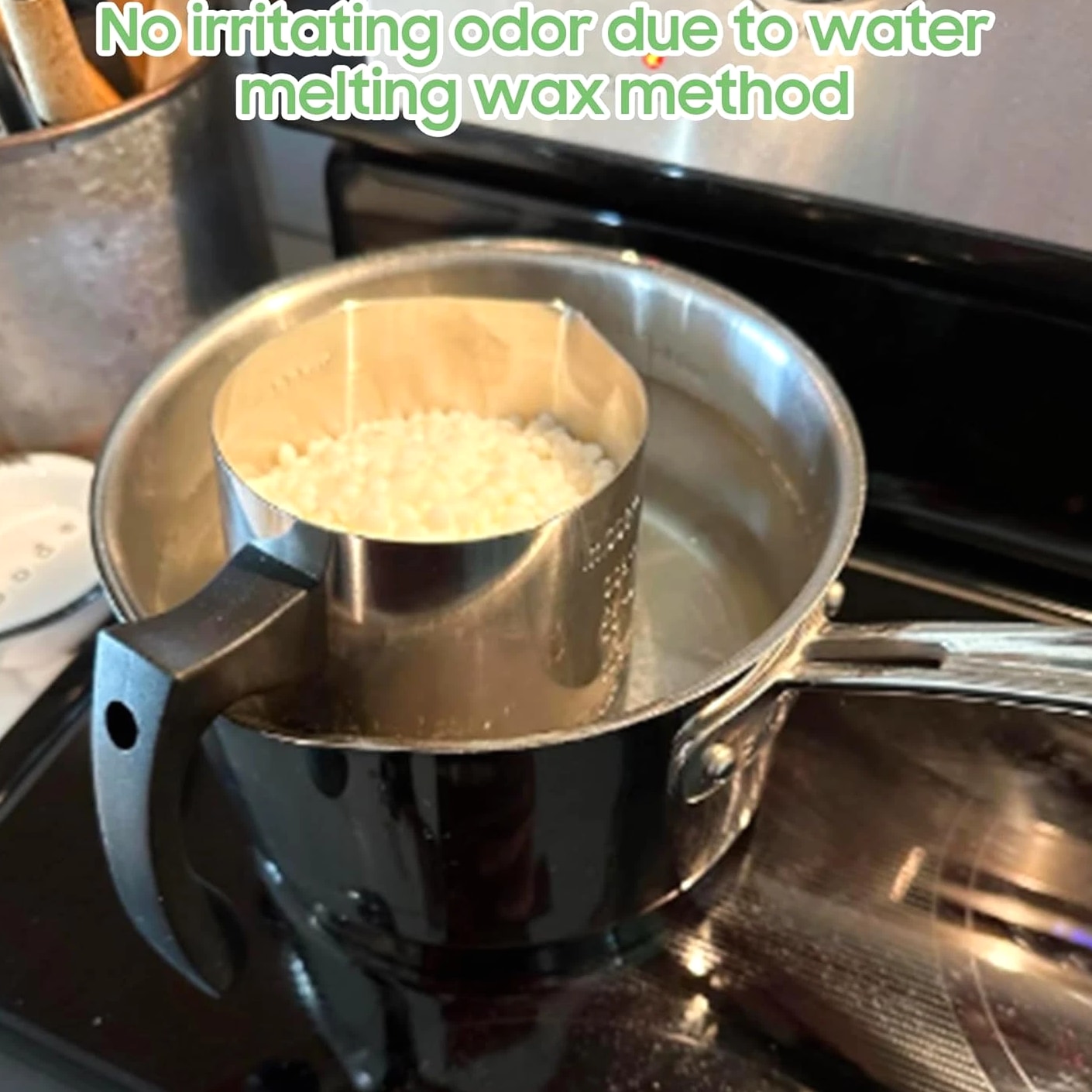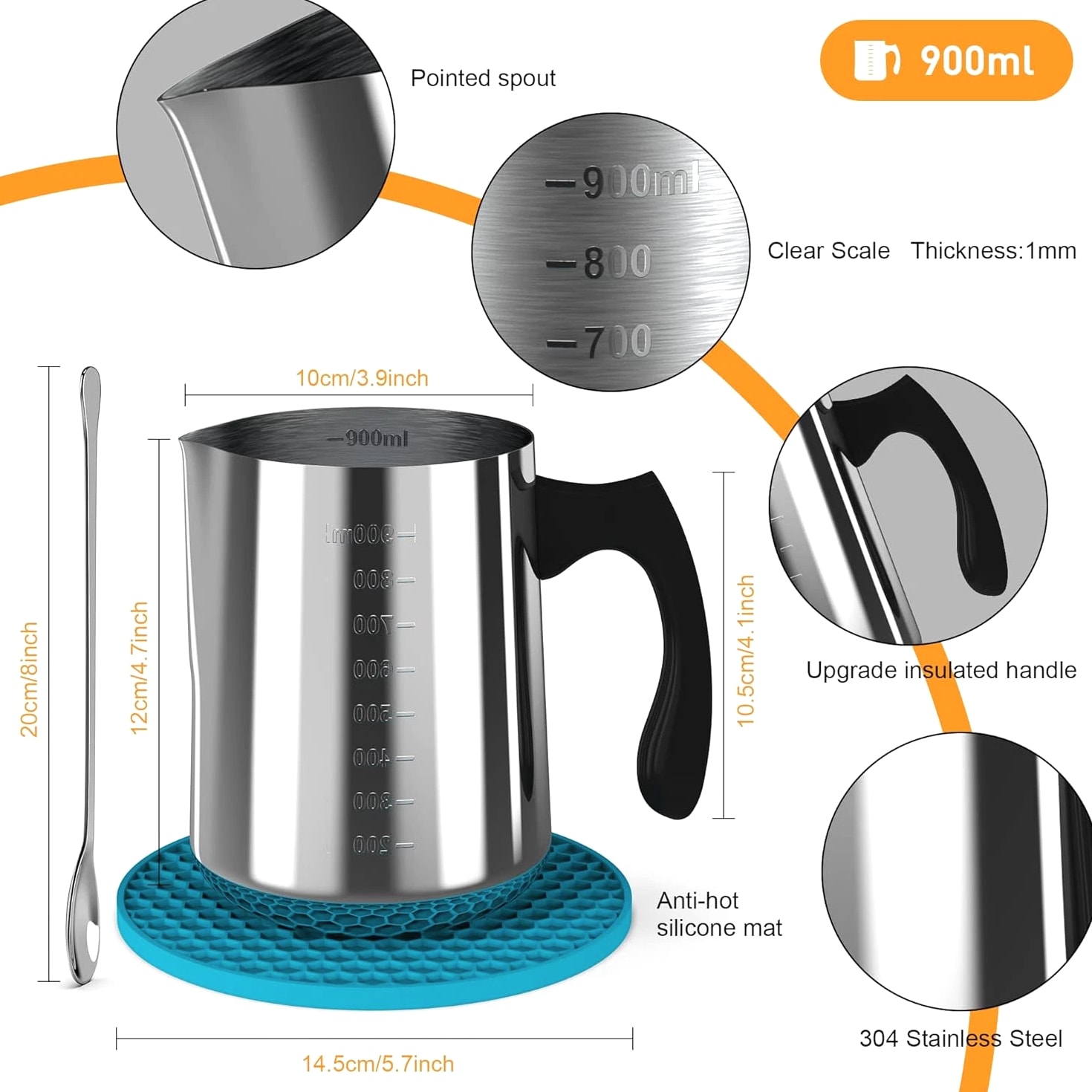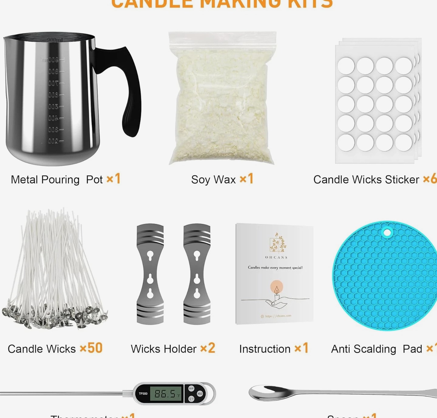【Upgraded Candle Making Kit】900ml 304 Stainless Steel Candle Pouring Pot x 1, Anti-hot Silicone Mat x1, 12.4oz Soy Candle Wax x1, 5.1'' Candle Wicks x50, Candle Wicks Sticker x60, Stainless Steel Wicks Holder x2, Thermometer x1, Spoon x1, DIY Candle Making Supply, perfect for beginners. (Suggested candle container diameter is 1.9-2.4 inches) 【Large Capacity Candle Pouring Pot】Our Candle Kits feature a large capacity candle pouring pot: 900ml candle melting pot and spoon crafted from 304 stainless steel, offering strong rust resistance and high temperature/corrosion resistance. Scales marked inside and outside the pot allow you to control candle wax amount based on jar size. Food grade standard means it works great for melting butter, chocolate, cheese, candy, caramel, and more. 【Natural Soy Wax And Candle Wicks】12.4oz soy wax for candle making; candle wick measures 5.1 inch in length with 0.5inch/12.5mm diameter base. Wax made from natural soy; candle wicks are 100% cotton. Our soy wax candle making kits for adults burn excellently with no unpleasant odors, non-toxic, free of lead and zinc, completely safe to use. 【Candle Wick Sticker And Wick Holder】White round adhesive sticker dots with double sided foam, measuring 0.7inch in diameter and 1mm thickness. Use together with the wick holder to secure candles firmly in position. Detailed manual included for any questions. 【Easy To Use & Quality Service】Essential items for a better life! Candle making supplies include everything needed, suitable for both beginners and professionals, and makes an excellent gift for loved ones, family and friends. Contact us anytime with questions.