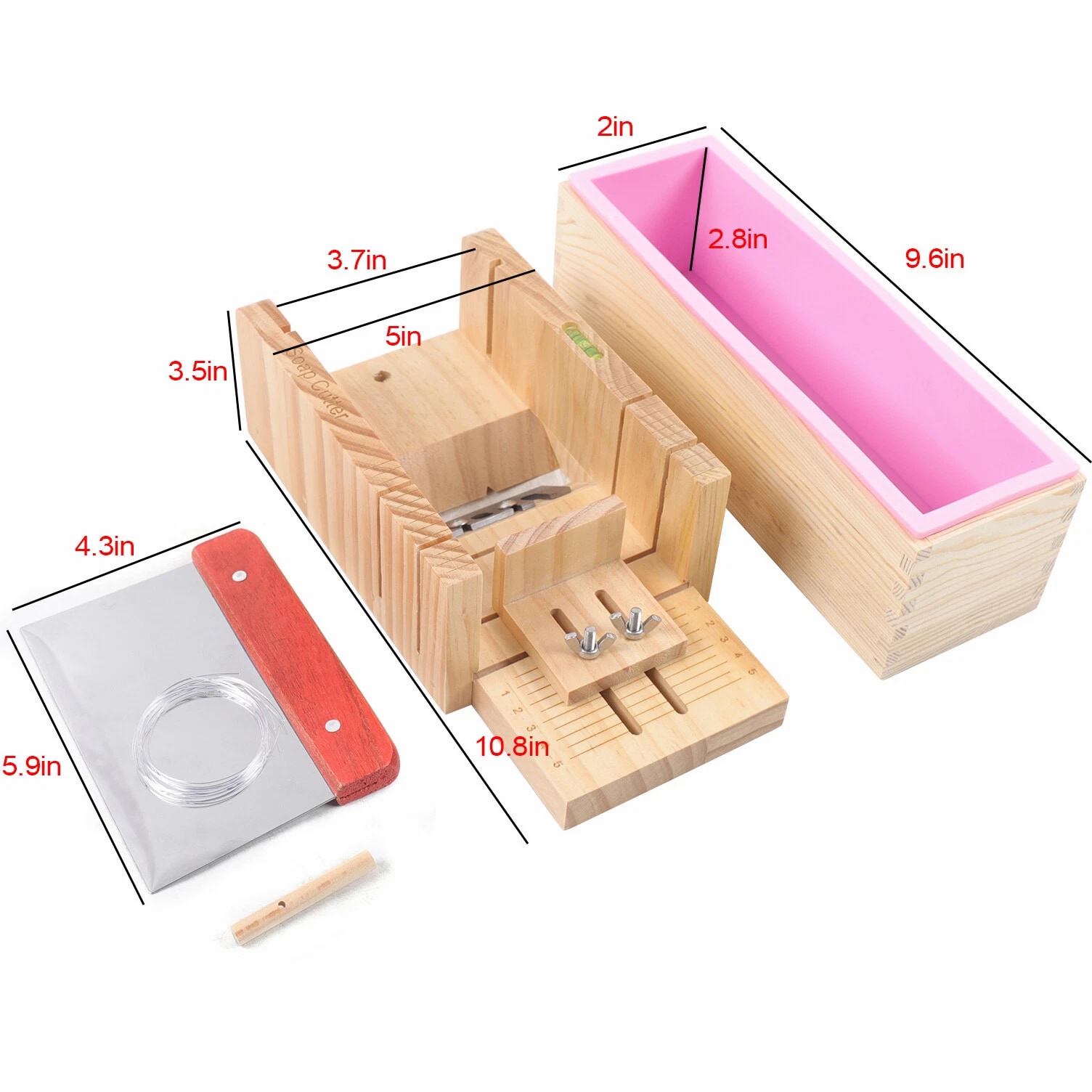 Professional Soap Making Supplies Kit 3 Pcs Set Soap Tools Cakes Mold Handmade DIY The Description of product: 3 Pcs Soap Making Tool Kit Loaf Soap Mould Adjustable Wooden Soap Cutter Slicer Gift Description: Name: Soap cutter set Style: modern and simple Process: grinding, polishing Specification: 3 Pcs set Material: wood+silicone+stainless steel Product Size: Wooden mold box: 9.6"*2"*2.8" Wooden Soap cutter Mold: 10.8"*3.5"*5" Straight knife: 5.9"*4.3" Function: used to make handmade soap candles, cakes, etc. Applicable occasions: holidays, weddings, birthdays, full moons, travel commemorations, graduations, parties, etc. Features: 1. Multifunctional: suitable for cutting soap and candles 2. The surface of the accessories is smooth and easy to clean 3. Adjustable thickness: clear scale reading, you can adjust the thickness of soap, easy to observe during operation, easy to get the correct soap size you need. 4. High quality and easy to clean: made of exquisite solid wood and food grade stainless steel, safe high temperature resistance, corrosion resistance, long service life Tips: When You Start To Make A Soap, You Need To Put The Silicone Mold Into The Wood Box. And Then Pour Liquid Soap Into The Silicone Mold. After The Liquid Soap Is Hardened, You Take Out The Silicone Mold And Remove The Soap. Wire Cutter Should Be Used When The Soap Is Still A Bit Soft. Packing list: 1*Wooden box with silicone container 1*Wooden Soap cutter Mold 1*Straight knife Packing size: 29*17*13cm/11.4"*2.7"*5.2" Package weight: 1.35kg/3lb