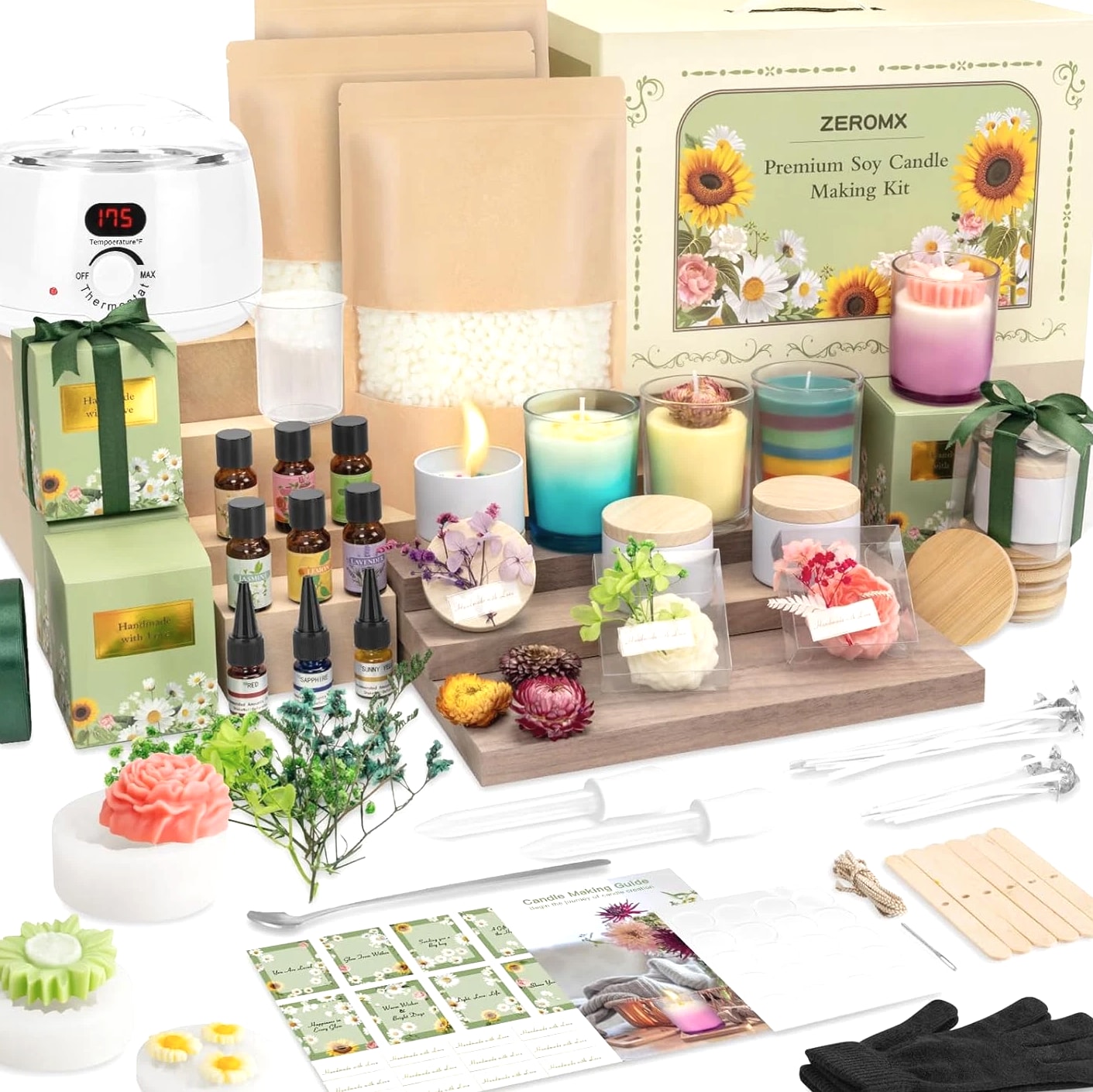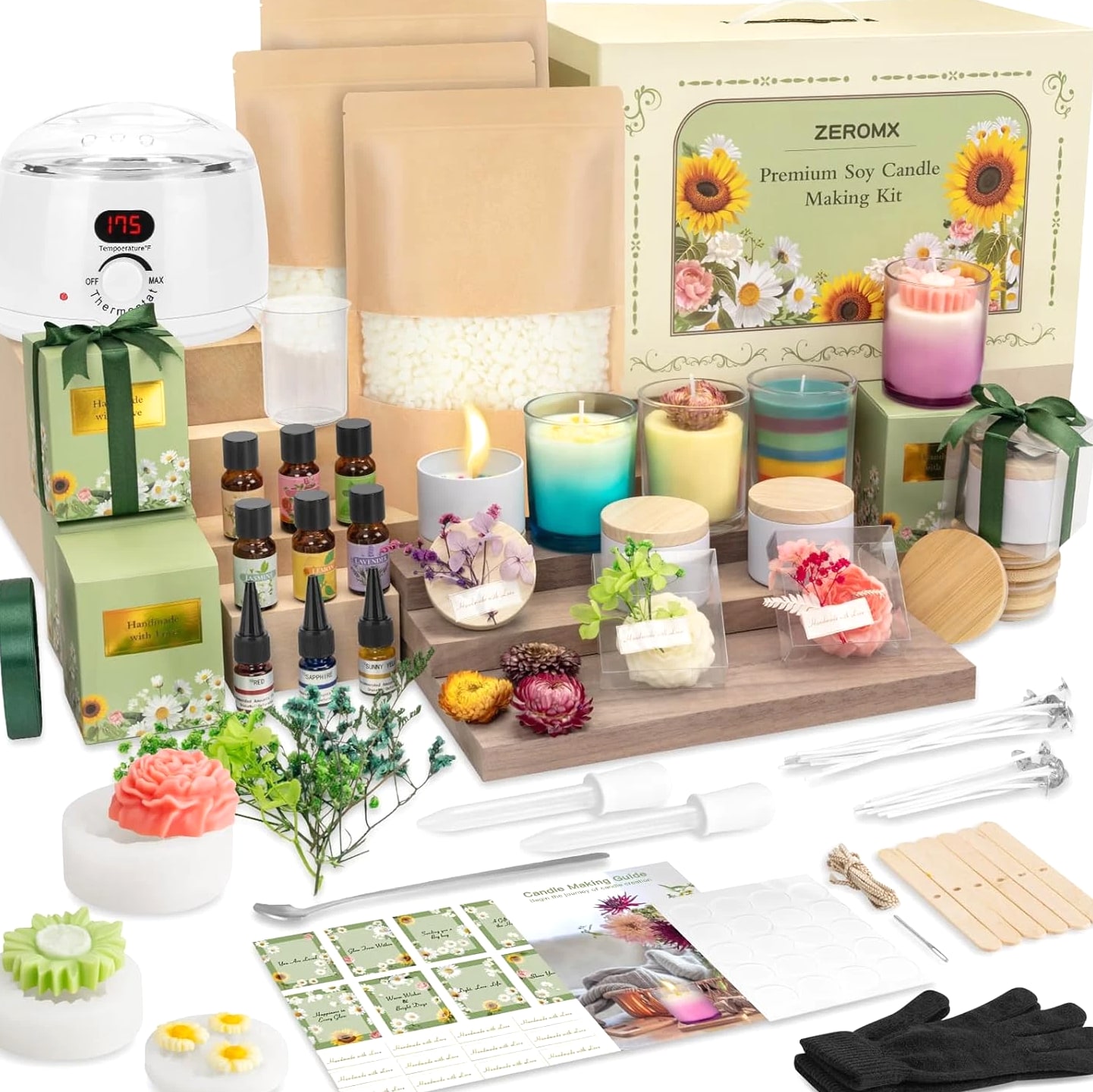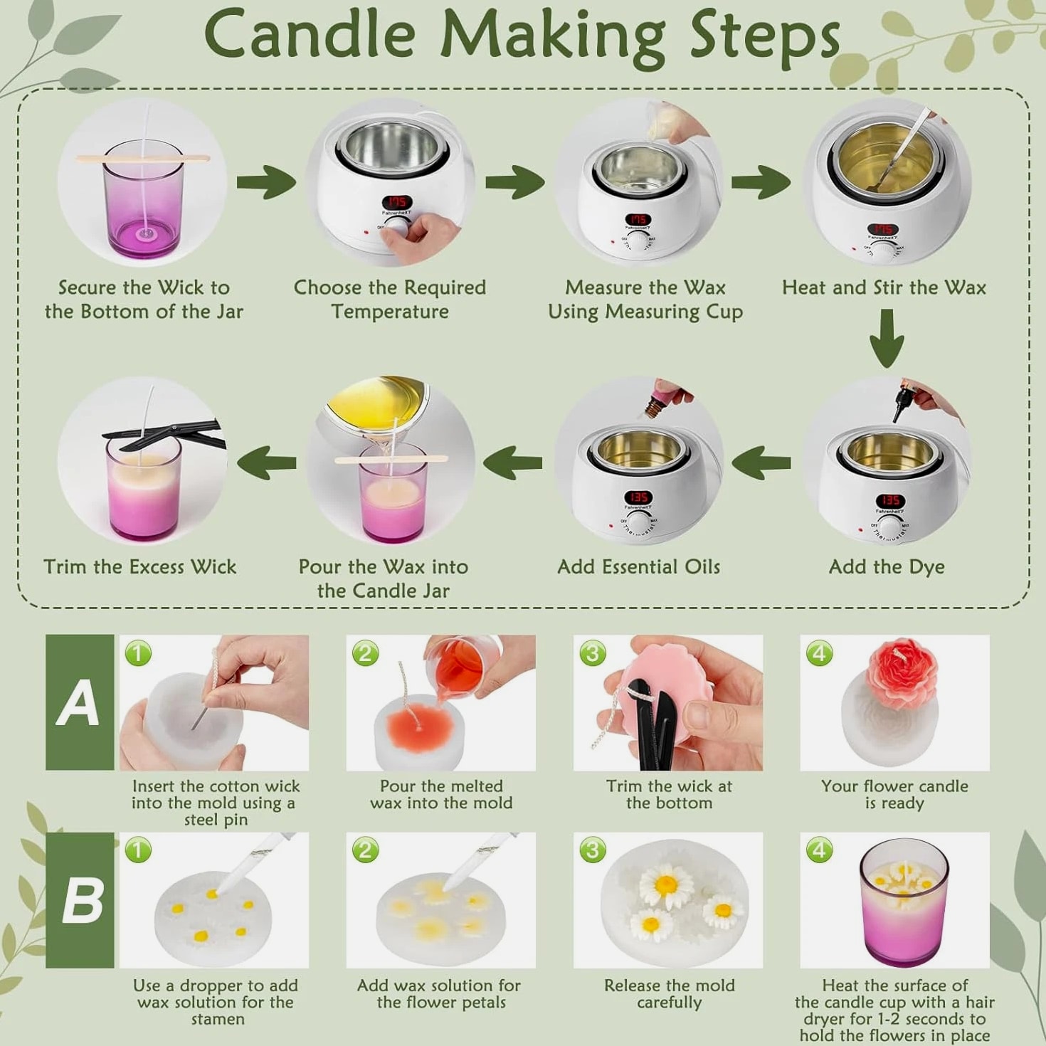 【All-in-One Complete Candle Making Kit】Includes everything needed to start making candles at home: 500ml LED Digital Wax Melting Pot x1, 1200g premium soy wax, 8 candle jars, 3 floral silicone molds, 6 essential oil scents, 12 gift boxes, 20 cotton wicks, 6 wooden wick holders, 3 primary color dyes, 2 anti-scald gloves, 1 stirring spoon, 1 ribbon roll (20m), and dried flowers (color varies). Perfect for both beginners and experienced crafters. 【Upgraded Digital Wax Melting Pot】Our latest electric wax melting pot features a professional-grade LED display and precise temperature control system, allowing you to melt wax at the perfect temperature every time. No need for separate thermometers, stovetops, or complicated equipment—just plug in and start crafting. Designed for both beginners and experienced candle makers. Voltage: US 110-120V (50/60Hz). 【3 Liquid Dyes = Infinite Custom Colors】Unlike solid dye blocks, our liquid candle dyes offer effortless blending to create unlimited color shades. With just red, yellow, and blue, easily mix any custom hue to match your mood or décor. The precision fine-tipped nozzle ensures accurate drop-by-drop control, making color mixing simple, fast, and beginner-friendly. 【3 Floral Candle Molds – Unique DIY Creations】Unlike most kits that only offer jars, our set includes 3 detailed silicone molds: sunflower, peony, and daisy. Easily craft sculpted floral candles that look professional and artistic. These reusable molds add endless creative possibilities, letting your DIY candles stand out as beautiful home décor or unique handmade gifts. 【Perfect DIY Gift Set for Every Occasion & Home Décor】Create beautiful handmade candles perfect for gifting or decorating your home. Use the included elegant packaging to make heartfelt gifts for birthdays, Christmas, Thanksgiving, weddings, or baby showers. Or simply display your finished candles as stunning home décor accents to brighten any room.