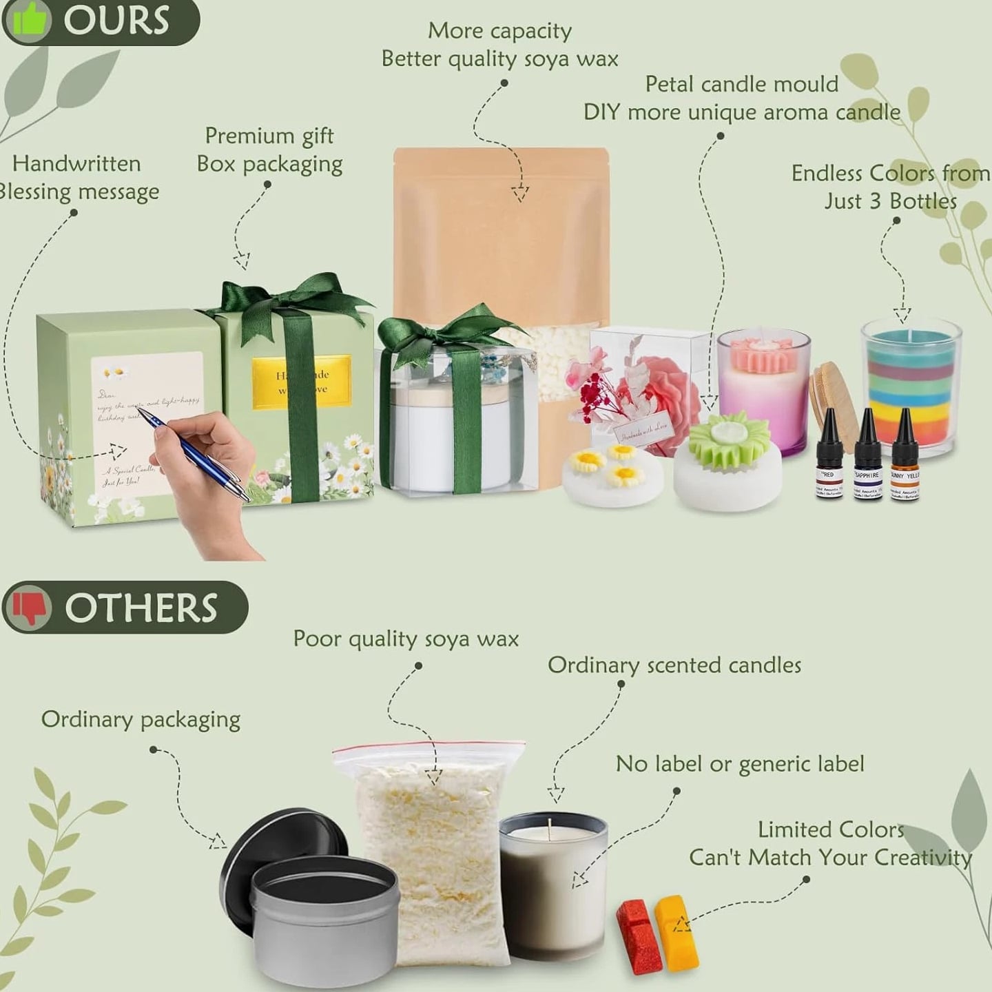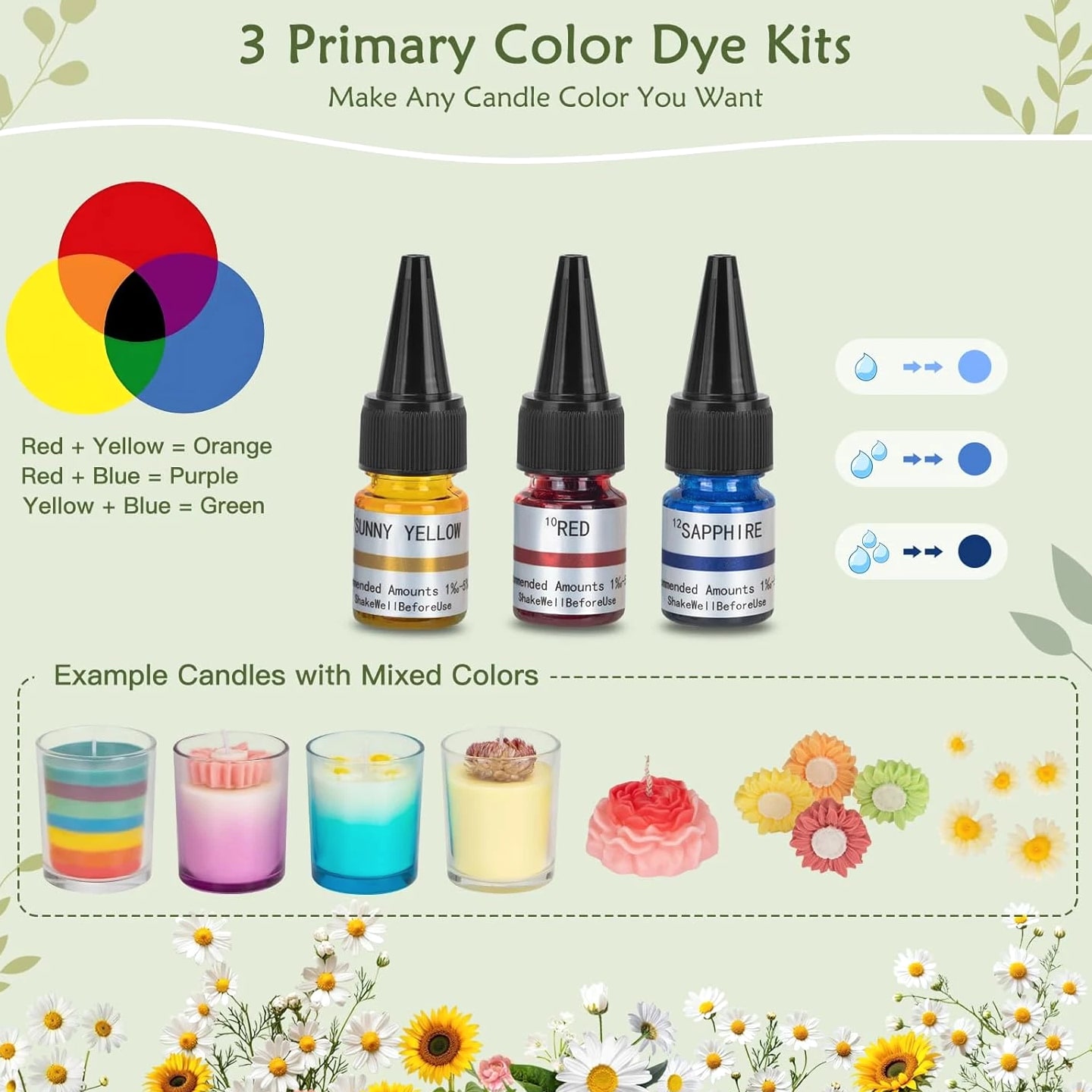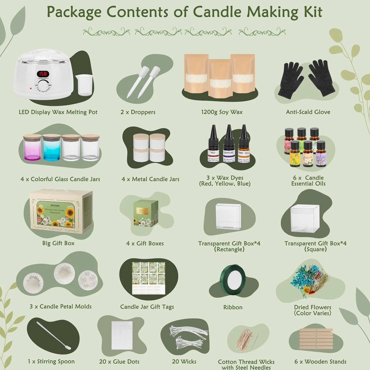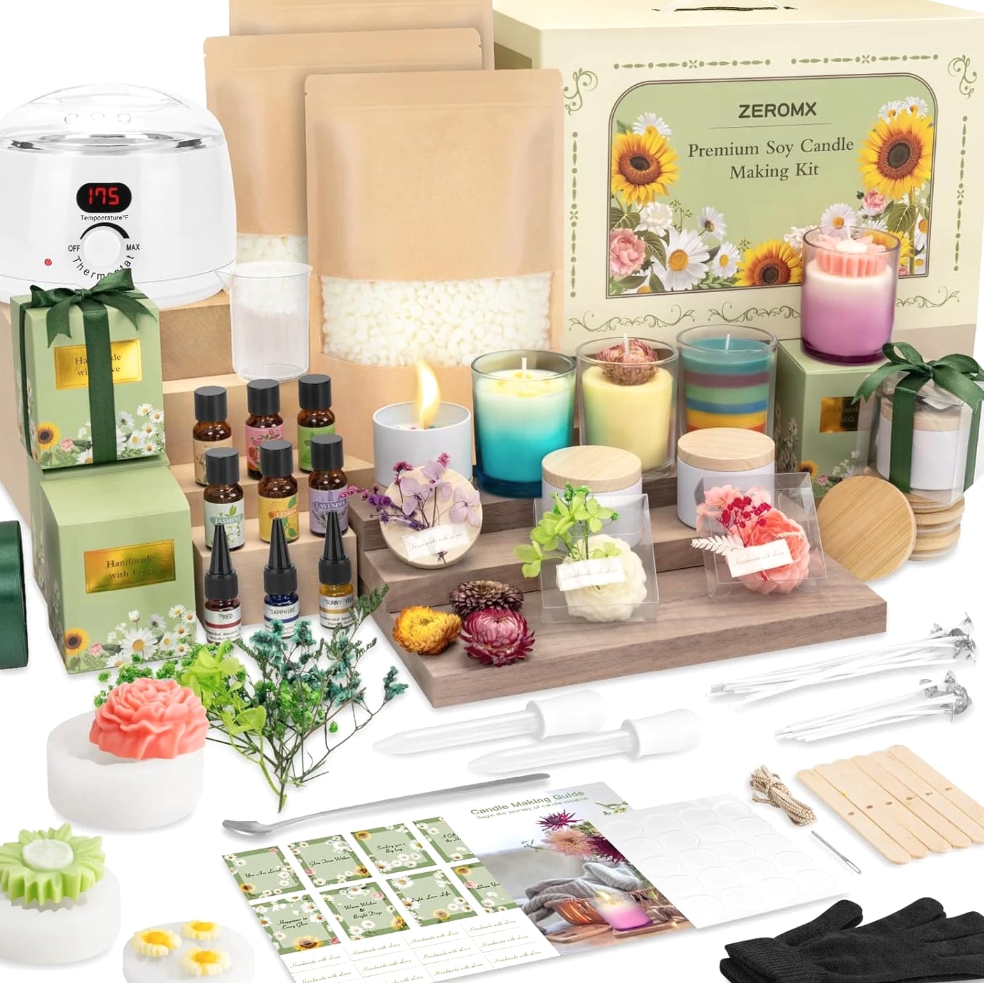 【All-in-One Complete Candle Making Kit】Includes everything needed to start making candles at home: 500ml LED Digital Wax Melting Pot x1, 1200g premium soy wax, 8 candle jars, 3 floral silicone molds, 6 essential oil scents, 12 gift boxes, 20 cotton wicks, 6 wooden wick holders, 3 primary color dyes, 2 anti-scald gloves, 1 stirring spoon, 1 ribbon roll (20m), and dried flowers (color varies). Perfect for both beginners and experienced crafters. 【Upgraded Digital Wax Melting Pot】Our latest electric wax melting pot features a professional-grade LED display and precise temperature control system, allowing you to melt wax at the perfect temperature every time. No need for separate thermometers, stovetops, or complicated equipment—just plug in and start crafting. Designed for both beginners and experienced candle makers. Voltage: US 110-120V (50/60Hz). 【3 Liquid Dyes = Infinite Custom Colors】Unlike solid dye blocks, our liquid candle dyes offer effortless blending to create unlimited color shades. With just red, yellow, and blue, easily mix any custom hue to match your mood or décor. The precision fine-tipped nozzle ensures accurate drop-by-drop control, making color mixing simple, fast, and beginner-friendly. 【3 Floral Candle Molds – Unique DIY Creations】Unlike most kits that only offer jars, our set includes 3 detailed silicone molds: sunflower, peony, and daisy. Easily craft sculpted floral candles that look professional and artistic. These reusable molds add endless creative possibilities, letting your DIY candles stand out as beautiful home décor or unique handmade gifts. 【Perfect DIY Gift Set for Every Occasion & Home Décor】Create beautiful handmade candles perfect for gifting or decorating your home. Use the included elegant packaging to make heartfelt gifts for birthdays, Christmas, Thanksgiving, weddings, or baby showers. Or simply display your finished candles as stunning home décor accents to brighten any room.