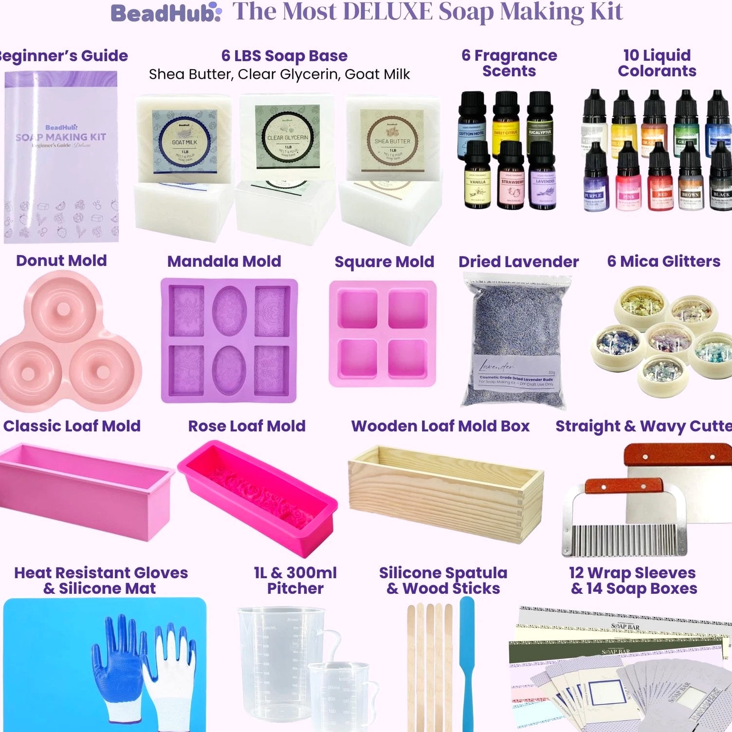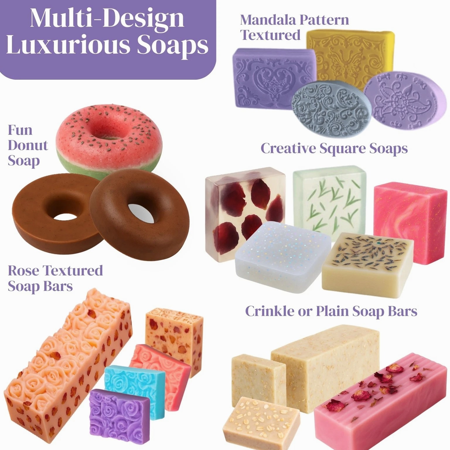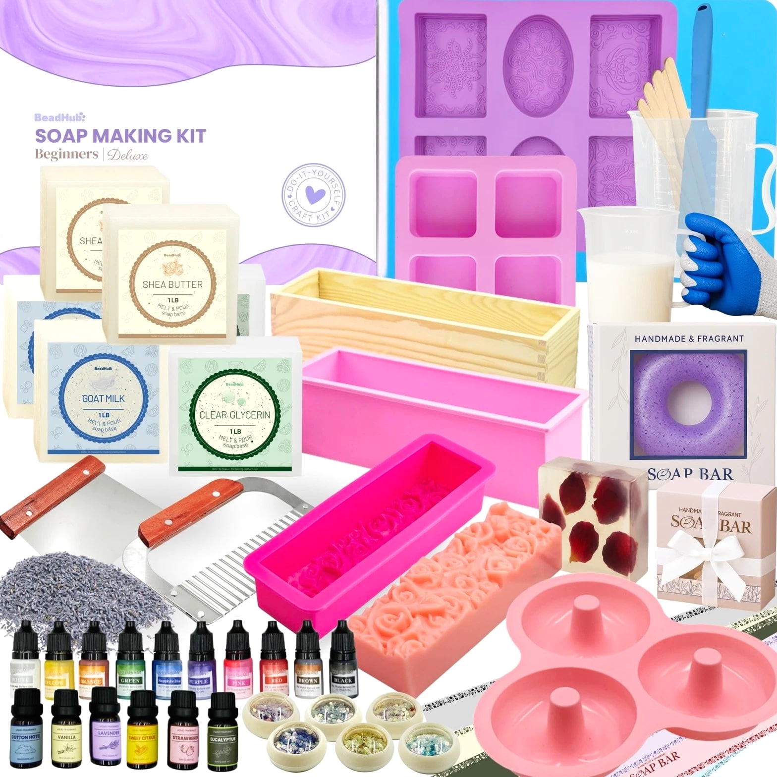 Discover how fun and easy it is to make soap at home step by step with this complete DIY soap making kit. Perfect for beginners, hobbyists, and crafters, it includes all the supplies you need to make soap—from molds and fragrances to colors and decorative items—so you can start right away. This is the best soap making kit for beginners who want to explore the art of creating their own soaps. Designed as a soap making starter kit with molds and colors, it uses the popular melt and pour method, making it easy and simple even if you have no prior experience. You'll learn how to work with glycerin, shea butter, and goat milk soap bases, each offering unique textures and creative possibilities. Looking for easy soap recipes with gentle ingredients? Our kit guides you with clear, step-by-step instructions to craft bars that are both beautiful and useful. Whether you want a new hobby, a relaxing project, or one of the best DIY gifts you can make at home, this kit is ideal. Great for fun craft kits for adults or creative family activities, it's more than just a product—it's an experience. With a generous 6 lbs of soap base included, you'll have plenty of material for multiple projects, endless experimentation, and lasting memories. DELUXE KIT WITH 3 SOAP BASE TYPES; TOTAL OF 6LBS SUPPLY - We generously included 2lbs each of premium quality Melt & Pour soap bases: Shea Butter, Clear Glycerin, and Goat Milk! So you can learn and gain valuable soap making crafting experience with these three top soap base types. Each offers unique textures and benefits for different skin types of gift receivers. You'll certainly have more than enough to practice, perfect, and create dozens of custom soaps. DESIGNED FOR BEGINNERS – NO EXPERIENCE NEEDED! Make premium soaps confidently as our step-by-step instruction manual makes it easy for first-timers to follow along with clear guidance on time frame, temperature level and other important details. The kit also comes with all the supplies and tools needed.