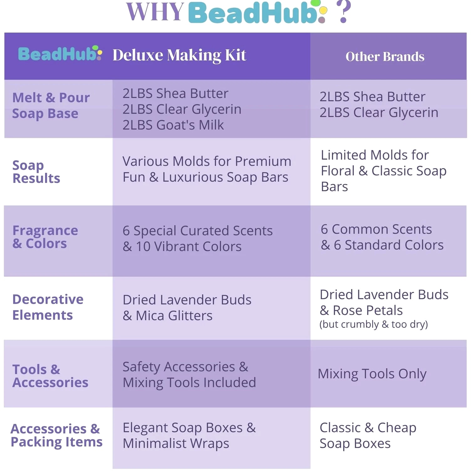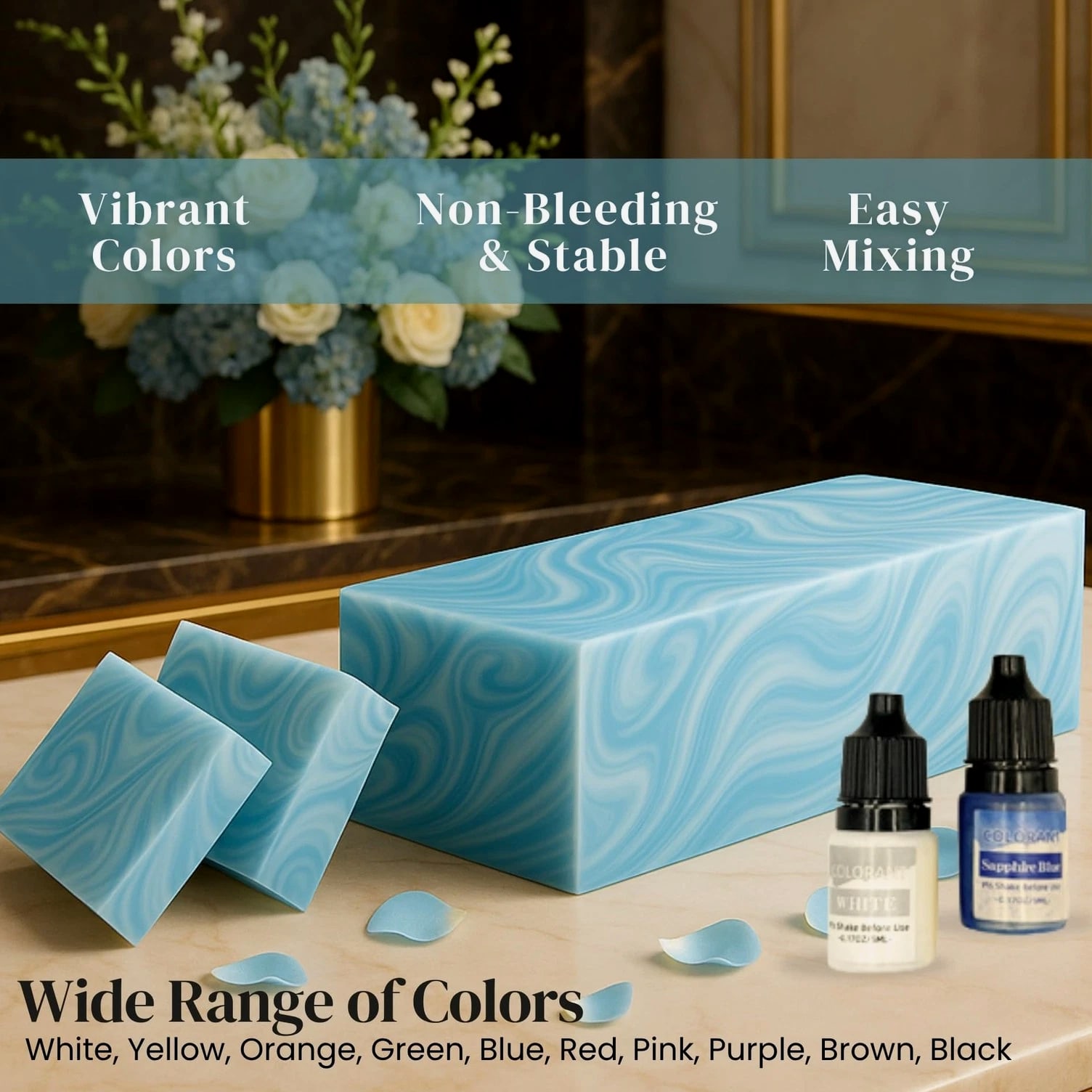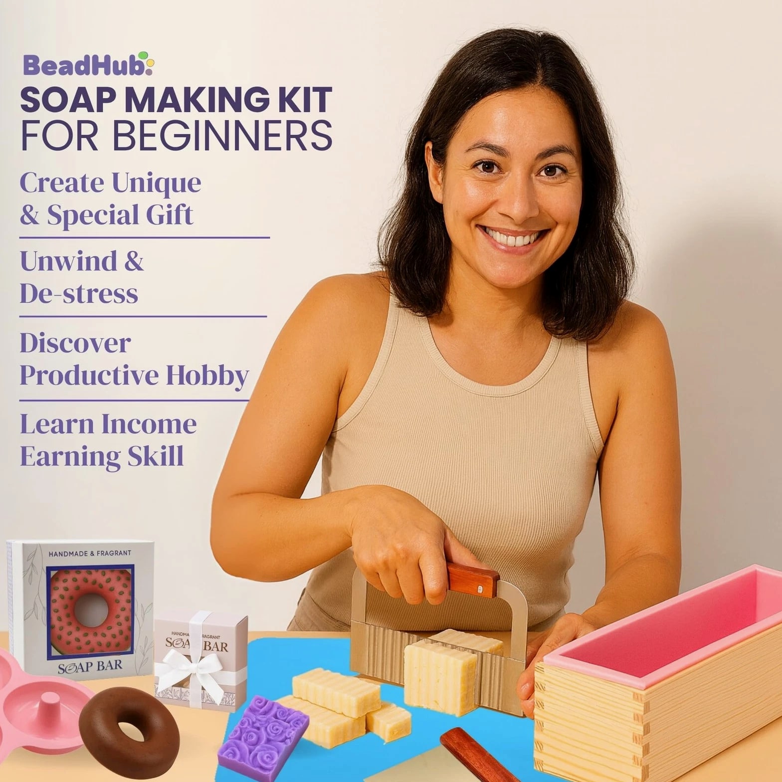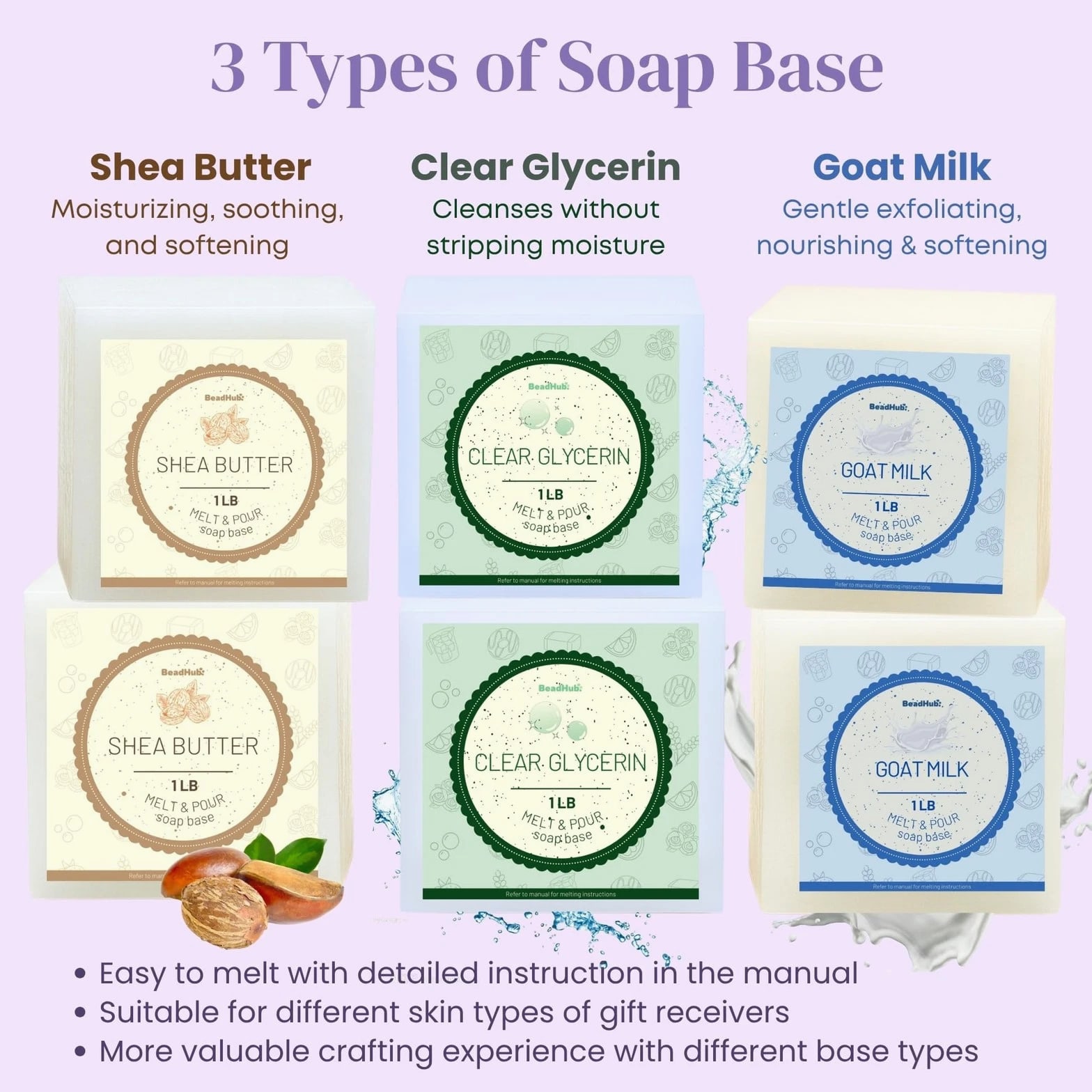 Discover how fun and easy it is to make soap at home step by step with this complete DIY soap making kit. Perfect for beginners, hobbyists, and crafters, it includes all the supplies you need to make soap—from molds and fragrances to colors and decorative items—so you can start right away. This is the best soap making kit for beginners who want to explore the art of creating their own soaps. Designed as a soap making starter kit with molds and colors, it uses the popular melt and pour method, making it easy and simple even if you have no prior experience. You'll learn how to work with glycerin, shea butter, and goat milk soap bases, each offering unique textures and creative possibilities. Looking for easy soap recipes with gentle ingredients? Our kit guides you with clear, step-by-step instructions to craft bars that are both beautiful and useful. Whether you want a new hobby, a relaxing project, or one of the best DIY gifts you can make at home, this kit is ideal. Great for fun craft kits for adults or creative family activities, it's more than just a product—it's an experience. With a generous 6 lbs of soap base included, you'll have plenty of material for multiple projects, endless experimentation, and lasting memories. DELUXE KIT WITH 3 SOAP BASE TYPES; TOTAL OF 6LBS SUPPLY - We generously included 2lbs each of premium quality Melt & Pour soap bases: Shea Butter, Clear Glycerin, and Goat Milk! So you can learn and gain valuable soap making crafting experience with these three top soap base types. Each offers unique textures and benefits for different skin types of gift receivers. You'll certainly have more than enough to practice, perfect, and create dozens of custom soaps. DESIGNED FOR BEGINNERS – NO EXPERIENCE NEEDED! Make premium soaps confidently as our step-by-step instruction manual makes it easy for first-timers to follow along with clear guidance on time frame, temperature level and other important details. The kit also comes with all the supplies and tools needed.