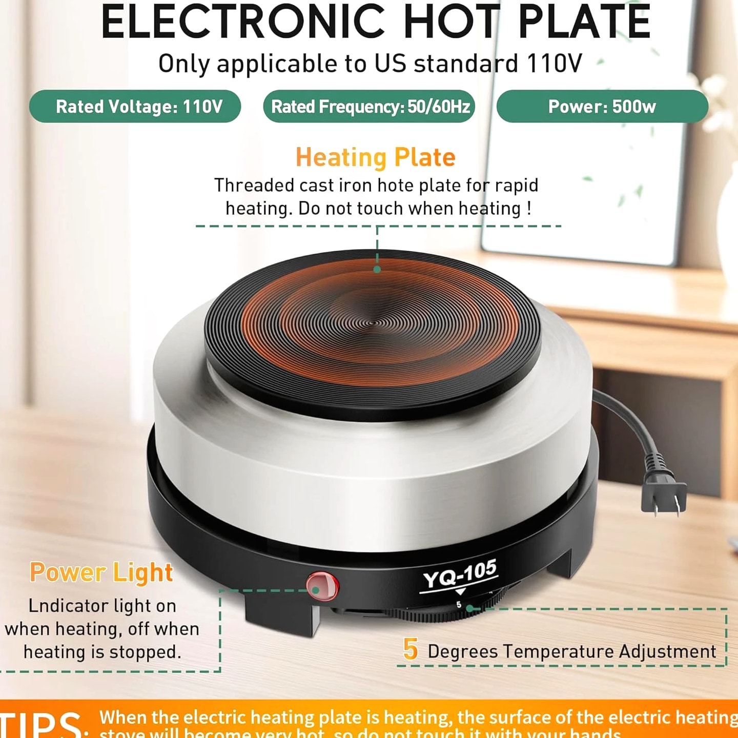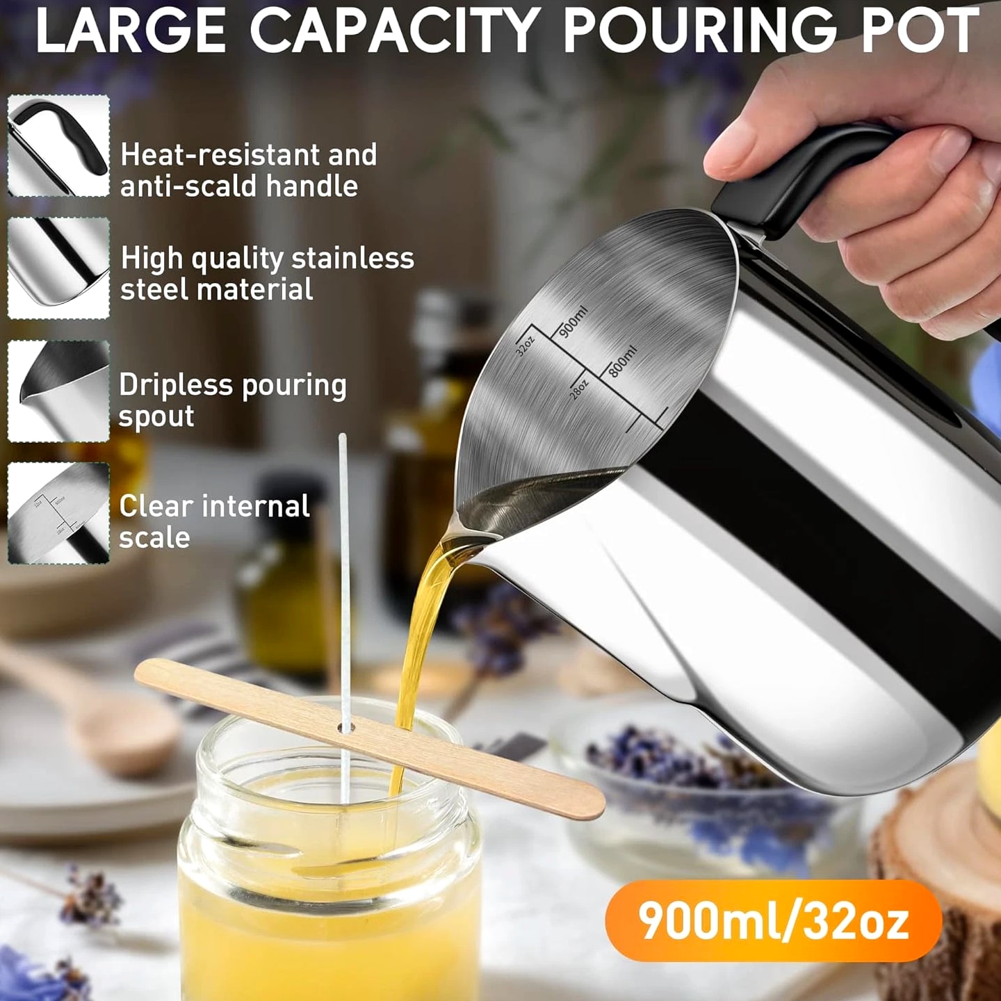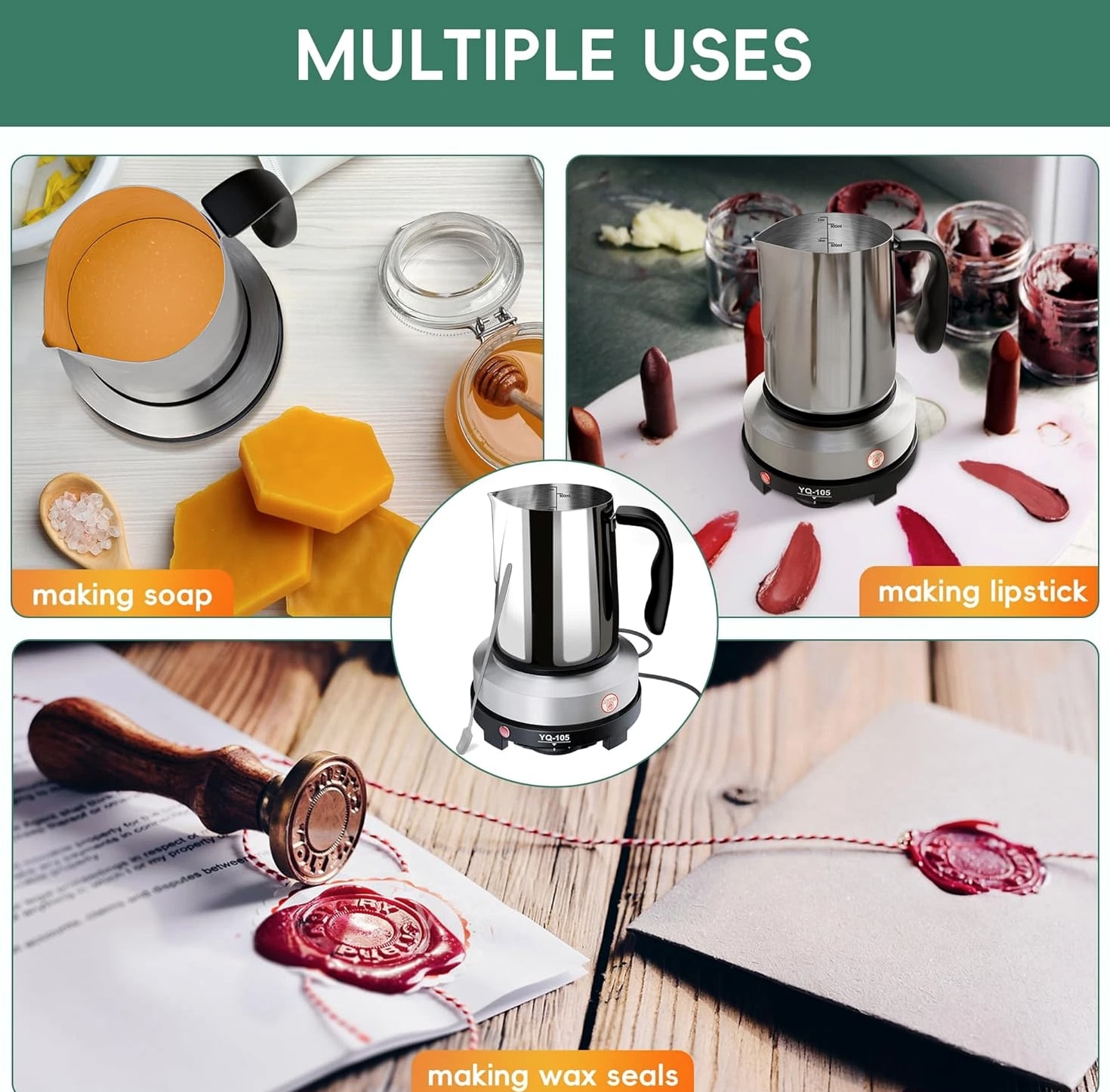 Notice: When heating, do not touch the entire surface of the heating plate to avoid burns. Instead, place your hand on the top of the electric stove to feel the temperature. When the electric furnace is not in use, adjust the switch to 0, and store it after the temperature dissipates. Candle Making Kit with Hot Plate: We provide a variety of accessories to assist beginners in making perfect candles, including 1 x 900ml Stainless Steel Wax Melting Pot, 1 x 500W Hot Plate, 1 x Anti-Scald Pads, 1 x Stirring Spoon, 10 x wooden candle wick holders, 20 x Candle Wicks, 20 x Wick Stickers. Candle Making Supplies: The candle making pouring pot has a large capacity of 900ml/32oz. The handle is anti-scald to ensure the safety of use. The internal laser scale makes it easy to precisely control the amount of wax used. This melting wax pot and stirring spoon is made of high quality stainless steel, with anti-rust, high temperature resistance, which is easy to clean. There is no dripping at the pouring mouth, which controls the flow and prevents leakage. Electric Hot Plate: This hot plate for candle making is constant temperature heating, safer and more convenient for users. 1-5 gears, each gear has a temperature setting value; only 2-3 gears of temperature are needed to melt the candles (it is recommended not to exceed level 3 to prevent the wax from overheating). The electric heating plate only supports the American standard 110V voltage. Multiple Uses: Candle making hot plate can not only melt the wax to make candles but also make soap, lipstick, etc. The candle making kit is suitable for beginners and experienced candle makers alike. This wax melter for candle making is small and easy to carry, suitable for camping trips, dormitories and offices, easier and more convenient to operate. Tips: The heat-resistant temperature of the anti-scalding mat is below 80℃/176℉. Do not put the wax melting pot on top when the bottom temperature is too high. You can let it cool on the hot plate for a while.