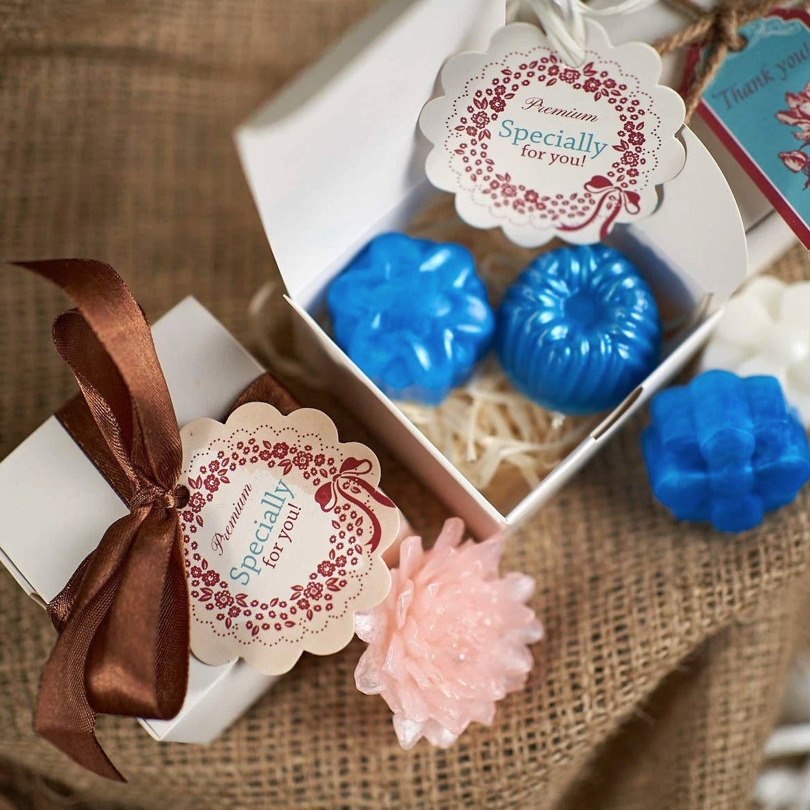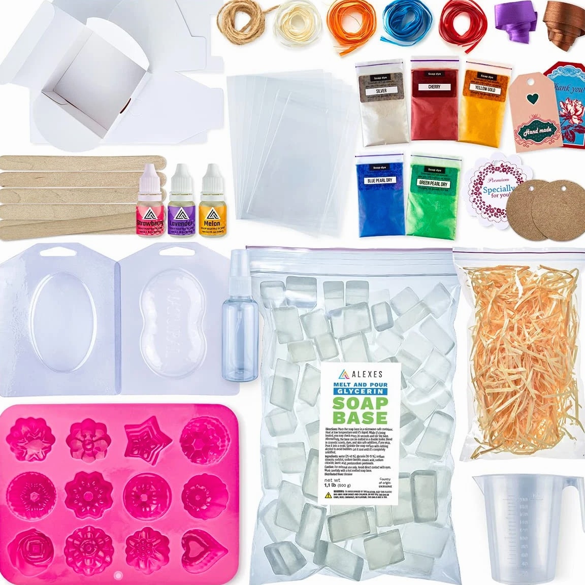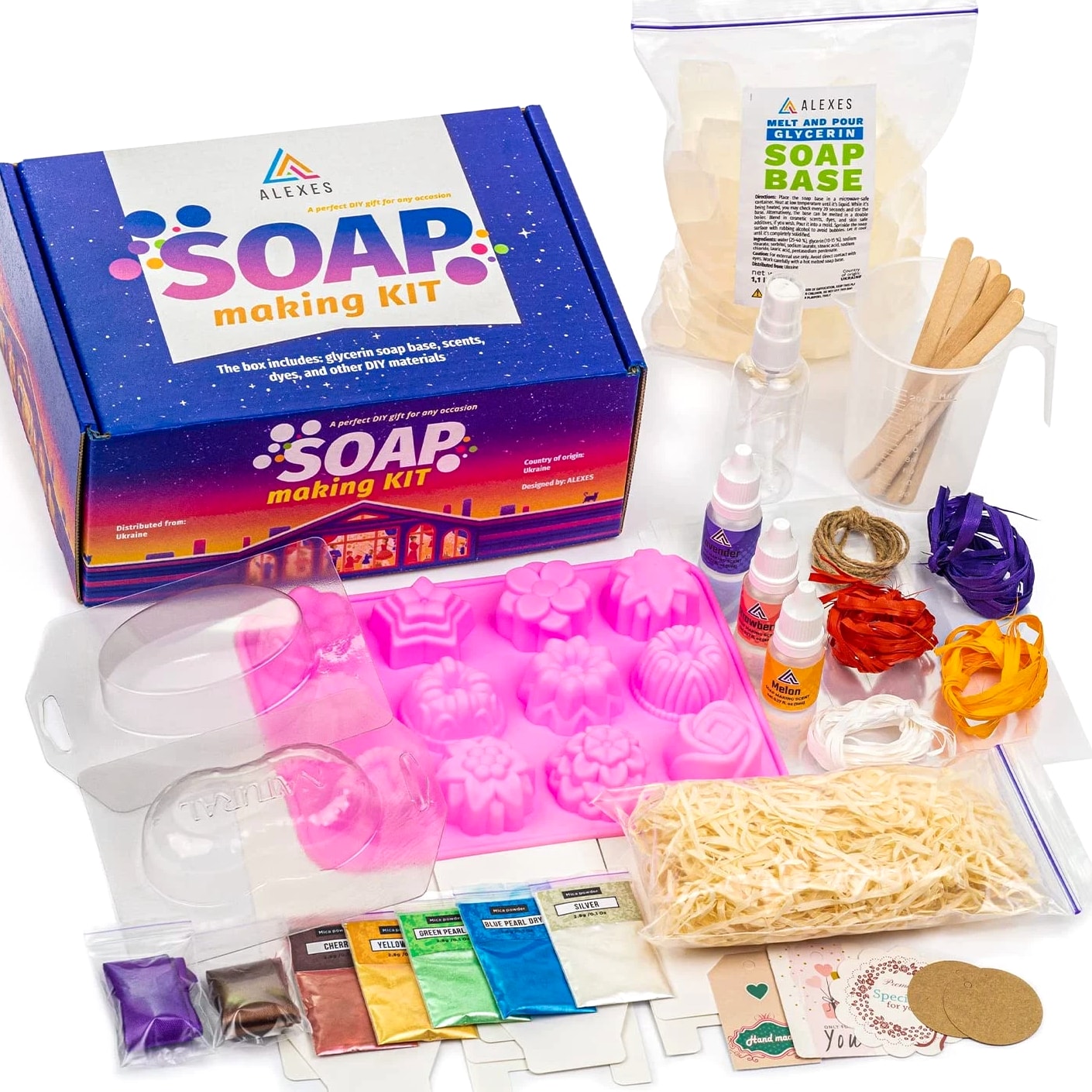 Our Soap Making Supplies Kit includes: Mica powder: 5 colors (cherry, green pearl dry, yellow gold, blue pearl dry, silver) 0.1 oz each Fragrance oils: 3 scents (lavender, strawberry, melon) in vials of 0.17 oz each Glycerin soap base: 1.1 lb (500 g) Measuring cup Silicone mold: 1 pc (with 12 cavities) Plastic mold: 2 pcs Spray bottle (rubbing alcohol not included) Mixing wood sticks: 6 pcs Self-adhesive plastic bags: 2 pcs Packages: 5 pcs Packing tape (Satin ribbon: 6.6 feet, raffia: 13 feet, jute rope: 3.3 feet) Gift tags: 5 pcs Wood filler: 0.35 oz Cardboard boxes: 2 pcs. User guide Bonus: simple instructions on soap decoration This homemade melt and pour soap kit will be a fantastic gift for beginning and skilled crafters. A variety of decoration materials—packages, boxes, gift tags and tapes—will help you dress your soap bar in fancy apparel to turn your homemade soap into exclusive gifts for your friends and family. Enjoy your hobby and develop your skills with our complete soap making kit! Soap Making Kit for Adults: This DIY kit is a find for beginners because it includes detailed illustrated instruction on how to make homemade soap. DIY Glycerin Soap Kit: This wonderful soap making starter kit includes glycerin melt and pour soap base in the quantity according to the calculated dosage to be used with molds from this kit. Soap Making Gift Kit Contents: 1.1 lb glycerin soap base, mica powder, fragrance oils, soap molds for soap making, measuring cup, decoration materials, detailed user's manual Make Your Own Soap: pick a scent and a color from the kit to make soap according to your taste and ideas, use materials for decoration to finalize your homemade soap and make it even more unique. Perfect Homemade Gift: Master the soap-making process with our easy-to-follow instruction. You can even start a business! A homemade soap bar can become a great gift to your dear ones on any occasion.