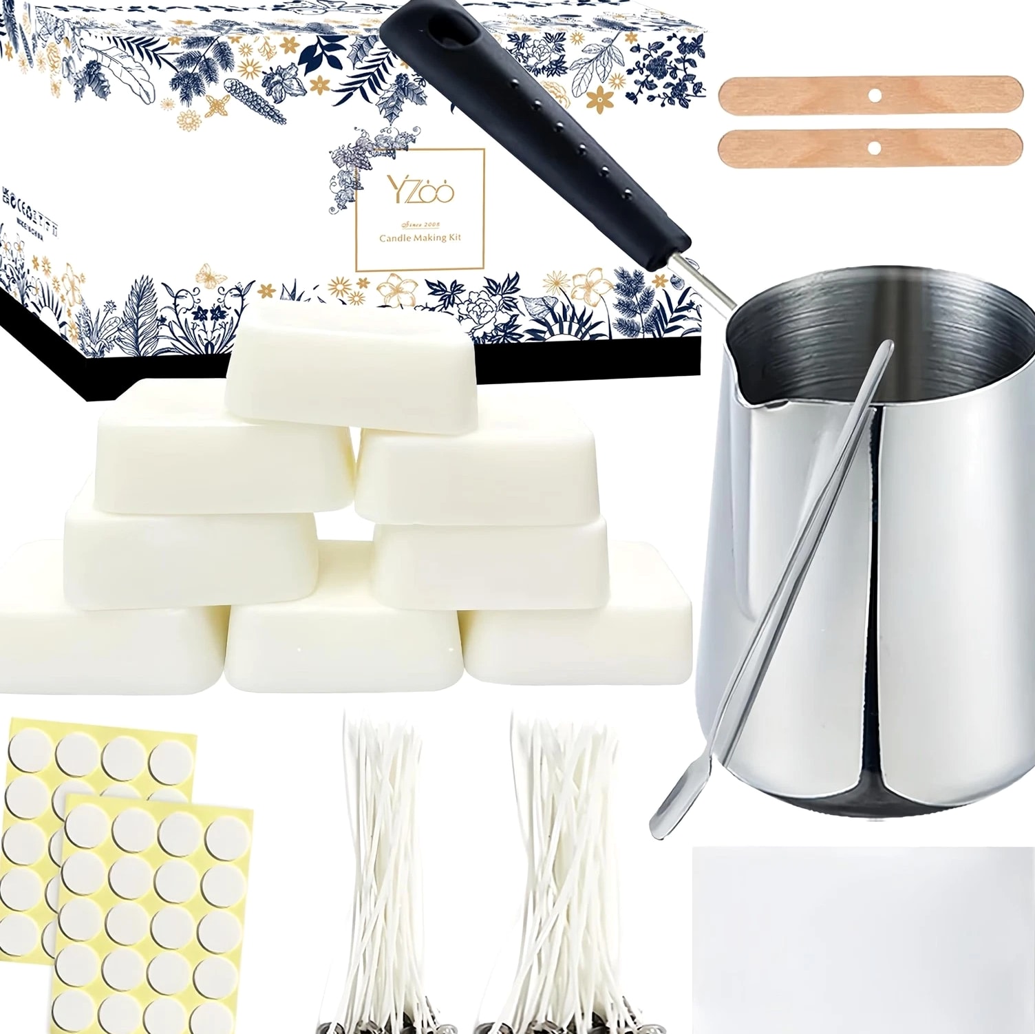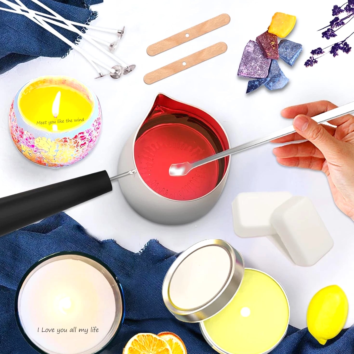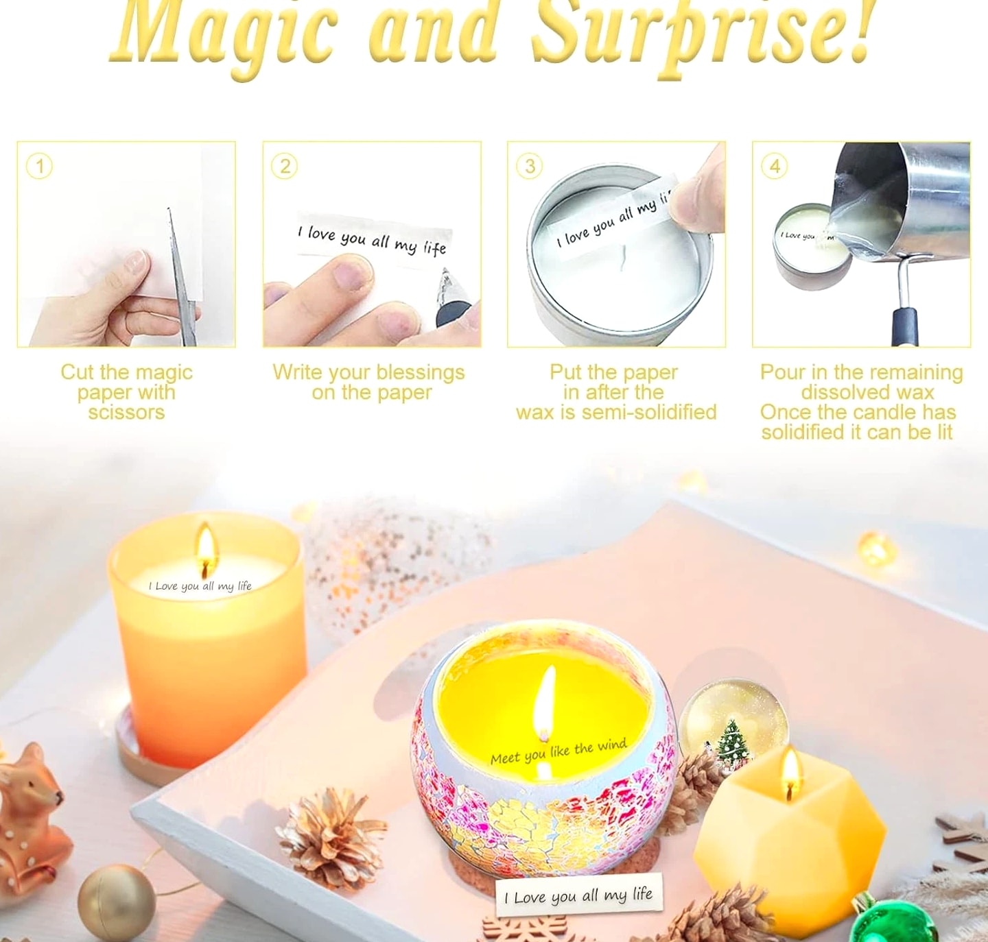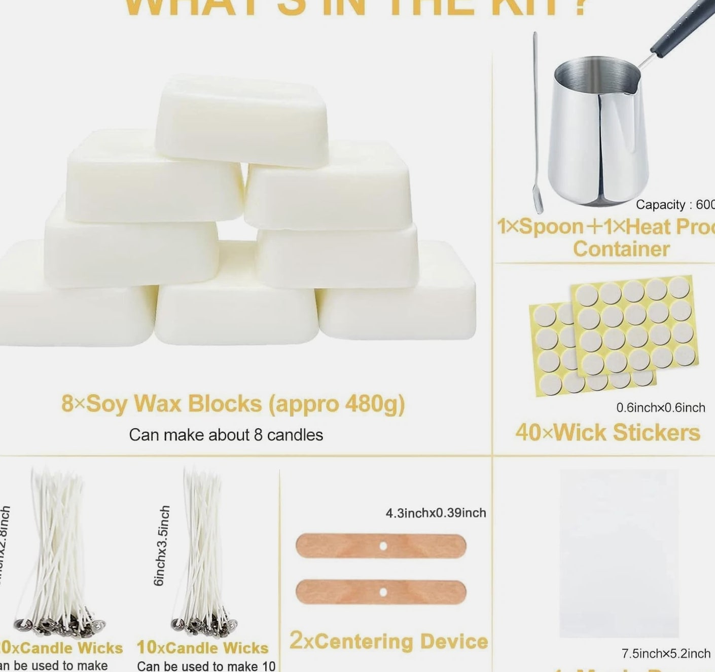 Candle Making Kit for Adults Beginners, Medium Candle, Multi-Color Product Details Complete DIY Candle Making Kit: Includes 480g soy wax (8 blocks of soy wax, 1 block approximately 60g = 1 jar of candle), 600ML candle making melting pot, a 304 stainless steel spoon, 30 pre-waxed candle wicks (10 can be used to make much bigger candles), 40 candle wick stickers, 2 candle wicks holder and magic paper. The full candle making kit allows you to make more candles you like, and the magic paper works perfectly with the lit candles, making the candles you make more creative and thoughtful. Easy to Make, Perfect for Beginners: Whether you are a beginner, a pro or a DIY candle making lover, owning our candle making kit is the first step to successfully making candles. The basic candle making kit for adults beginners is definitely a great choice. You can easily make DIY candles of various shapes. The set includes step-by-step instruction and all necessary soy wax and other accessories for making candles. Come and try this DIY candle making crafting kit to start your journey as a handmade candle designer. Magic Candle Making Kit - Market Exclusive: The most unique and magical candle making kit on the entire market. What's unique is that in addition to the complete kit for making candles, we also have magic paper that shows blessings while the candle is burning! It's definitely an experience you've never had before. Whether you are a beginner or a professional, as long as you like to make candles, add it to your shopping cart, you will be very pleasantly surprised. All-Natural & Superior Quality & Advanced Soy Wax: Made with 100% natural soy wax, and the completed candles will not easily deform or break, allowing for long-time clean burning. Also, sustainable plant-based materials for crafting premium candles that smell better than traditional wax. Even better, our soy wax has an excellent scent throw, making it an ideal choice for scented candles. Try adding fragrance oils to your wax.
