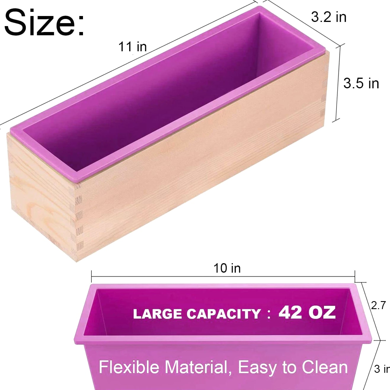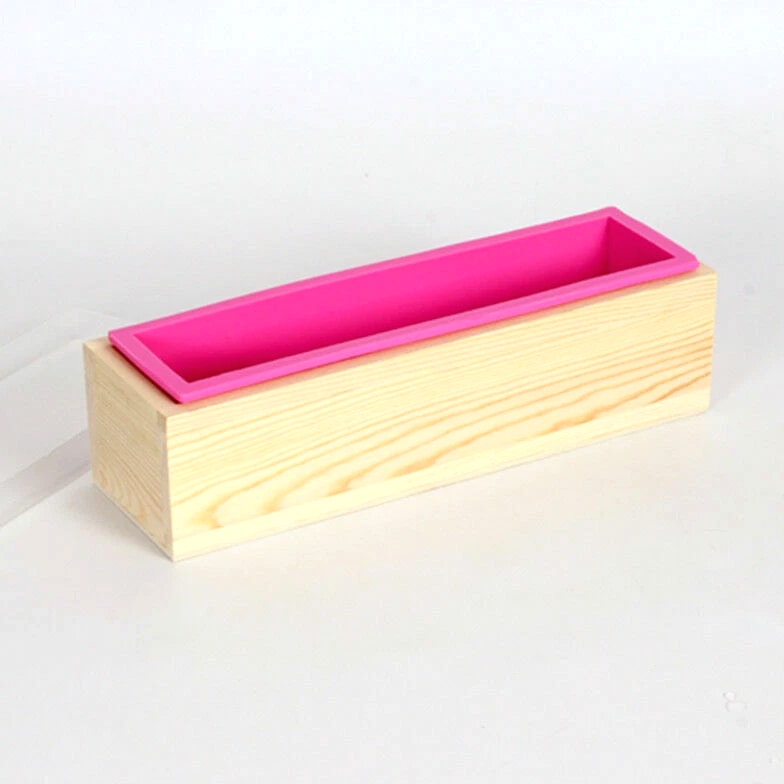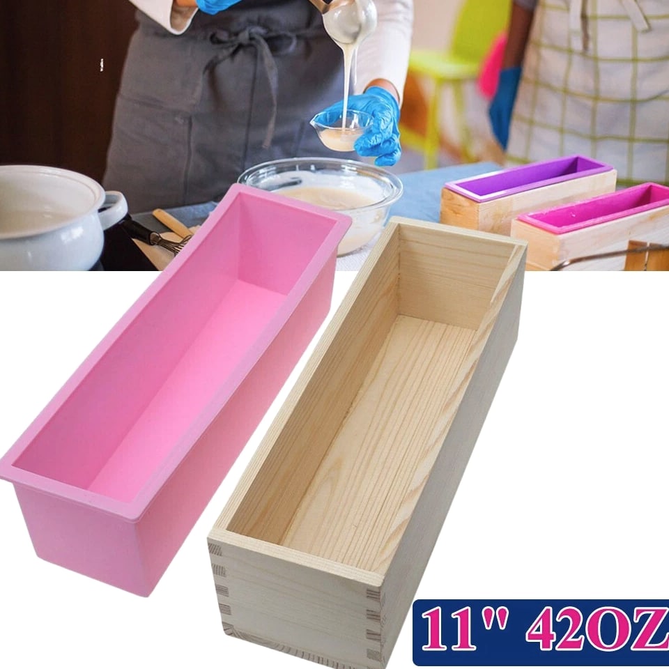 Rectangle Silicone Soap Mold Wooden Box DIY Tools Toast Loaf Baking Cake Molds Key Features Material: Made of high quality silicone mold and wood. Box dimensions (L x W x H): 27.94cm x 8.59cm x 8.59cm. Silicone mold size (L x W x H): 10-1/4"x 2-3/4"x 3". Produces 1.2 kilograms (42 ounces) of soap. Heat resistant temperature -86℉ to +446℉, reusable, innovative design, soft, diverse styles, easy to peel, easy to clean. Suitable for making soap, cake, ice cream, chocolate and more. Description FLEXIBLE RECTANGULAR SOAP SILICONE LOAF MOLD WOOD BOX Included: 1 silicone soap mold and 1 wood box. Made of high quality silicone, which is food grade, heat and cold resistant, flexible but sturdy enough to serve for a long time, easy to clean. Comes with solid wooden box to fix shape - not easy to deform, convenient for fixing and releasing. Heat-resistant temperature of -40 Degrees Celsius to +230 Degrees Celsius, can be reused, innovative design, soft, varied styles, stripping easy, and easy to clean. Designed with rectangular shape, this silicone mold kit provides a special, great and valuable handmade soap as gifts for your friends and family. Such as a present of Valentine's Day, Christmas, Mother's Day and more. EXTENSIVE USE: Used to make soap, baking cakes Specifications Silicone soap mold (L x W x H): 10-1/4"x 2-3/4"x 3" Wood box (L x W x H): 11"x 3-1/2"x 3-3/8" Capacity: 1 kg soap, 2.2 lbs Package Included: 1 silicone mold + 1 wood box.