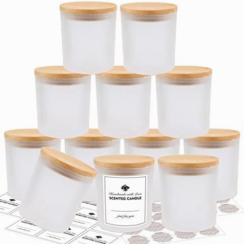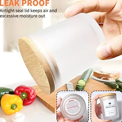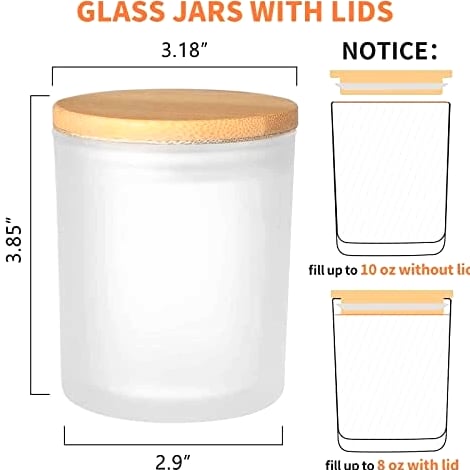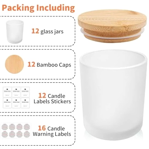 12 Pack Glass Candle Jars - 10 OZ Frosted Empty Containers with Bamboo Lids 【Candle Making Supplies】 12 Pcs empty candle containers, 12 Pcs jars with bamboo lids, 12 candle labels and 16 candle warning labels. 【High Quality & Easy Clean】 These candle containers for making candles are heat-resistant, strong, hard to break, and reusable. The candle making jars are also dishwasher safe and easy to clean by hand. 【Safe Natural Bamboo Material】 Crafted with premium quality thick glass, food grade and lead-free, considerably more durable than ordinary glass. The bamboo lids are made of natural bamboo which is biodegradable and safe to use, not easy to get deformed or break. 【Widely Applicable】 Candle jars with lids suitable not only for candle making but also for storing a variety of food like spices, coffee, jam, dried food, herbs, tea leaves, etc. Can be applied as containers for powders such as salt, sugar, flour. The airtight bamboo lids keep them protected from air exposure. Function as small jars or sample bottles, endless possibilities.
