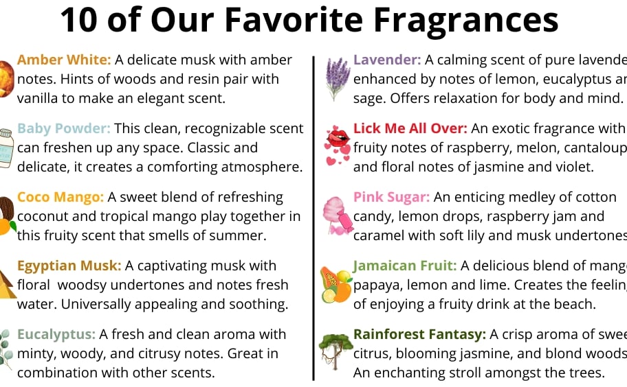 Fragrance Oils 100% Pure Fragrance Oils Premium Quality - Grade A No Alcohol Fragrant Oils Bulk & Wholesale Available Plastic, resealable bottles. Commonly Used for Soaps, Creams, Lotions, Candles, Bath Bombs, Bath Fizz, Wax, Incense, Incense Sticks, Incense Burner, Warmer, Perfume, Bath & Body Oil Amber White, Baby Powder, Bubble Gum, Cherry, Coco Mango, Coconut (White), Egyptian Musk, Eucalyptus, Frankincense, Frankincense and Myrrh, Gardenia, Jamaican Fruit, Lavender, Lick Me All Over, Mango, Nag Champa, Pink Sugar, Pumpkin, Strawberry, Tropical Fantasy, Vanilla, Watermelon. **Packaging may vary from listing image**