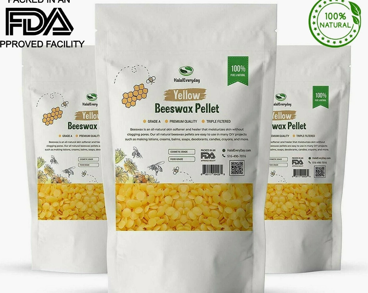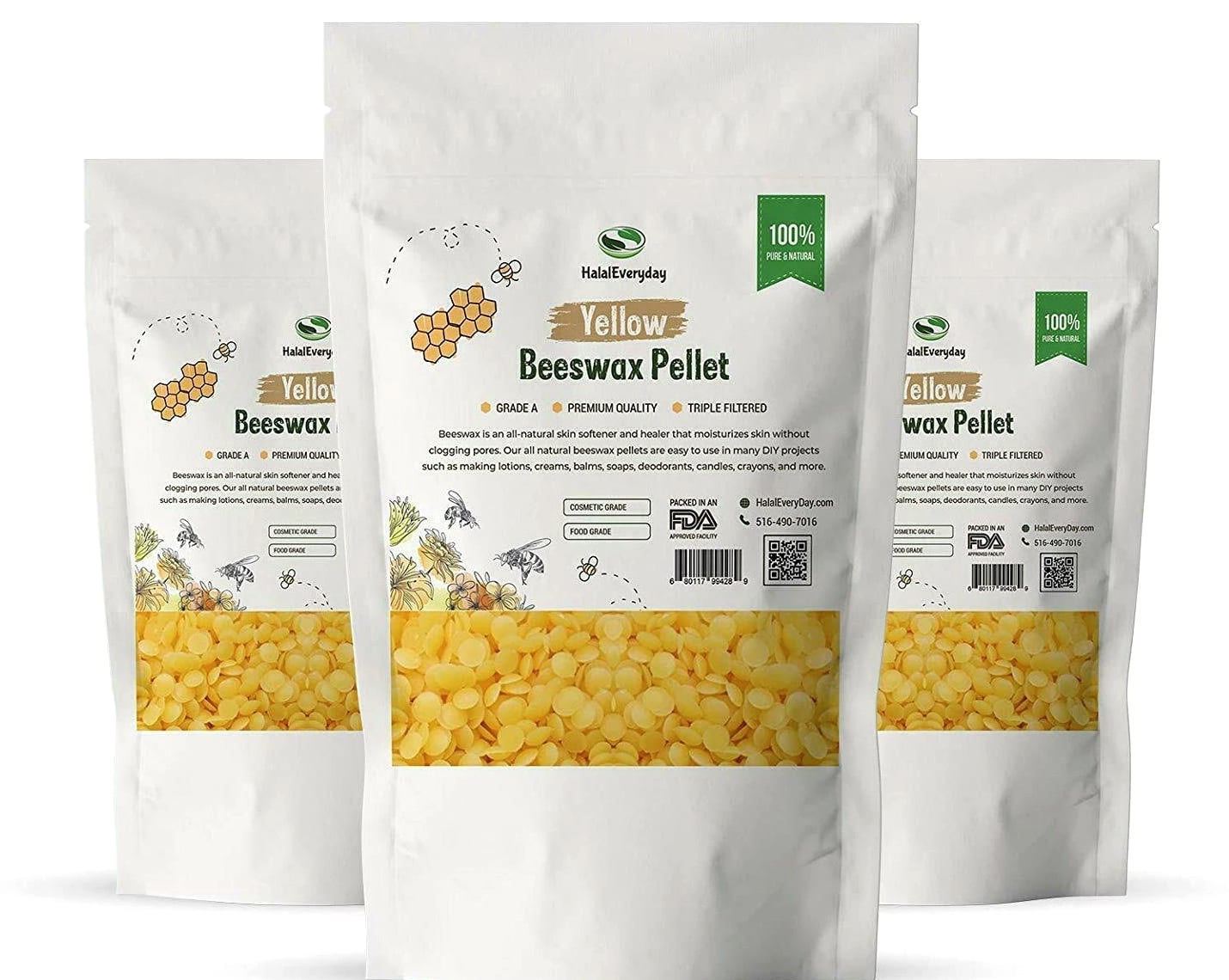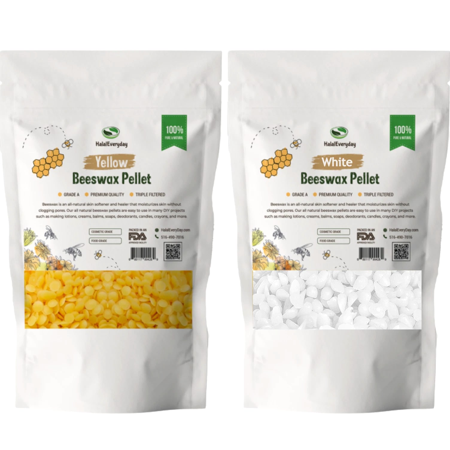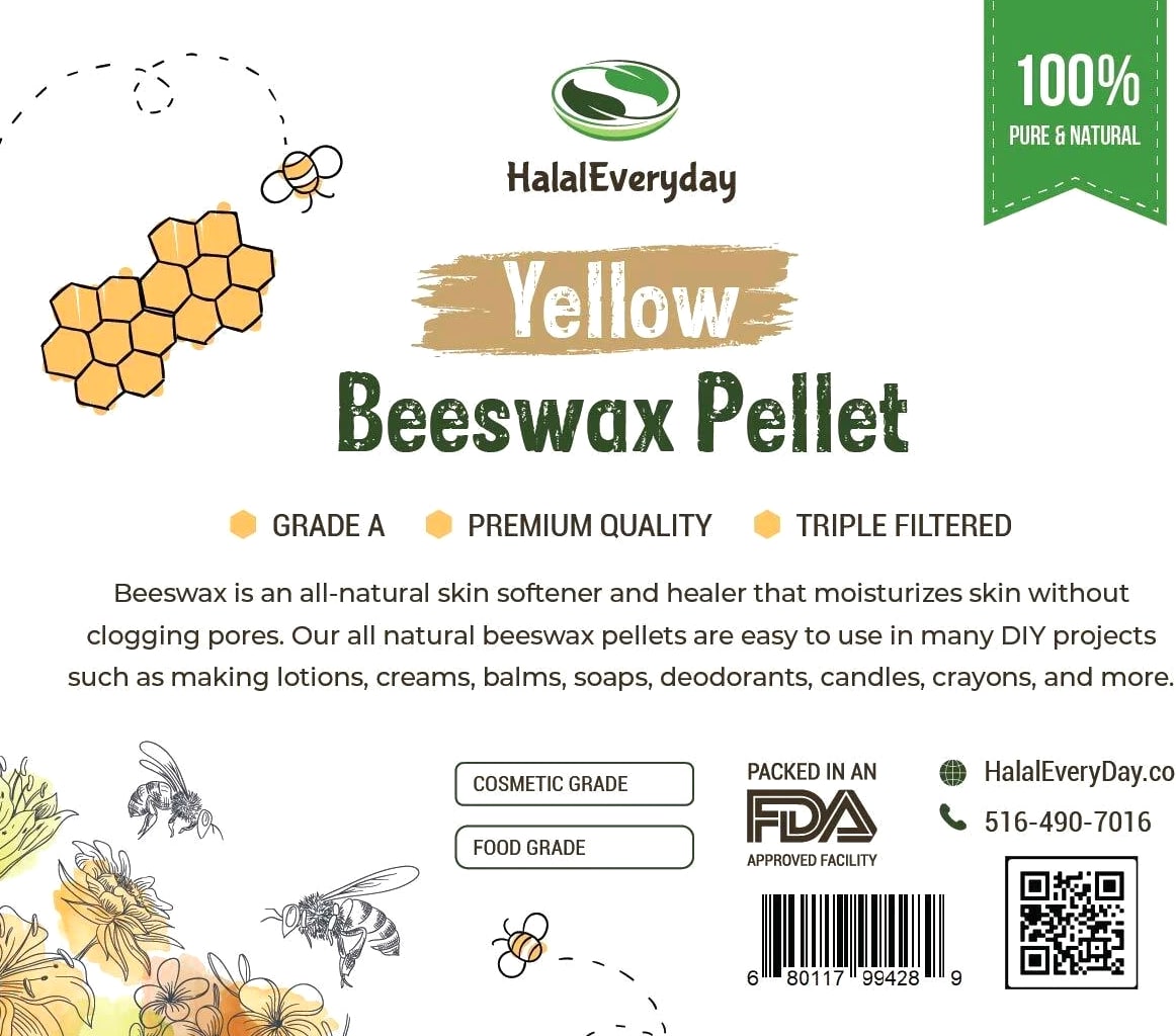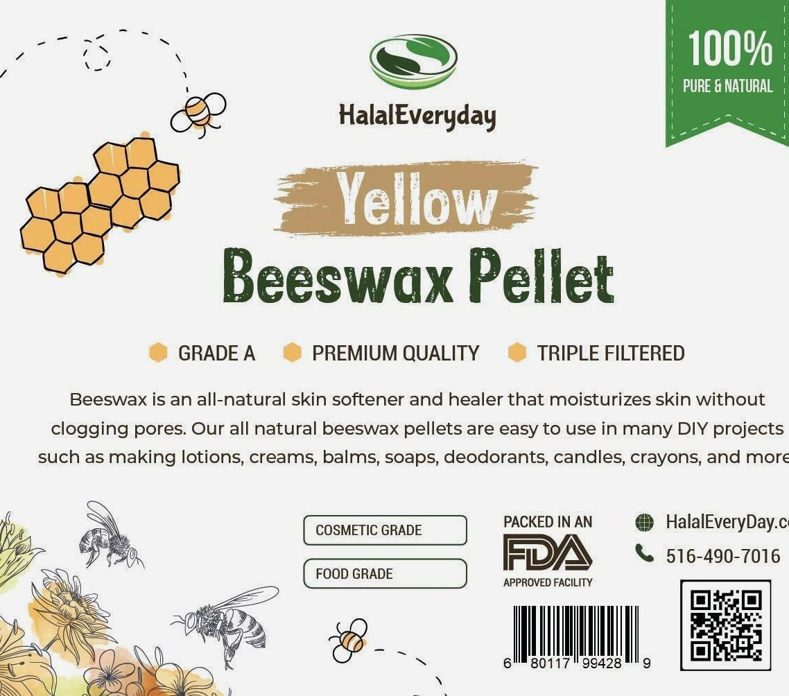 Yellow Beeswax Pellets White & Yellow 100% PURE Odorless | Triple filtered | Refined Cosmetic grade | Food grade GRADE A **Packaging may differ from listing image** Our pure yellow beeswax is raw and unrefined, ensuring it retains its high concentration of natural properties. With its rich, golden color and subtle honey aroma, it offers an exceptional ingredient for your creations. Key Features: 100% Natural and organic: Sourced from high-quality honeycombs. Raw and unrefined: Preserves natural nutrients and properties. Rich golden color: Adds a natural, attractive hue to your products. Subtle honey aroma: Provides a pleasant, natural scent. Non-GMO and Halal: Suitable for various dietary and ethical preferences. Versatile use: Ideal for skincare, candles, lip balms, crafts, and more. Premium quality: High-quality beeswax with a smooth, pliable texture. Benefits of Yellow Beeswax: Natural ingredient: Perfect for a variety of applications. Versatile: Can be used in cosmetics, crafts, and household projects. Eco-friendly: Sustainable and biodegradable. How to Use: Melt a small amount of beeswax and incorporate it into your desired recipe or project. Suitable for making candles, lip balms, lotions, and more. Perfect for DIY crafts and home projects. Ingredients: 100% Pure Organic Yellow Beeswax Why Choose Us? Our dedication to quality ensures you receive pure yellow beeswax free from additives and fillers. We source our beeswax from trusted organic beekeepers, promoting sustainability and ethical practices. Our beeswax is produced with care to preserve its natural benefits, providing you with superior ingredients for your creations. Packaging: Comes in a resealable, airtight bag to maintain freshness and convenience. FDA Disclaimer: These statements have not been evaluated by the Food and Drug Administration. This product is not intended to diagnose, treat, cure, or prevent any disease. Please consult with a professional before starting any new project o