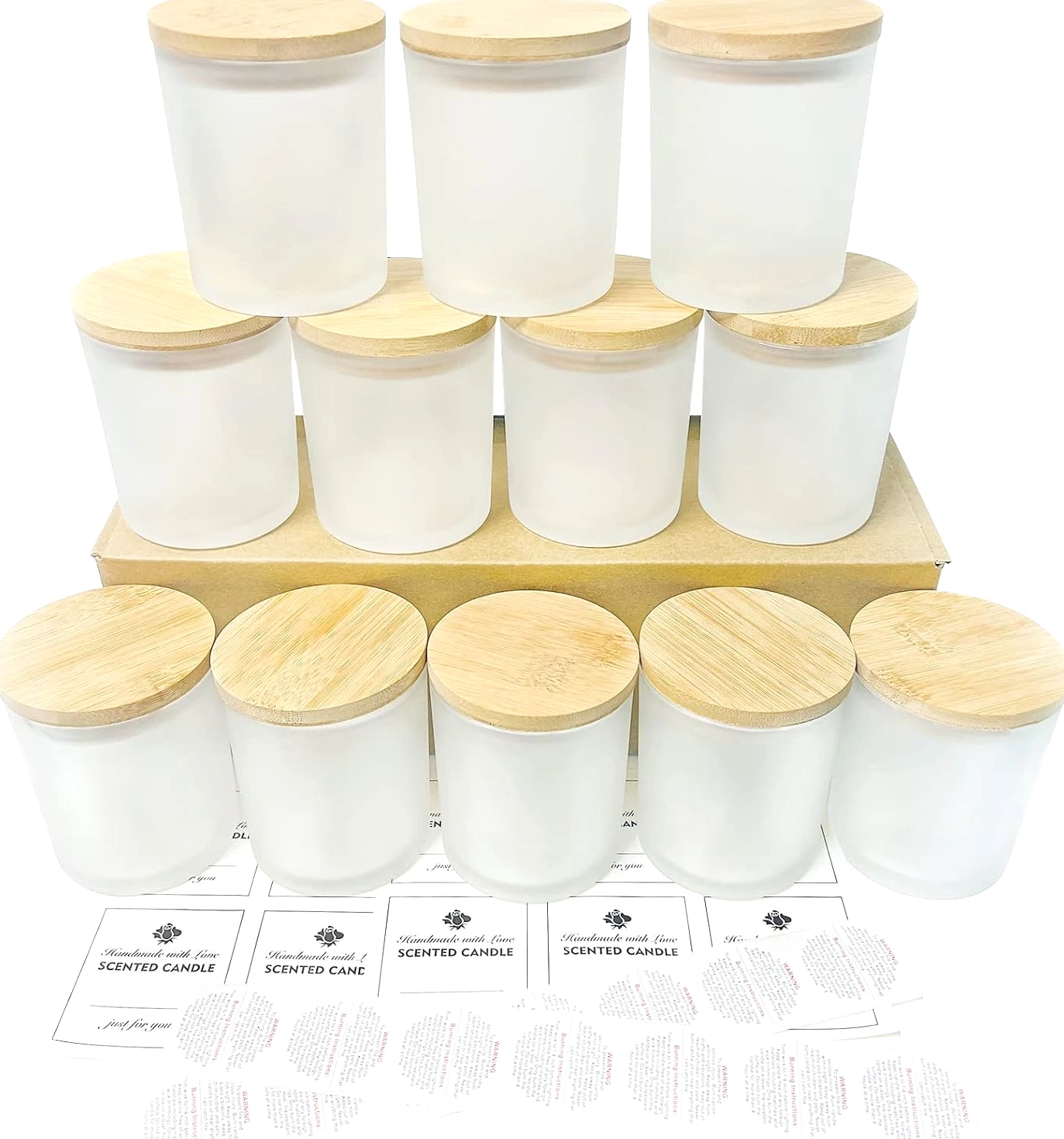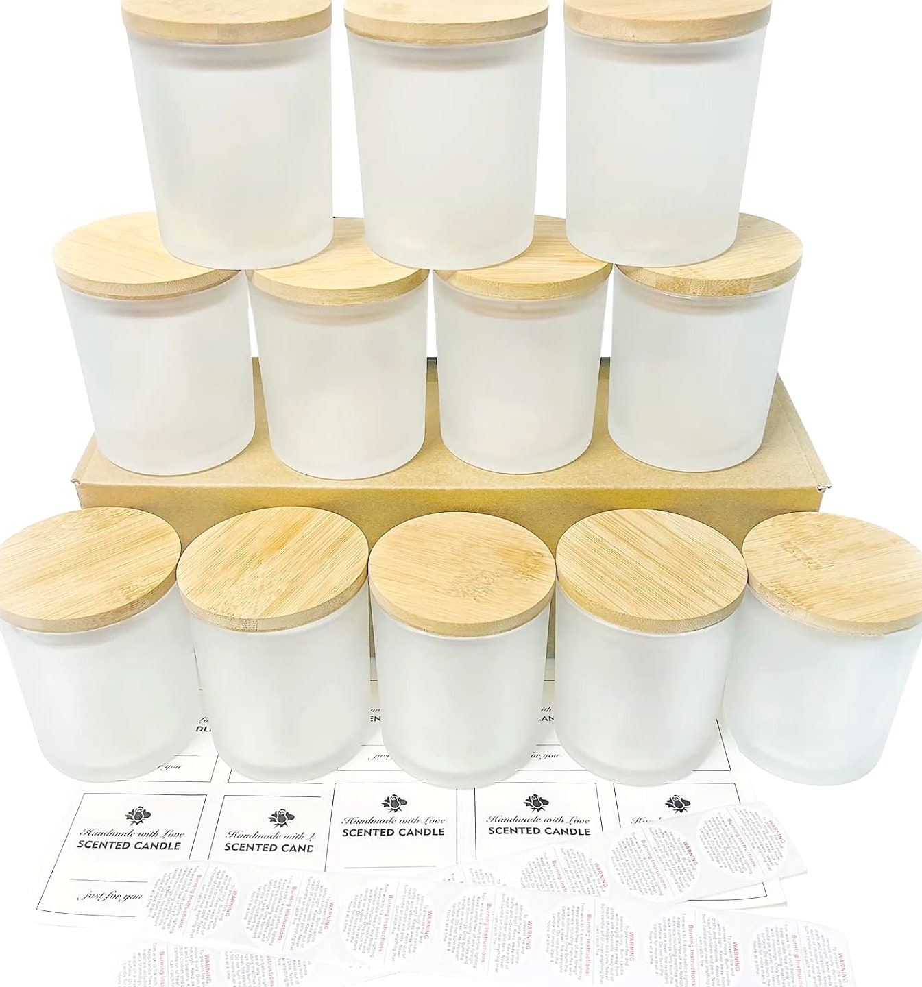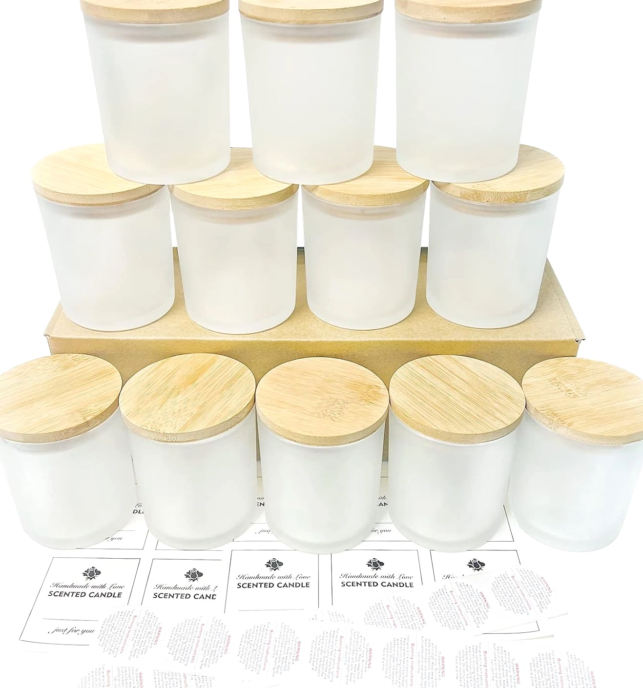 CONNOO 12 Pack 10 Oz Frosted Glass Candle Jars with Bamboo Lids for Making Candles Empty Candle Tins with Wooden Lids, Bulk Clean Candle Containers - Dishwasher Safe Description Item model number JLZG-011 Unit Count 12.0 Count Care instructions Dishwasher Safe Capacity 10 ounces Number of Items 12 Item Weight 7.7 ounces Color Frosted Brand CONNOO Material Glass Is Dishwasher Safe Yes Volume 284 Milliliters Batteries required No Shape Round Manufacturer CONNOO Product Dimensions 3.4"W x 2.8"H Number of pieces 12 ⭐️Buy with Confidence: Anti-broken package design for the glass jars makes them a low damage rate. Any broken jars—contact us and you will get a replacement or MONEY BACK GUARANTEE. ⭐️Value Pack: You will get 12pcs 10 oz frosted glass candle jars with bamboo lids and 12pcs sticky labels and 16pcs warning labels. ⭐️Multipurpose: All 12 Pack Frosted glass candle jars with lids are designed mainly for storage and organization. The durable development capacity allows them to be used for a range of purposes, and the easy-to-clean design makes them easy to maintain and keeps them looking great. Ideal for spices, coffee, dried food, herbs, tea leaves, nuts, etc. Also these clear jars with lids can be utilized as containers for powders such as sugar, salt, flour, body lotion, ointments, cosmetics, slime, or other crafts. ⭐️Safe and Easy Clean: CONNOO candle jars are made of high quality clear glass. No worry about cracks and it is heat resistant when you do your candle making work. Jars with airtight lids keep the candles dust-free. They are ideal for use with scented or unscented candles. If you need to wash your empty jars, put them in the dishwasher and let your hands stay free. ⭐️Airtight Lids: Empty candle jars come with bamboo lids which are lined with silicone sealing ring to ensure airtight seal, protecting from exposure to air and keeping aromatic and flavorful. Product description 12 Pack 10oz candle jars with lids A warmer candle also a decor for your house Airtight lids design makes candles