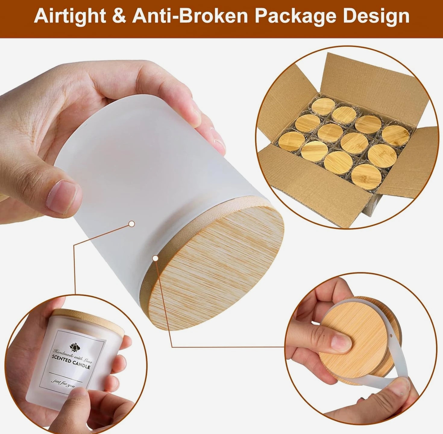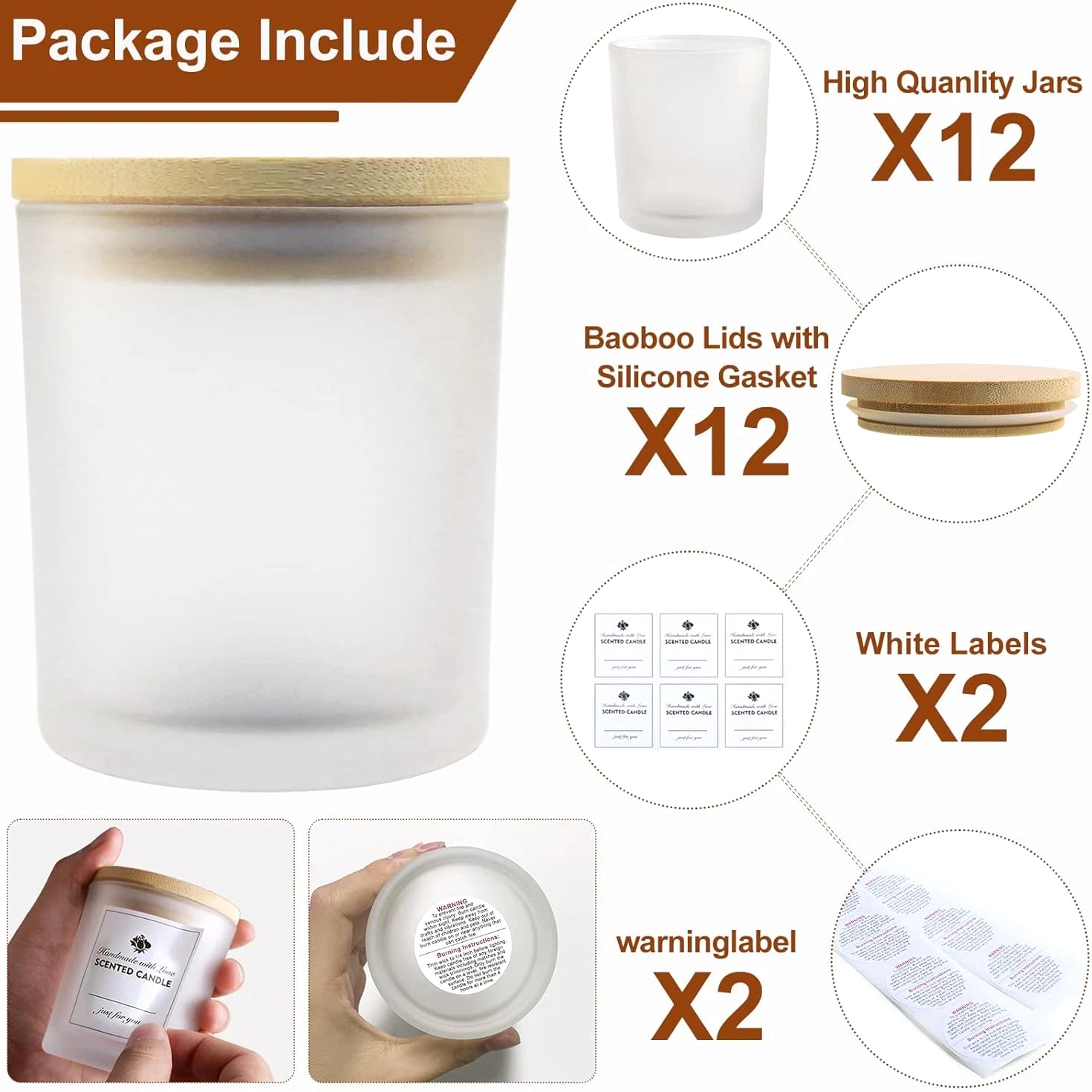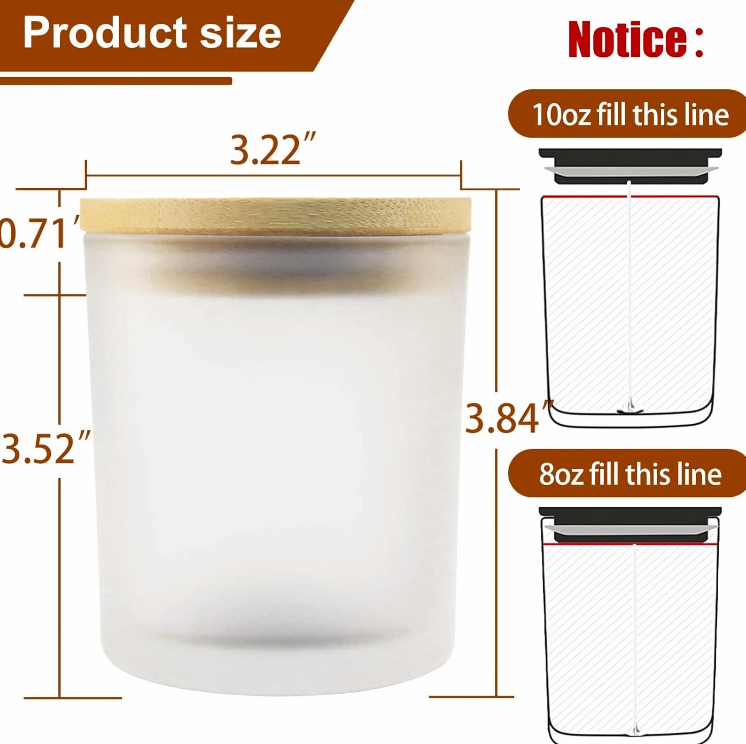 CONNOO 12 Pack 10 Oz Frosted Glass Candle Jars with Bamboo Lids for Making Candles Empty Candle Tins with Wooden Lids, Bulk Clean Candle Containers - Dishwasher Safe Description Item model number JLZG-011 Unit Count 12.0 Count Care instructions Dishwasher Safe Capacity 10 ounces Number of Items 12 Item Weight 7.7 ounces Color Frosted Brand CONNOO Material Glass Is Dishwasher Safe Yes Volume 284 Milliliters Batteries required No Shape Round Manufacturer CONNOO Product Dimensions 3.4"W x 2.8"H Number of pieces 12 ⭐️Buy with Confidence: Anti-broken package design for the glass jars makes them a low damage rate. Any broken jars—contact us and you will get a replacement or MONEY BACK GUARANTEE. ⭐️Value Pack: You will get 12pcs 10 oz frosted glass candle jars with bamboo lids and 12pcs sticky labels and 16pcs warning labels. ⭐️Multipurpose: All 12 Pack Frosted glass candle jars with lids are designed mainly for storage and organization. The durable development capacity allows them to be used for a range of purposes, and the easy-to-clean design makes them easy to maintain and keeps them looking great. Ideal for spices, coffee, dried food, herbs, tea leaves, nuts, etc. Also these clear jars with lids can be utilized as containers for powders such as sugar, salt, flour, body lotion, ointments, cosmetics, slime, or other crafts. ⭐️Safe and Easy Clean: CONNOO candle jars are made of high quality clear glass. No worry about cracks and it is heat resistant when you do your candle making work. Jars with airtight lids keep the candles dust-free. They are ideal for use with scented or unscented candles. If you need to wash your empty jars, put them in the dishwasher and let your hands stay free. ⭐️Airtight Lids: Empty candle jars come with bamboo lids which are lined with silicone sealing ring to ensure airtight seal, protecting from exposure to air and keeping aromatic and flavorful. Product description 12 Pack 10oz candle jars with lids A warmer candle also a decor for your house Airtight lids design makes candles