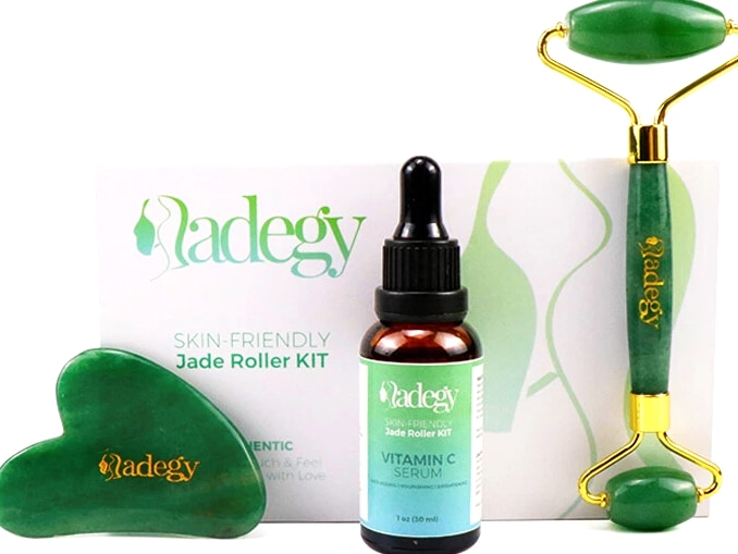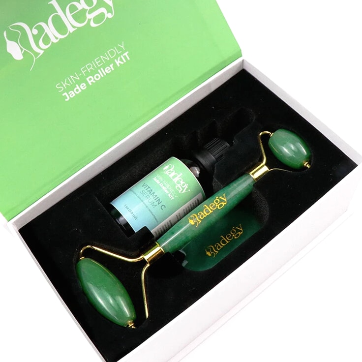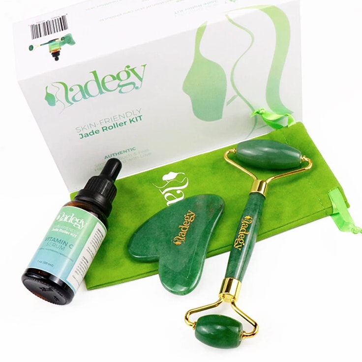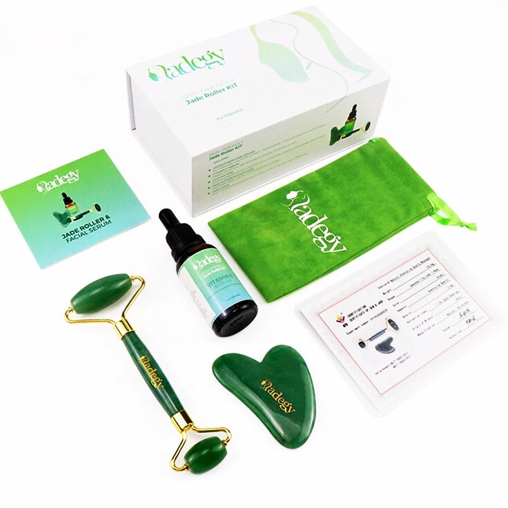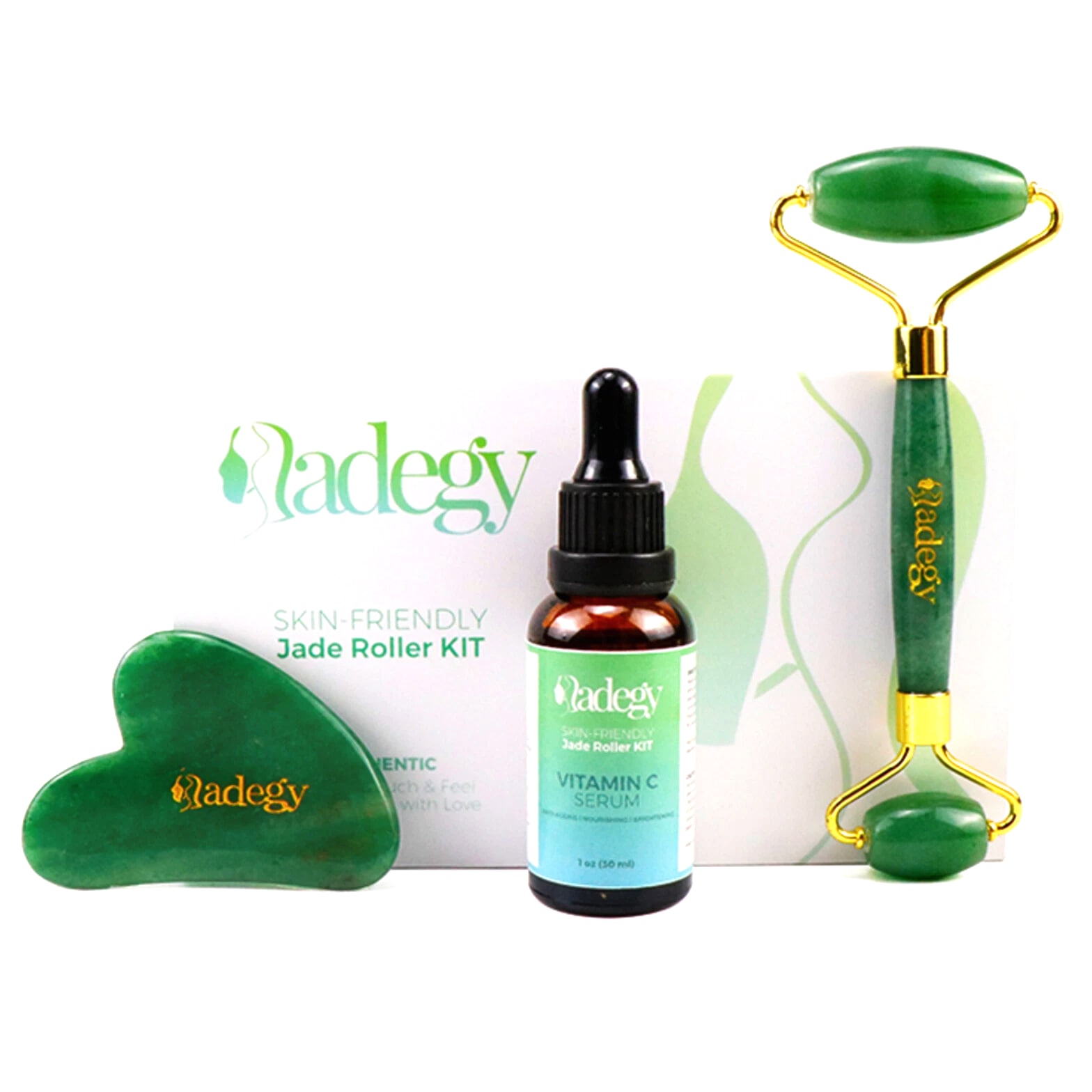 • Material: Natural Aventurine stone (often called "green jade" in beauty tools). NOT nephrite or jadeite. • Includes: Double-ended roller, gua sha, Vitamin C serum, storage pouch, gift-ready box. • Packaging: Roller and gua sha are wrapped separately with a foam separator to prevent contact. • Use: De-puff, soothe, and relax face/neck; fridge-friendly for extra cooling. • Next business day shipping, 30-day returns (unused). FAQ — Is this real jade? It's natural Aventurine (a quartz) often marketed as "green jade." We label it clearly to avoid confusion. Jadegy Aventurine Jade Face Roller Gua Sha Set and Vitamin C Serum | Improve The Appearance of Your Skin, Provide Relaxation, Massage Your Face & Enhance Your Skin Care Routine | Real 100% Natural Jade Stone Kit for Face & Neck Jadegy JADE Face ROLLER Natural & Premium LUXURIOUS MASSAGING EXPERIENCE Improved circulation & deeper penetration of skin care products REDUCED PUFFINESS & INFLAMMATION Helps reduce dark circles, fine lines & wrinkles REJUVENATING & REFRESHING Cool natural stone reinvigorates skin cells & helps have healthier skin Skin-Friendly Personal Care Kit AUTHENTIC Smooth Touch & Feel Handcrafted with Love INCLUDES · AVENTURINE JADE Face ROLLER No sharp parts, chemicals or toxics – No squeaking – Natural & Exquisite yet Solid Build · VITAMIN C SERUM Deeply moisturize, reap anti-ageing benefits & brighten up skin · GUA SHA TOOL Natural scraping tool for improved micro-circulation, healing, and reduced inflammation · JADE AUTHENTICATION CARD Certificate reassuring you of the authenticity of jade · USER GUIDE Easy to understand instructions to help you use it the right way & effectively VITAMIN C SERUM JADEGY VITAMIN C SERUM ANTI-AGEING | NOURISHING | BRIGHTENING 1 oz (30 ml) CAUTION For external use only – please avoid use on scratched or damaged skin. Discontinue use if redness, irritation or discomfort occurs. Avoid direct contact with eyes. Store in cool dry place. Keep out of