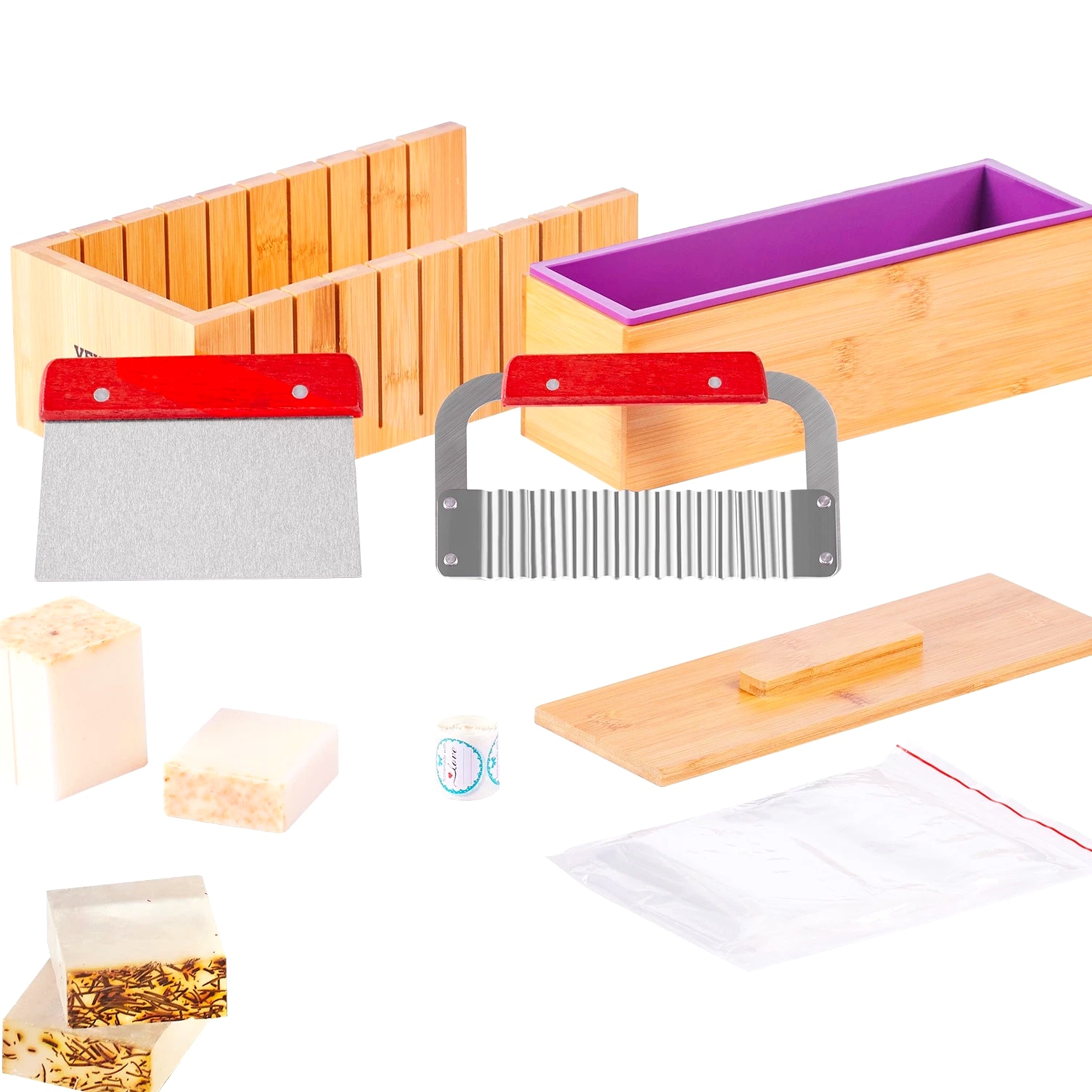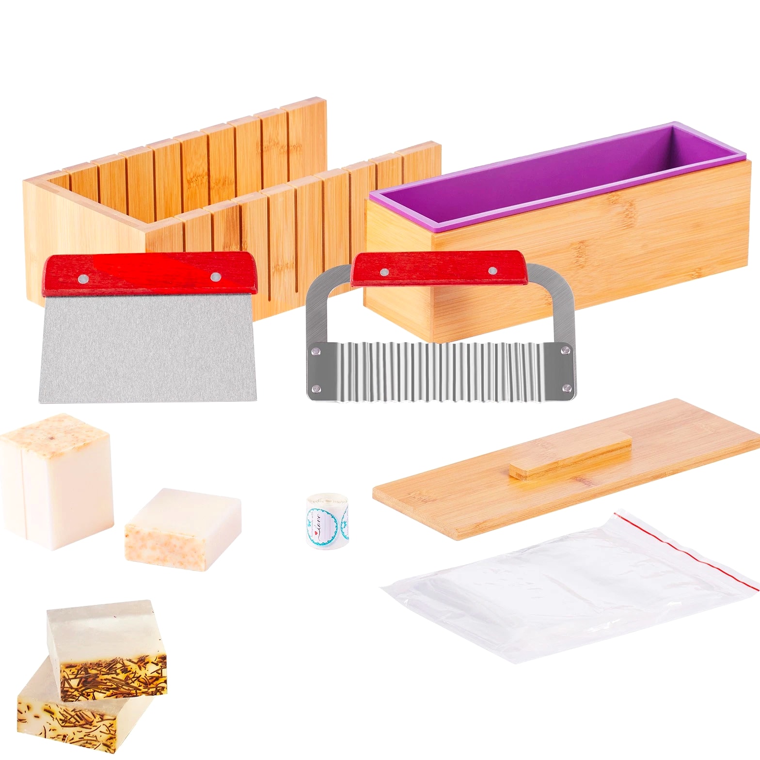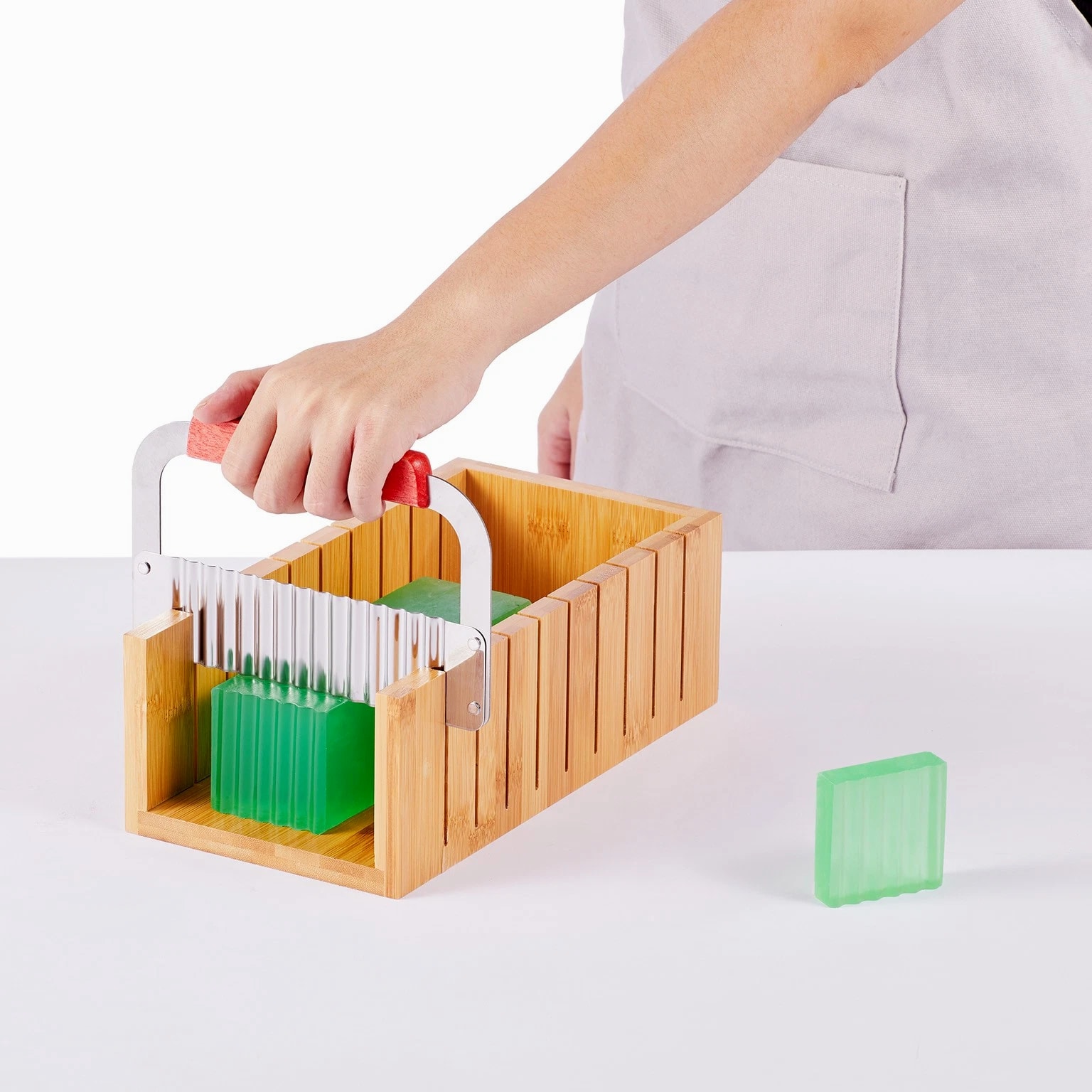 Complete Soap Making Kit for Creating Perfectly Uniform Soap Bars You can create perfect soap bars that are 1 inch thick with our soap making kit. The precise gap design of each cut ensures uniformity and prevents deviations, making it effortless to produce professional-grade handmade soap. Our soap making supplies include a bamboo box, silicone molds, stainless steel cutters, plastic bags, and label stickers. Every accessory is designed to enhance the smoothness and perfection of your soap crafting process. Our soap loaf cutter box is made from high-quality bamboo, is elegant and possesses natural antibacterial properties. It effectively prevents mold growth and insect infestations, ensuring a more hygienic and safe soap-making experience. The molds are made of premium silicone for easy demolding. The blades are constructed from 304 stainless steel, providing excellent corrosion resistance and sharpness. They ensure precision in every cut. You can choose from two different blade styles to meet your creative needs while ensuring a bacteria-free environment for your soap making. Our soap making tools are the perfect gift choice, bringing creativity and joy to your friends and family. Whether it's a birthday, holiday, or special occasion, this thoughtfully prepared gift will be a memorable and delightful surprise! Features & Details 1-Inch Precise Cutting: The soap making kit features a precise cutting design, allowing you to create uniform soap bars that are 1 inch thick effortlessly. Each cut is accurate, ensuring even and professional results for your soap crafting. Complete Soap Making Kit: Our soap making supplies include a bamboo box, a silicone mold, 2 stainless steel cutting slicers, 100 plastic bags, and 105 labeling stickers. All the accessories you need are included, providing you with a comprehensive set of soap making tools in one package. Natural Bamboo Cutting Box: The elegant and high-quality bamboo cutting box possesses natural antibacterial properties, ensuri