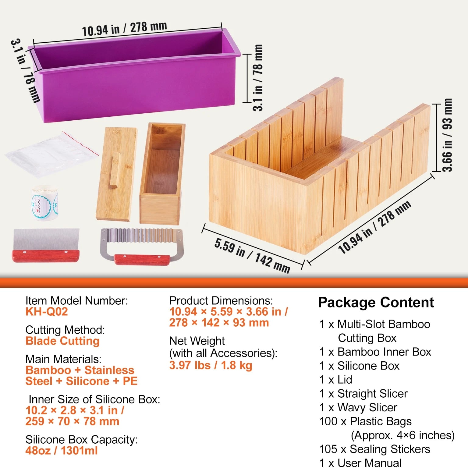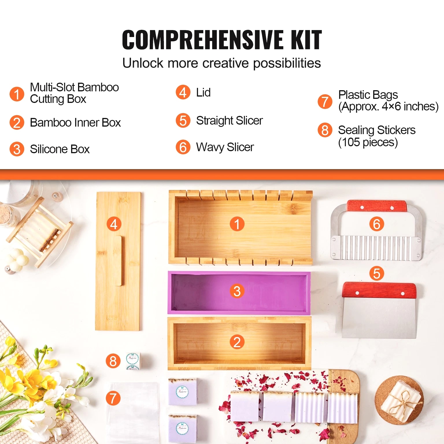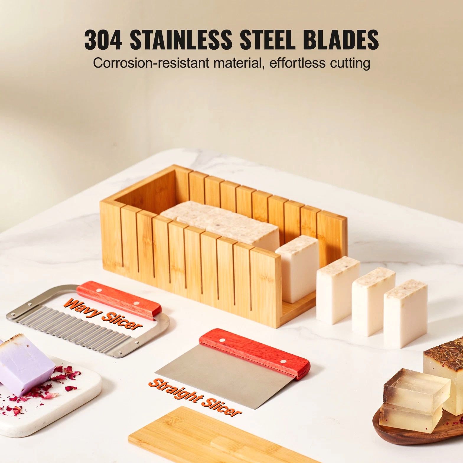 Complete Soap Making Kit for Creating Perfectly Uniform Soap Bars You can create perfect soap bars that are 1 inch thick with our soap making kit. The precise gap design of each cut ensures uniformity and prevents deviations, making it effortless to produce professional-grade handmade soap. Our soap making supplies include a bamboo box, silicone molds, stainless steel cutters, plastic bags, and label stickers. Every accessory is designed to enhance the smoothness and perfection of your soap crafting process. Our soap loaf cutter box is made from high-quality bamboo, is elegant and possesses natural antibacterial properties. It effectively prevents mold growth and insect infestations, ensuring a more hygienic and safe soap-making experience. The molds are made of premium silicone for easy demolding. The blades are constructed from 304 stainless steel, providing excellent corrosion resistance and sharpness. They ensure precision in every cut. You can choose from two different blade styles to meet your creative needs while ensuring a bacteria-free environment for your soap making. Our soap making tools are the perfect gift choice, bringing creativity and joy to your friends and family. Whether it's a birthday, holiday, or special occasion, this thoughtfully prepared gift will be a memorable and delightful surprise! Features & Details 1-Inch Precise Cutting: The soap making kit features a precise cutting design, allowing you to create uniform soap bars that are 1 inch thick effortlessly. Each cut is accurate, ensuring even and professional results for your soap crafting. Complete Soap Making Kit: Our soap making supplies include a bamboo box, a silicone mold, 2 stainless steel cutting slicers, 100 plastic bags, and 105 labeling stickers. All the accessories you need are included, providing you with a comprehensive set of soap making tools in one package. Natural Bamboo Cutting Box: The elegant and high-quality bamboo cutting box possesses natural antibacterial properties, ensuri