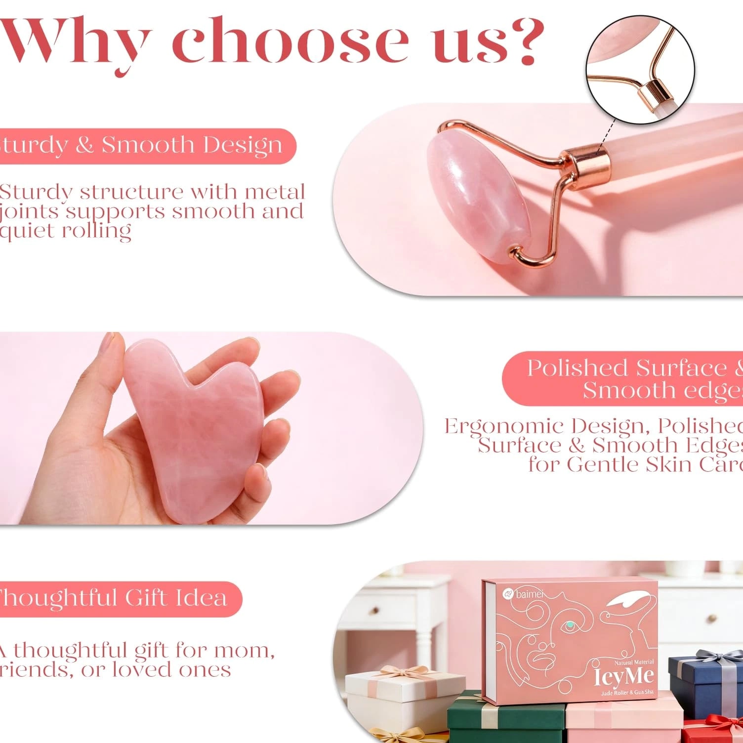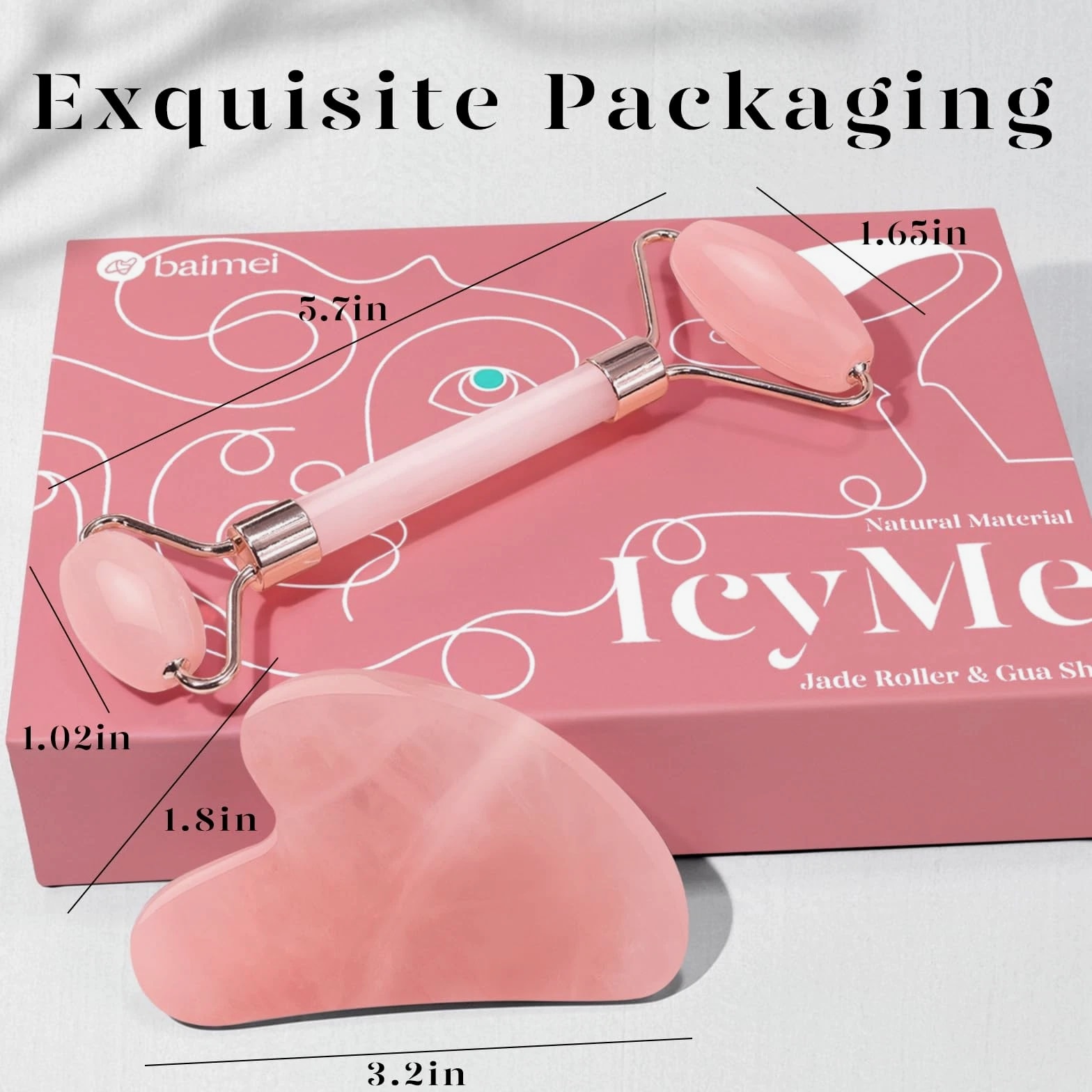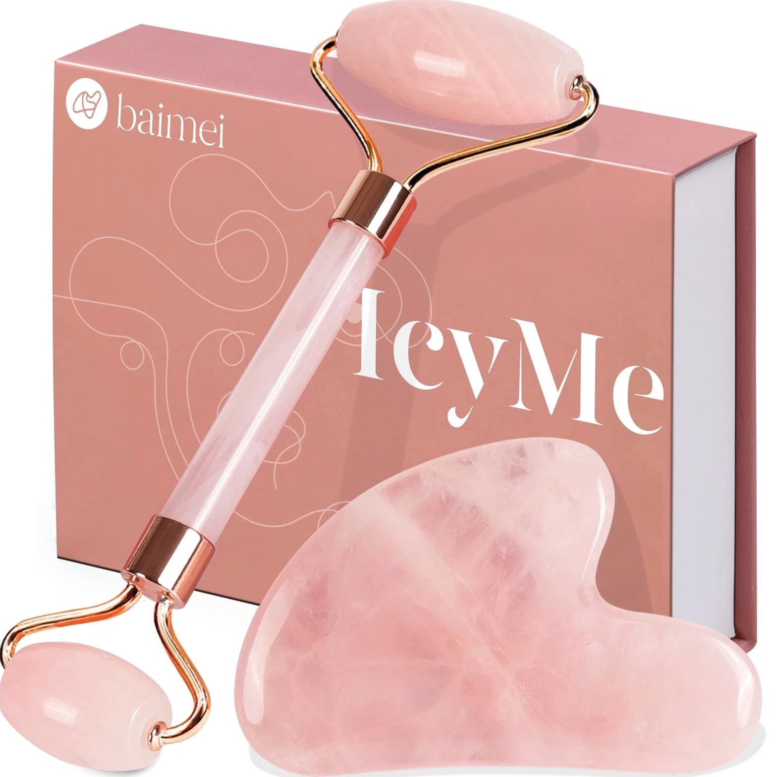 BAIMEI IcyMe Jade Roller & Gua Sha, Face Redness 2 Piece Set, Pink Description Features: [Radiant Revitalization] Face roller effectively relieves muscle tension, quickly reduces facial puffiness and redness, leaving your skin fresh, firm, and dewy with a lifted appearance. Ideal for daily stress relief [Energized Skin] Crafted from authentic rose quartz, this at-home face massager provides instant cooling and energizes your skin. Use it with your favorite oil or serum to brighten your complexion [Gua Sha for Lift and Sculpt] Gua Sha effectively lifts skin, smooths fine lines with upward pressure, and precisely shapes your jawline, which can be used as a Jawline sculptor tool [Cooling Morning Routine] Keep the facial jade roller and Gua Sha in the fridge for an extra-cool touch. It rapidly reduces morning puffiness and refreshes your skin - IcyMe. Packaging may vary [An Ideal Gift for Her] The pink skincare tool in thoughtful packaging makes an ideal Mother's Day gift for women. We recommend washing the set before and after each use Product Details: Handling All orders will be shipped within 1 business day of payment. Delivery We are part of an international shipping program, offering both domestic US and international expedited shipping. Return Policy All items qualify for returns within 30 days of receipt. Buyer is responsible for return shipping on any item that is not damaged. Feedback We take our reputation seriously, as we buy and sell online and understand the value of trust. If you are unsatisfied with your order, please contact us and we will work with you to resolve it to your satisfaction.