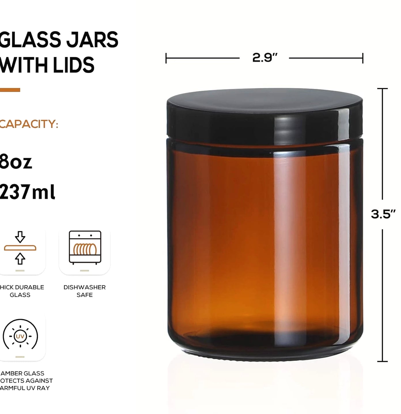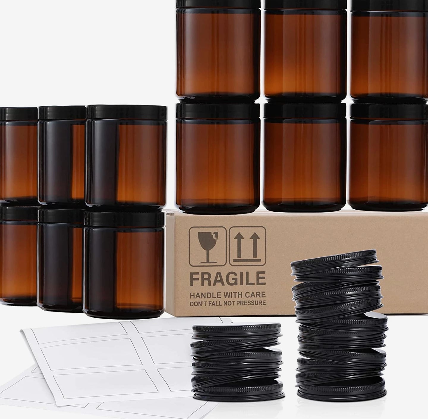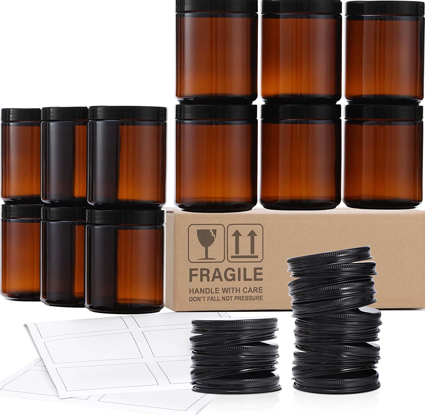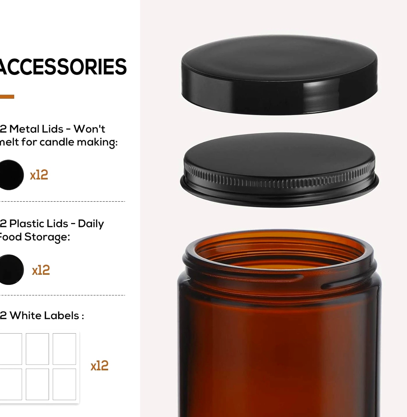 ★Product Includes - 12 pcs 8oz amber / brown round glass jar + 12 metal lids + 12 plastic lids + 12 white labels. You have an option of using two different lids according to actual needs ★2 Type of Lids - Plastic lids for regular storage. Metal lids for candle jar (These jars are ideal containers for candle making) ★Thick Glass - Strong, dishwasher safe, high temperature resistance ★Airtight Lids - Lids are lined with a thin sheet of foam to ensure the airtight seal. No worry about leaking while traveling with them ★Various Uses - Act as small / mini mason jars or sample bottles. You can store solid, liquid or powder, such as spice, salt, lotion, candle, ointments and more Product description Safe Package These jars are packaged in bubble bags with grid-shaped partition and thick carton box to prevent damage in transport Airtight - Leakproof Lids are lined with a thin sheet of foam to ensure the airtight seal Dishwasher Safe Thick Glass - Strong, dishwasher safe, high temperature resistance.