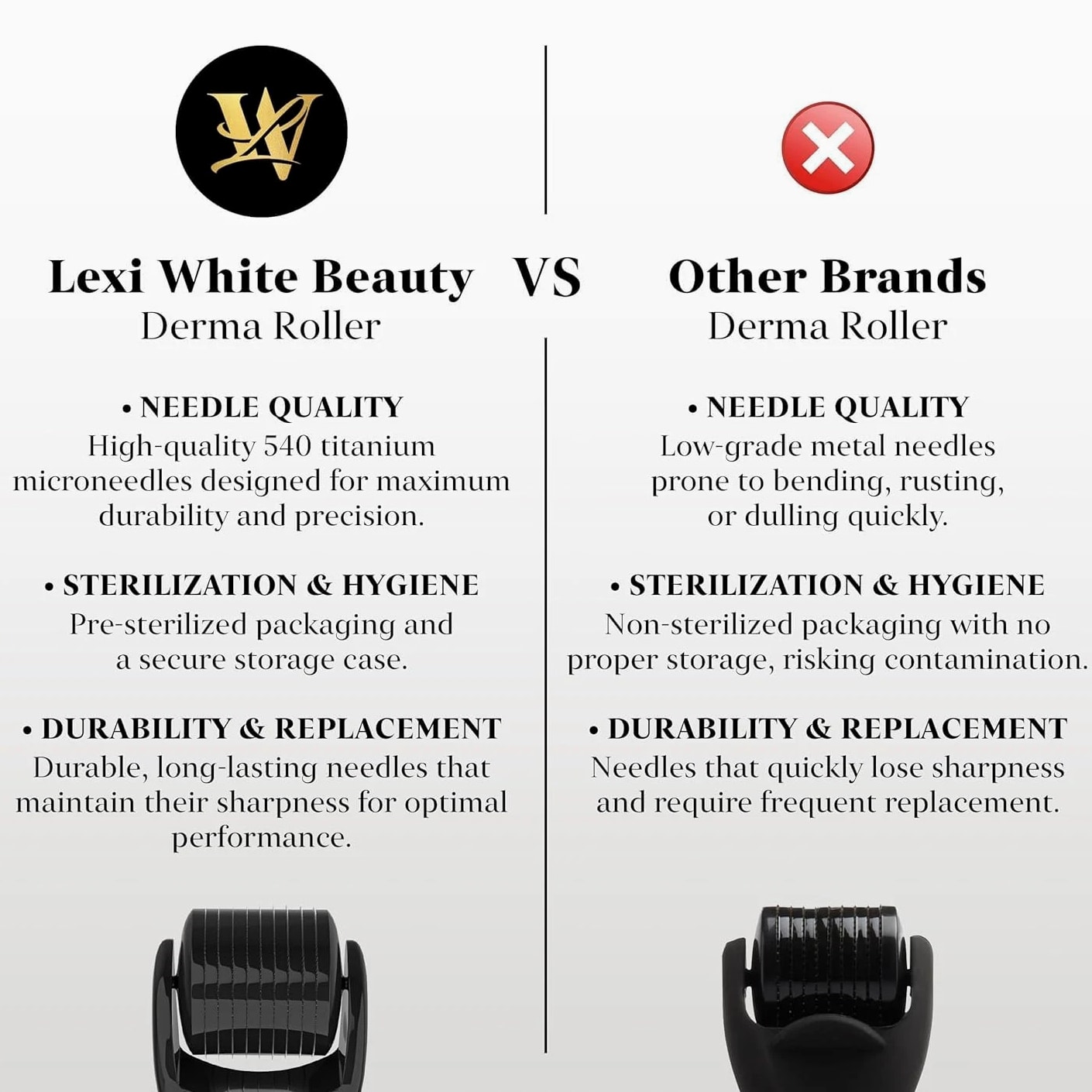 Derma Roller for Skin, Hair & Beard – Titanium Microneedling Roller for Face & Scalp, Safe & Easy to Use 0.25mm Description Item model number Rasage et épilation Color Black Product Dimensions 6.5 x 1.85 x 1.57 inches; 2.65 ounces Recommended Uses For Product Beard, Face, Scalp Skin Type Sensitive Material Type Free Hypoallergenic Item Form Tool Titanium Microneedling Roller – Sterilized & Durable – Made with 540 high-quality titanium needles, ensuring durability and safety. Includes a sterilized roller and storage case to keep it clean. Easy to Use – Perfect for Beginners – Designed for both men and women, this micro dermaroller is easy to use on the scalp, beard, face, and skin. A simple at-home microneedling tool for all experience levels. It has a needle length of 0.25mm How to Use & How Often – Use 1-3 times per week, applying gentle pressure to the desired area. Roll 4–6 times in each direction (vertical, horizontal, diagonal). Ideal for those looking for a scalp roller, beard roller, or microneedling roller for skin. How to Clean & Replace – Rinse with alcohol or warm water after each use. Replace every 1-2 months. A hygienic, easy-to-maintain tool with a protective case for storage. Trusted Brand – Lexi White Beauty – As seen on top beauty platforms, Lexi White Beauty's derma roller is designed for safe, consistent use. Protected by our 100% refund or replacement satisfaction guarantee. Product description Find Your Perfect Match