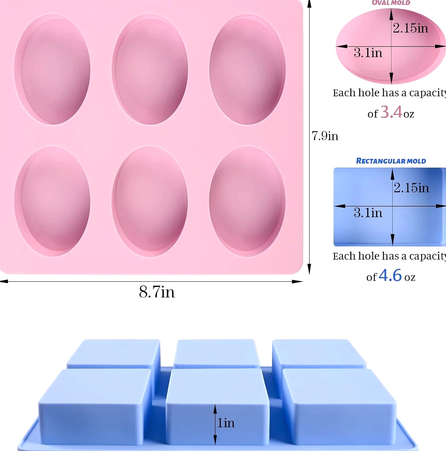 Silicone Soap Molds: These silicone soap molds are extremely easy to use. Then turn it upside down; this flexible silicone mold offers a non-stick surface that allows the baked goods to pop right out with a little push from the bottom. Remember to place the silicone mold on a baking sheet for easier positioning and removal. Handmade Soap Molds: 2 pcs silicone mold, 6 cavities for each tray. The size of each tray is 8.7in * 7.9in; each cavity is 3.1in * 2.15in / 7.88cm * 5.47cm. Rectangle shape holds fluid 4.6 oz, oval shape holds fluid 3.4 oz. Soap Silicone Molds: Temperature safe from -104 to +446 degrees Fahrenheit (-40 to +230 degrees Celsius). Easy to clean up; can be used for microwave, oven, refrigerator, freezer and dishwasher. Wide Applications Soap Molds: Best silicone soap mold for making handmade soap, but also suitable for baking, biscuit, chocolate mold, pudding, candle, resin, polymer clay and other craft art. Oval + Rectangle Soap Molds: Our hand soap silicone molds come with 2 different shapes to meet your various needs, or making gifts to your friends or neighbors.