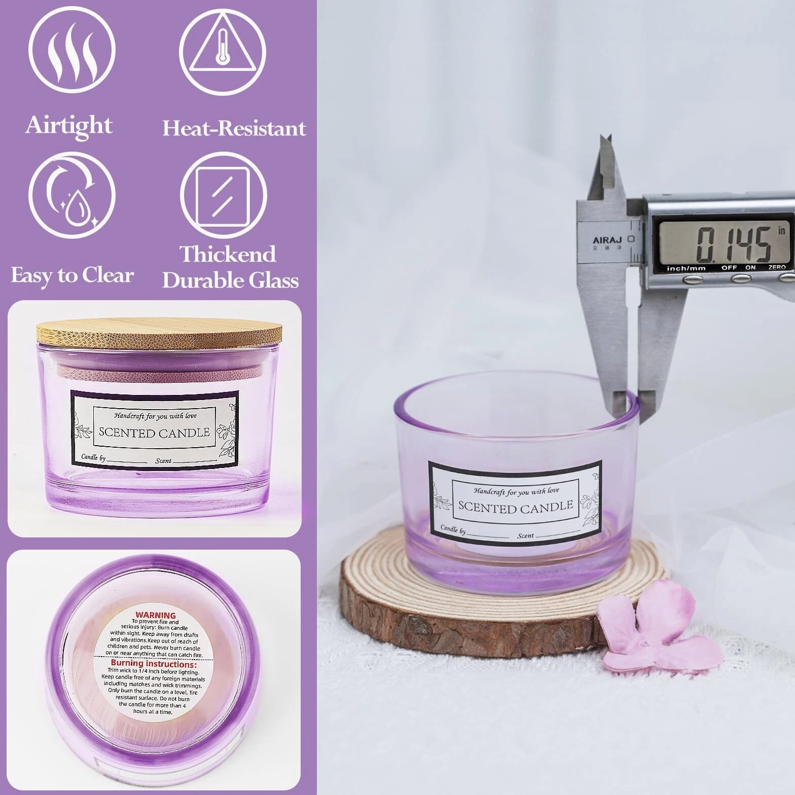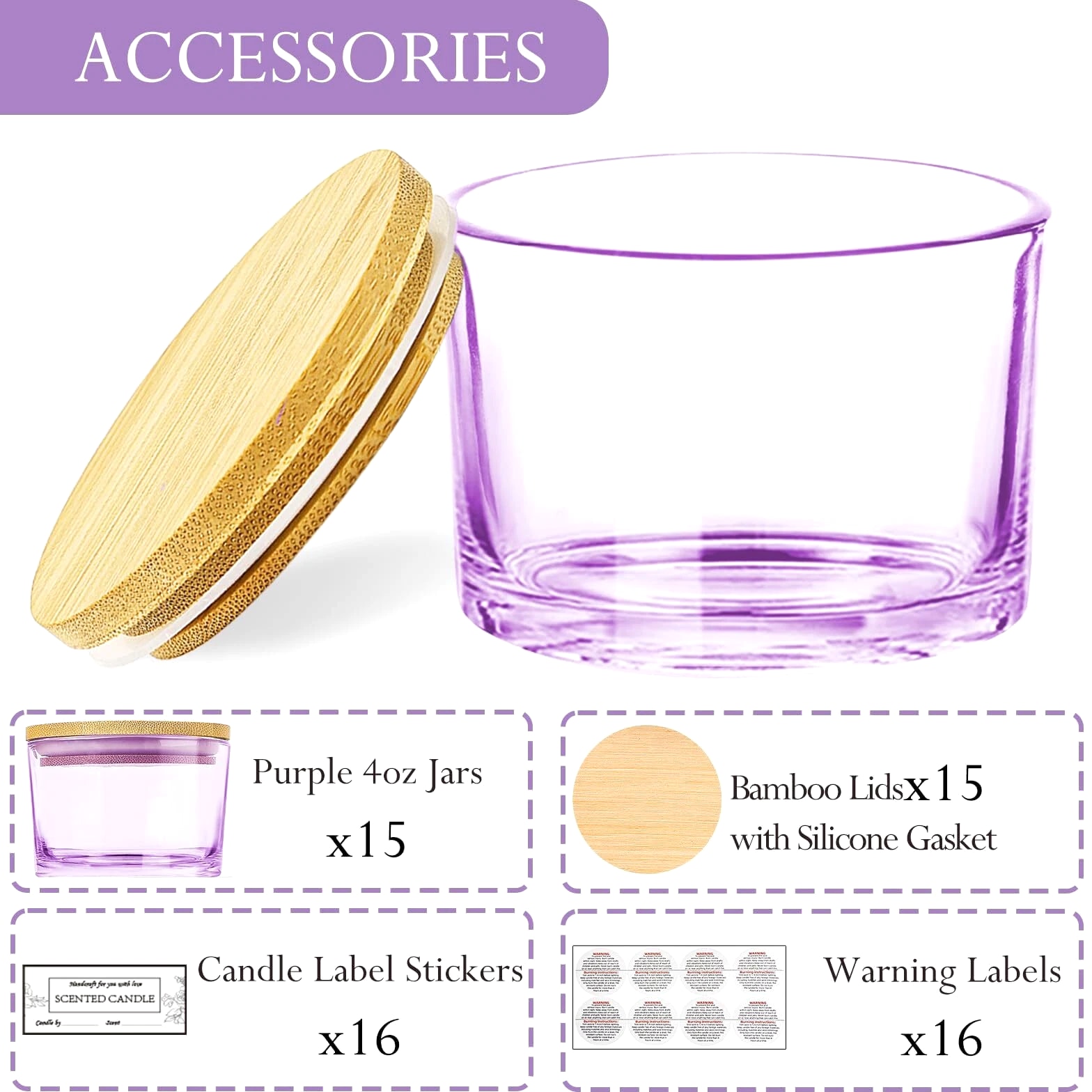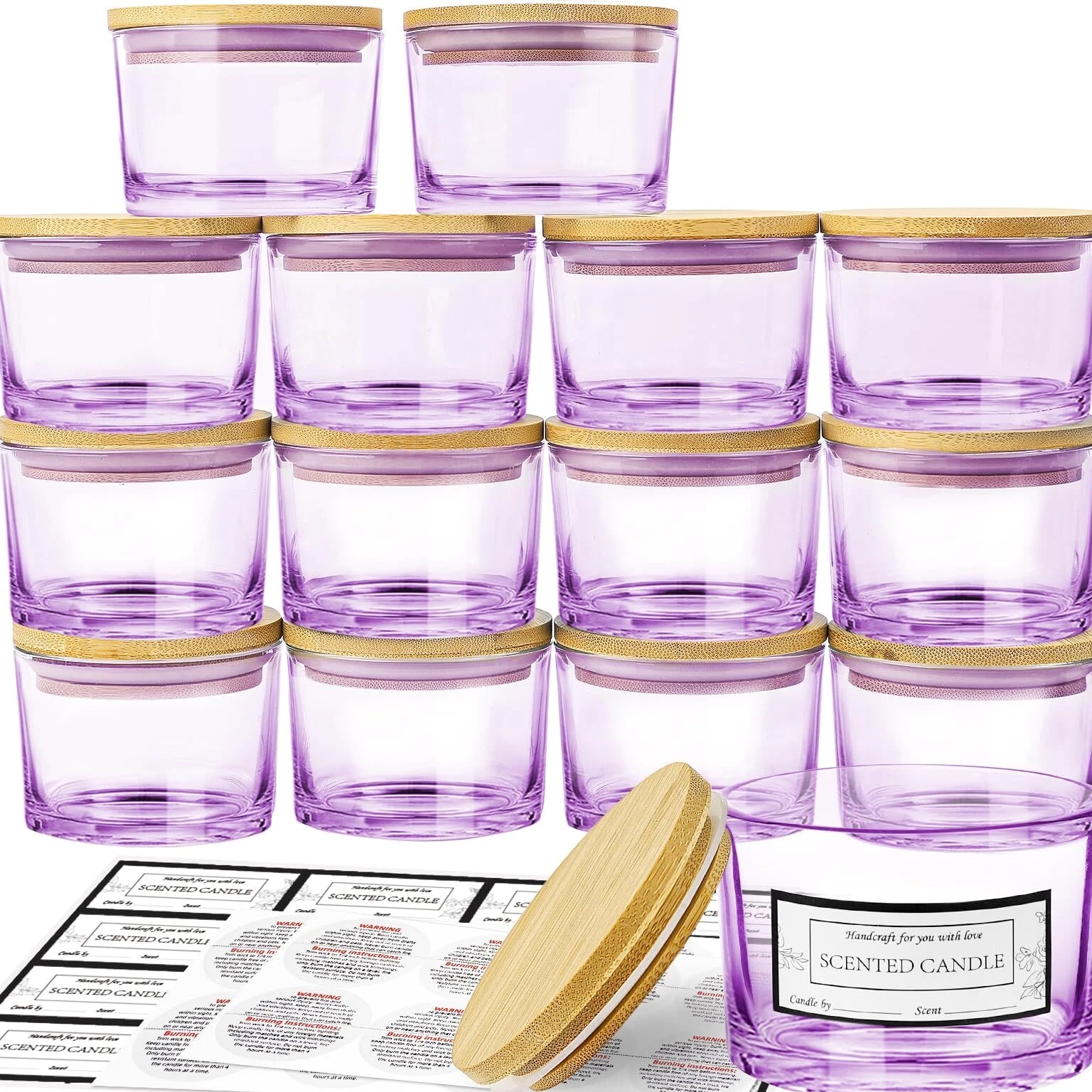 15 Pack 4 oz Glass Candle Jars with Bamboo Lids for Candle Making, Soy Wax Features: Value Candle Making Supplies Pack: 15 Pcs wide mouth 4oz empty purple candle jars with bamboo lids, 16 scented candle sticker labels and 16 candle warning labels. Suitable for DIY homemade candle starters and candle making business. Moderate Capacity: With a 4oz capacity, these candle jars for making candles are perfectly sized to hold a reasonable amount of wax (suitable for 3/3.5/4/4.5oz candles) without occupying excessive space. This makes it an excellent choice for creating personalized, small-batch candles. Premium Material: The 4oz candle containers are crafted from high-quality glass with 33mm walls, ensuring durability and strength. This glass is designed to withstand high temperatures while maintaining a consistent appearance. Jars with airtight lids keep candles dust-free, protecting them from exposure to air and keeping them aromatic and flavorful. The empty candle jars are dishwasher safe and easy to clean by hand. Customization Friendly: These cute 4oz candle vessels feature beautiful designed stickers. The sleek design is perfect for customization. Whether applying stickers or painting to suit your brand needs or holiday themes, it offers ample space for personalization. If you need more than the quantity shown available, just send a message, and we'll increase the purchased limit for you. SHIPPING We are always working hard to ensure your package arrives as soon as possible. Please understand that some factors like weather, high postal traffic, and shipping company performance are outside our control. We offer free shipping to the lower 48 states. We don't ship to PO boxes. Please provide a physical address. Thank you.