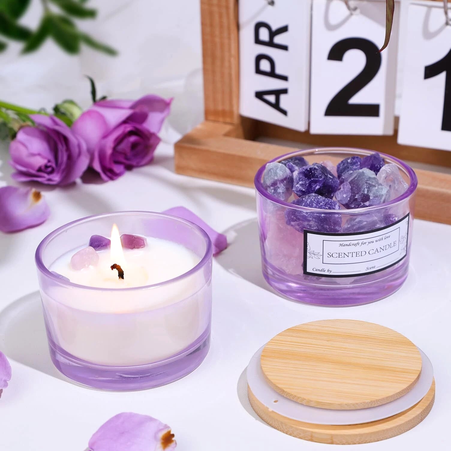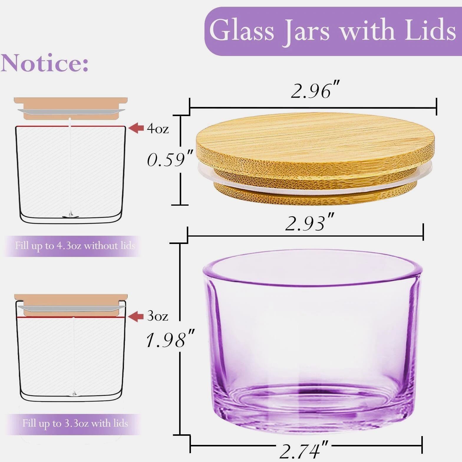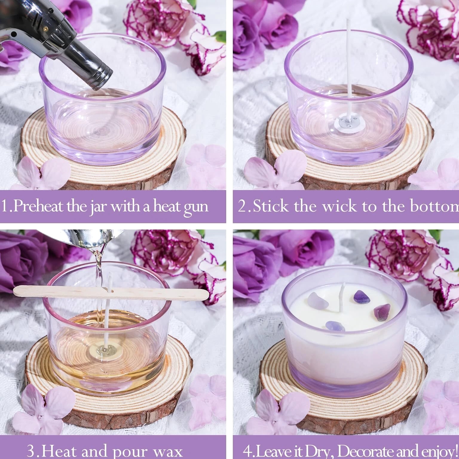 15 Pack 4 oz Glass Candle Jars with Bamboo Lids for Candle Making, Soy Wax Features: Value Candle Making Supplies Pack: 15 Pcs wide mouth 4oz empty purple candle jars with bamboo lids, 16 scented candle sticker labels and 16 candle warning labels. Suitable for DIY homemade candle starters and candle making business. Moderate Capacity: With a 4oz capacity, these candle jars for making candles are perfectly sized to hold a reasonable amount of wax (suitable for 3/3.5/4/4.5oz candles) without occupying excessive space. This makes it an excellent choice for creating personalized, small-batch candles. Premium Material: The 4oz candle containers are crafted from high-quality glass with 33mm walls, ensuring durability and strength. This glass is designed to withstand high temperatures while maintaining a consistent appearance. Jars with airtight lids keep candles dust-free, protecting them from exposure to air and keeping them aromatic and flavorful. The empty candle jars are dishwasher safe and easy to clean by hand. Customization Friendly: These cute 4oz candle vessels feature beautiful designed stickers. The sleek design is perfect for customization. Whether applying stickers or painting to suit your brand needs or holiday themes, it offers ample space for personalization. If you need more than the quantity shown available, just send a message, and we'll increase the purchased limit for you. SHIPPING We are always working hard to ensure your package arrives as soon as possible. Please understand that some factors like weather, high postal traffic, and shipping company performance are outside our control. We offer free shipping to the lower 48 states. We don't ship to PO boxes. Please provide a physical address. Thank you.