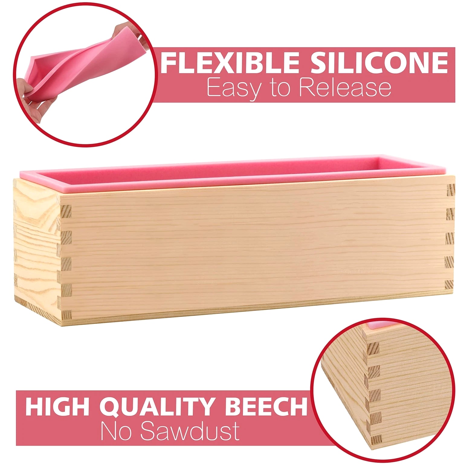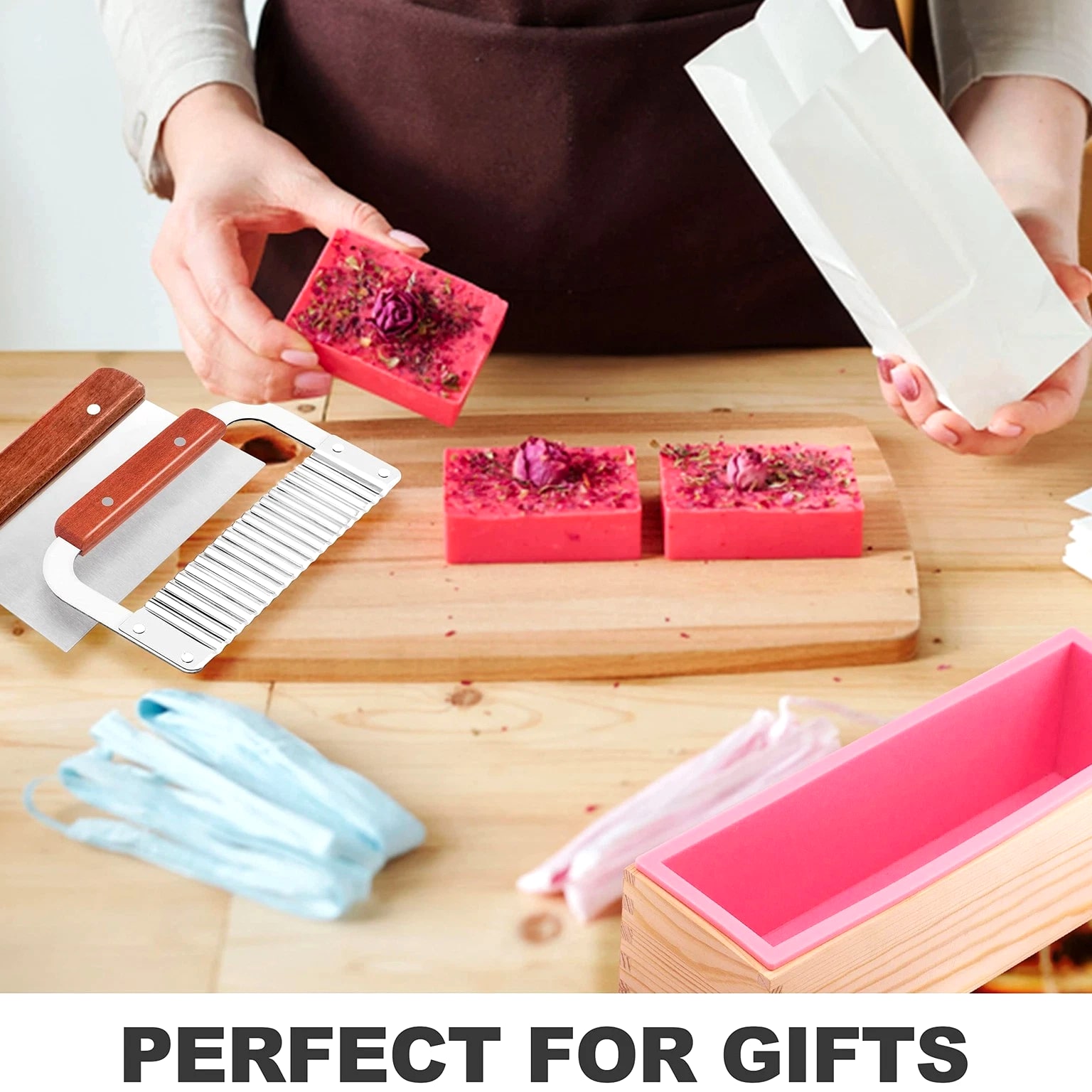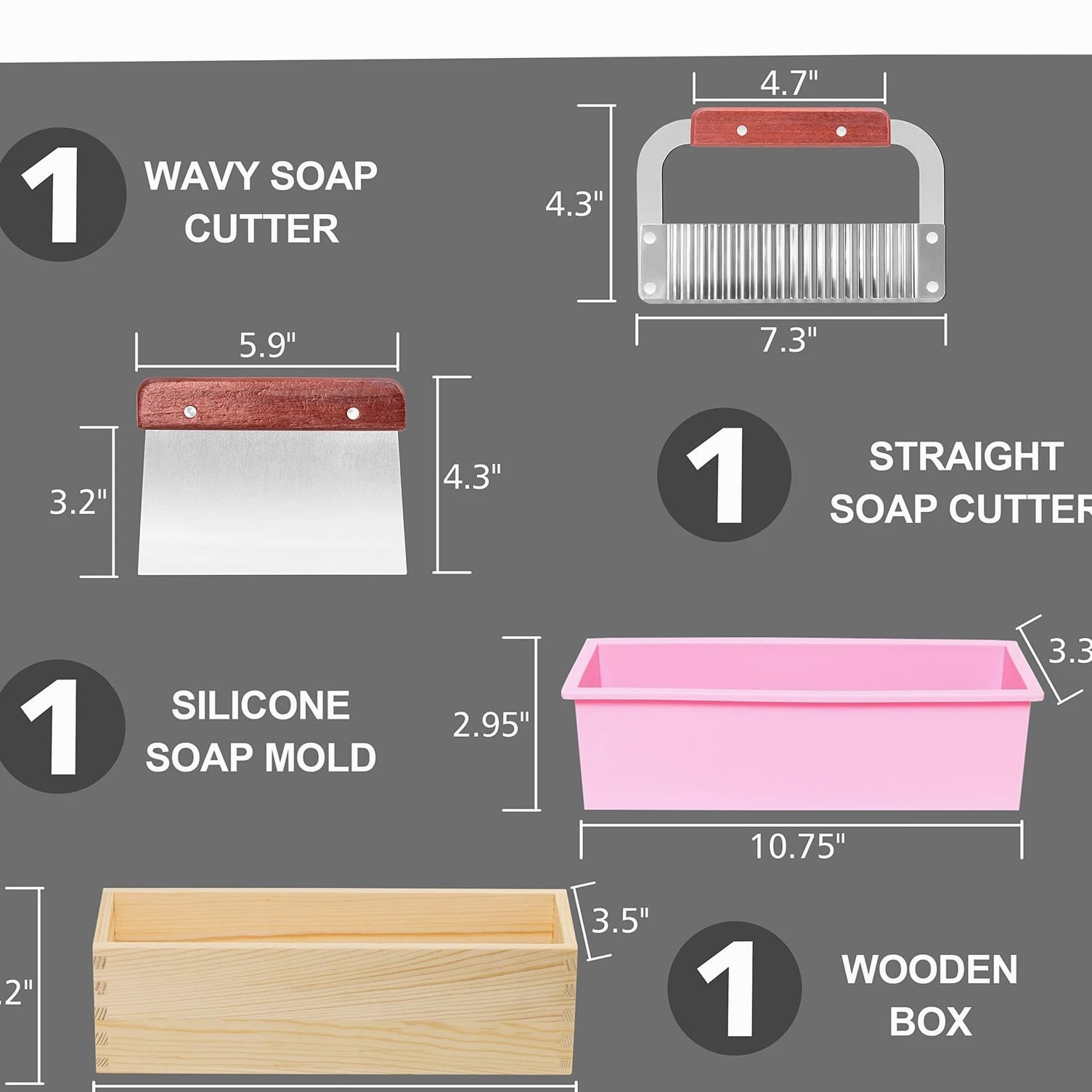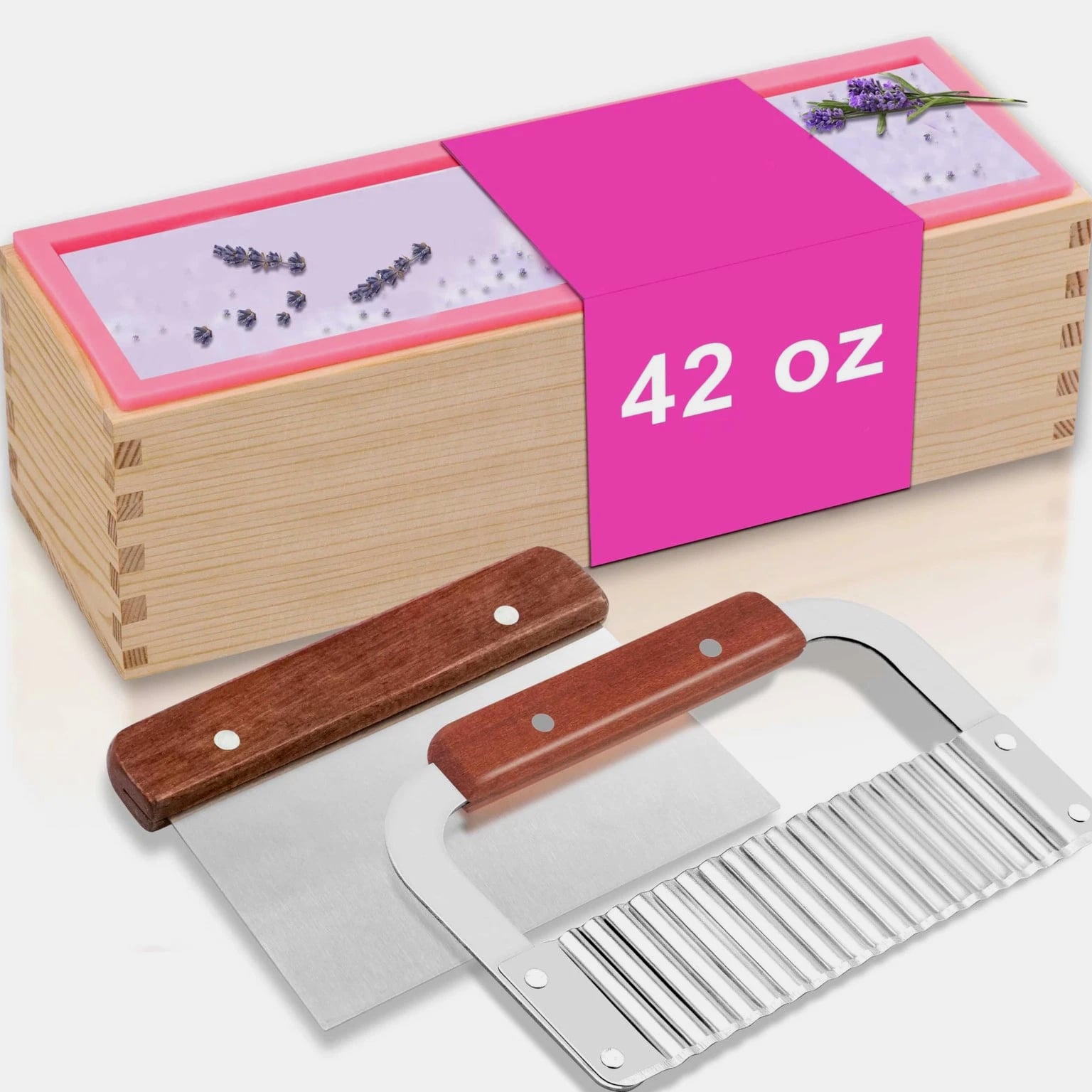 Soap Making Kit - Rectangular Silicone Mold 42oz, Wavy Cutter, Wood Box, Silver