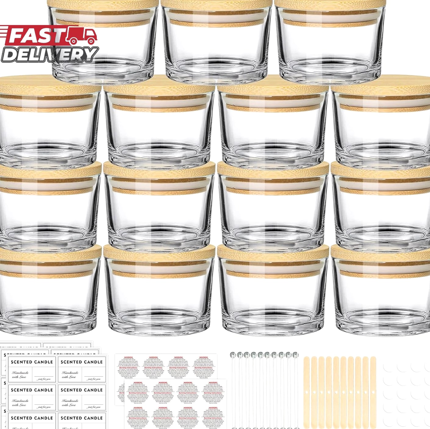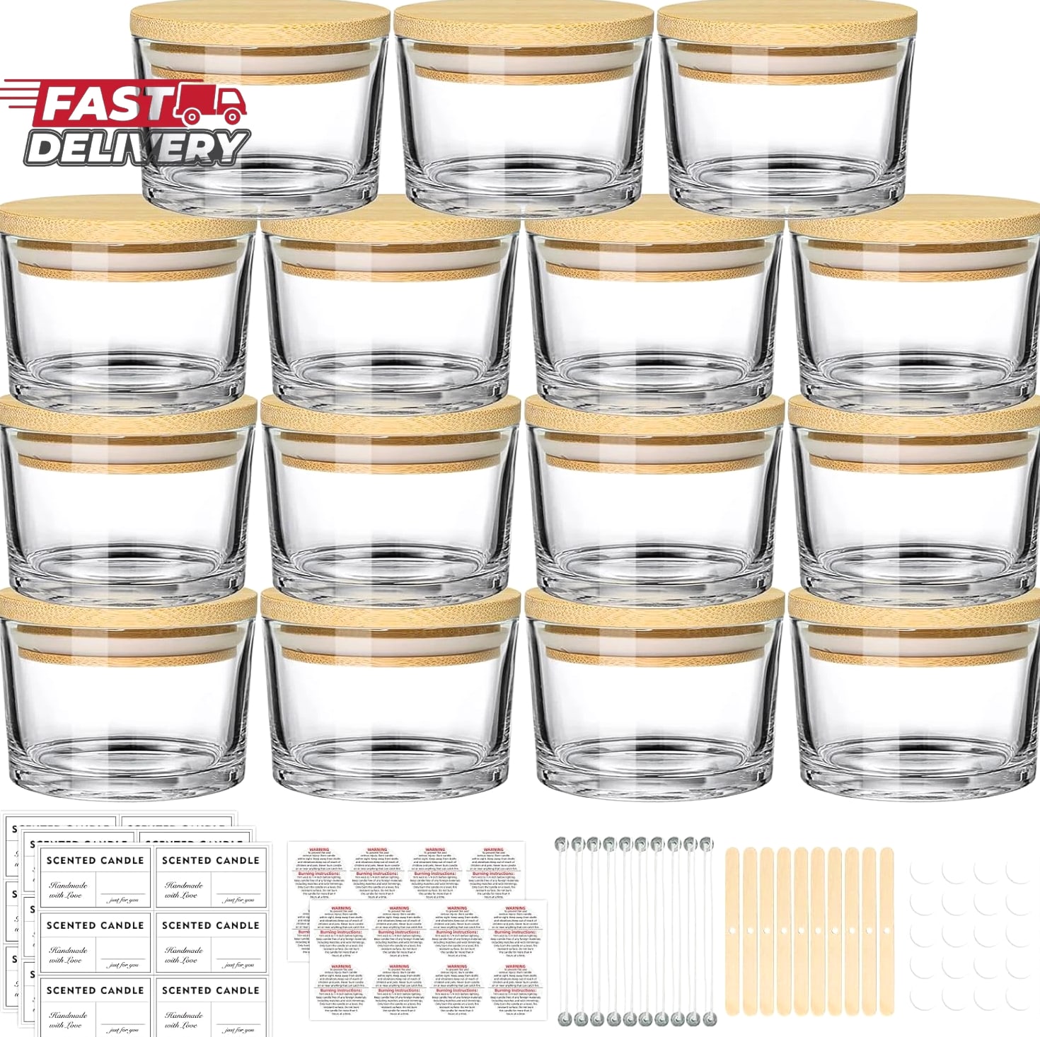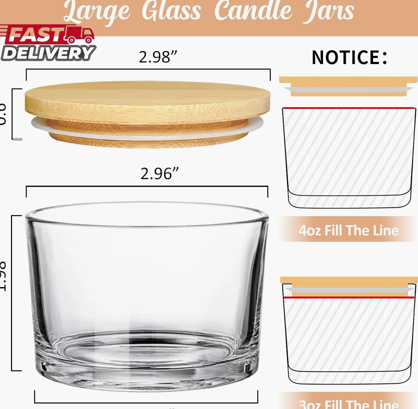 CANDLE MAKING SUPPLIES: The kit includes 15 wide-mouth candle making jars with lids, 20 candle wicks kit, 18 candle stickers, and 16 candle warning labels. Suitable for DIY homemade candle starters and candle business. HIGH QUALITY & EASY CLEAN: Our candle containers feature a thickened glass bottom and glass walls of 0.14", making them heat-resistant, strong, not easily breakable, and reusable. Additionally, glass candle jars are dishwasher safe and easy to clean by hand. SAFE NATURAL MATERIAL: Crafted with premium quality thick glass, food grade and lead-free, durable and stronger than ordinary glass. The lids are safe to use, not easy to get deformed or break GLASS JARS FOR CANDLES WIDELY APPLICABLE: Our 4oz candle vessels come with beautifully designed stickers and a candle wicks kit, suitable for 3/3.5/4/4.5oz candles. With your candle inside, they can perfectly decorate your home. Additionally, they can hold store spices, teabags, or coffee beans. BETTER SERVICE: SUPMIND committed to providing all customers with higher quality products and satisfactory shopping experience. If you have any questions about our glass candle jars, please contact us! We provide good customer service. Product description The video showcases the product in use. The video guides you through product setup. The video compares multiple products. The video shows the product being unpacked. 4oz Clear Empty Candle Jars with Bamboo Lids Merchant Video