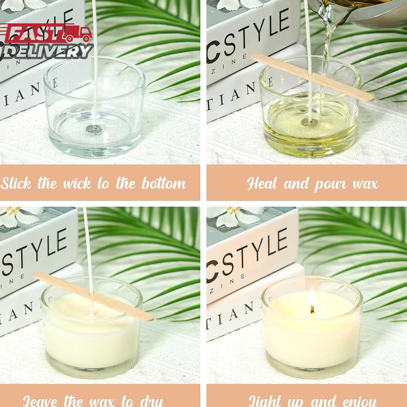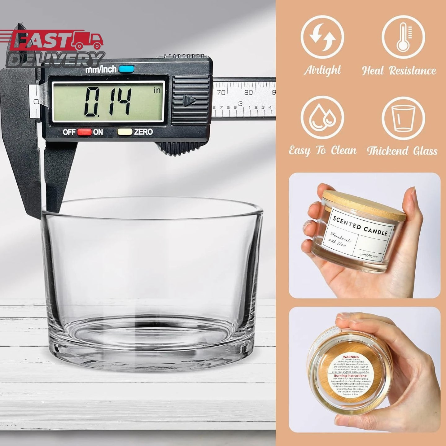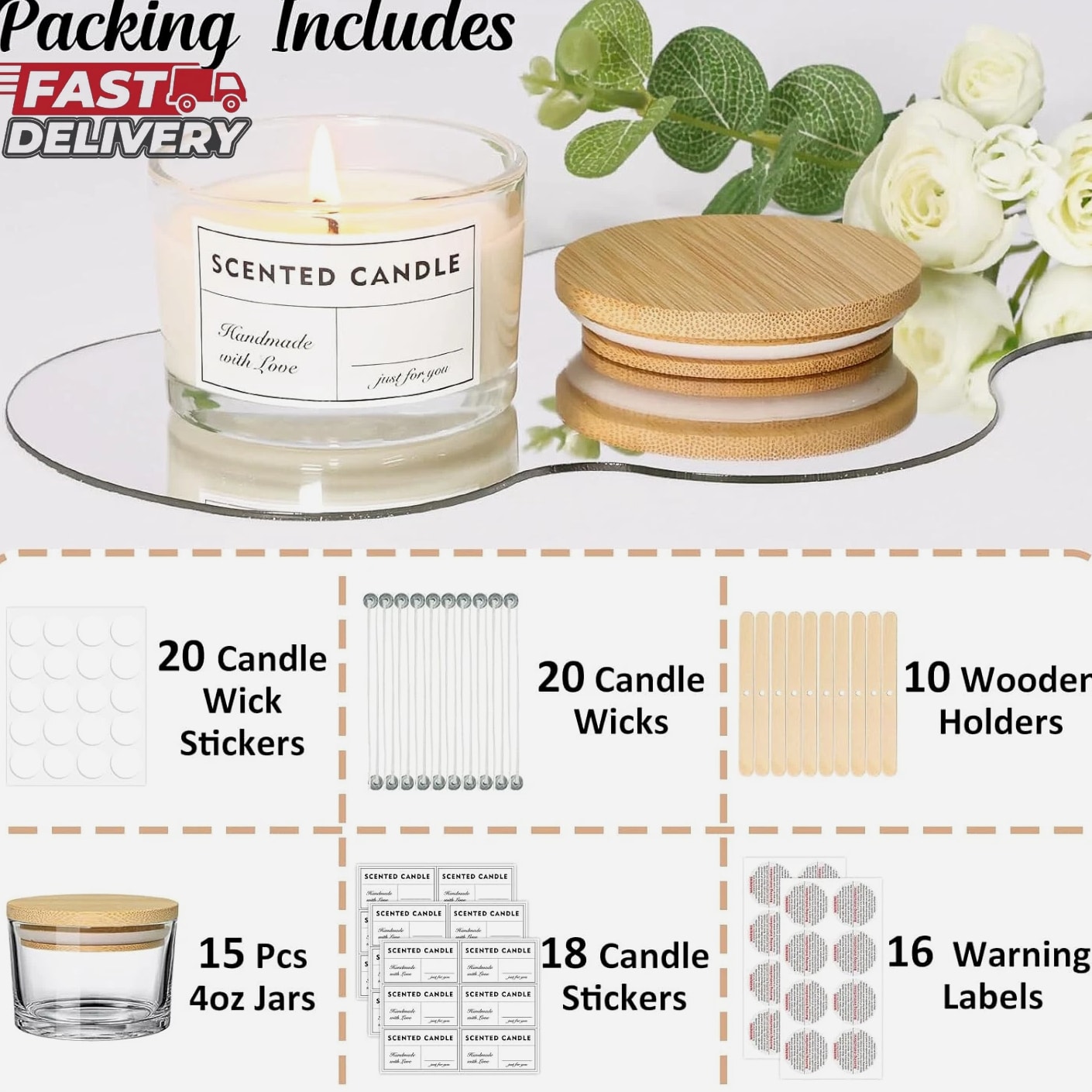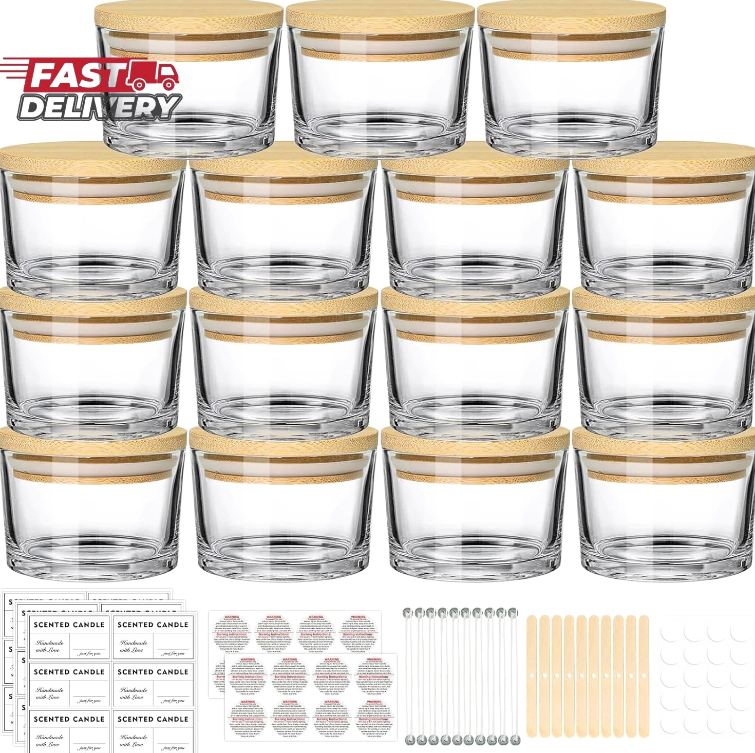 CANDLE MAKING SUPPLIES: The kit includes 15 wide-mouth candle making jars with lids, 20 candle wicks kit, 18 candle stickers, and 16 candle warning labels. Suitable for DIY homemade candle starters and candle business. HIGH QUALITY & EASY CLEAN: Our candle containers feature a thickened glass bottom and glass walls of 0.14", making them heat-resistant, strong, not easily breakable, and reusable. Additionally, glass candle jars are dishwasher safe and easy to clean by hand. SAFE NATURAL MATERIAL: Crafted with premium quality thick glass, food grade and lead-free, durable and stronger than ordinary glass. The lids are safe to use, not easy to get deformed or break GLASS JARS FOR CANDLES WIDELY APPLICABLE: Our 4oz candle vessels come with beautifully designed stickers and a candle wicks kit, suitable for 3/3.5/4/4.5oz candles. With your candle inside, they can perfectly decorate your home. Additionally, they can hold store spices, teabags, or coffee beans. BETTER SERVICE: SUPMIND committed to providing all customers with higher quality products and satisfactory shopping experience. If you have any questions about our glass candle jars, please contact us! We provide good customer service. Product description The video showcases the product in use. The video guides you through product setup. The video compares multiple products. The video shows the product being unpacked. 4oz Clear Empty Candle Jars with Bamboo Lids Merchant Video