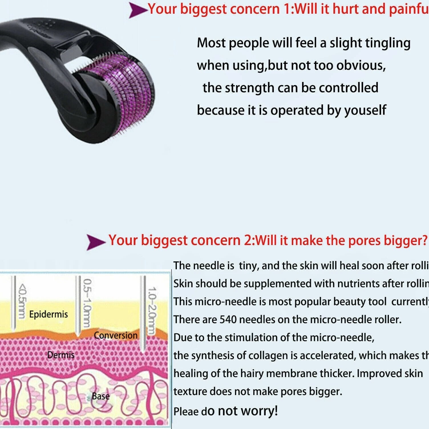 Derma Roller for Hair Loss, Beard Growth 540 0.5-2.0mm Microneedle Dermaroller