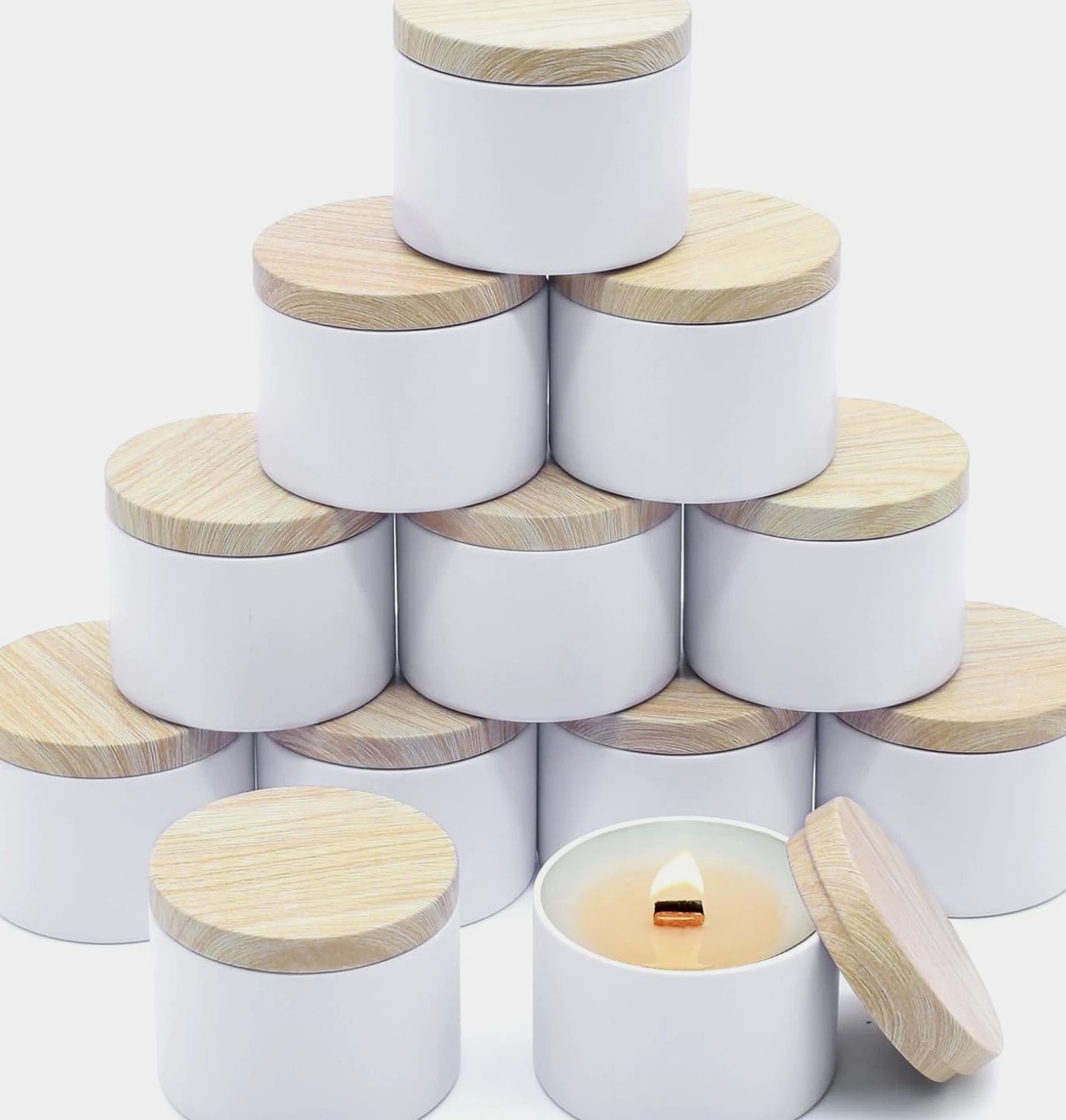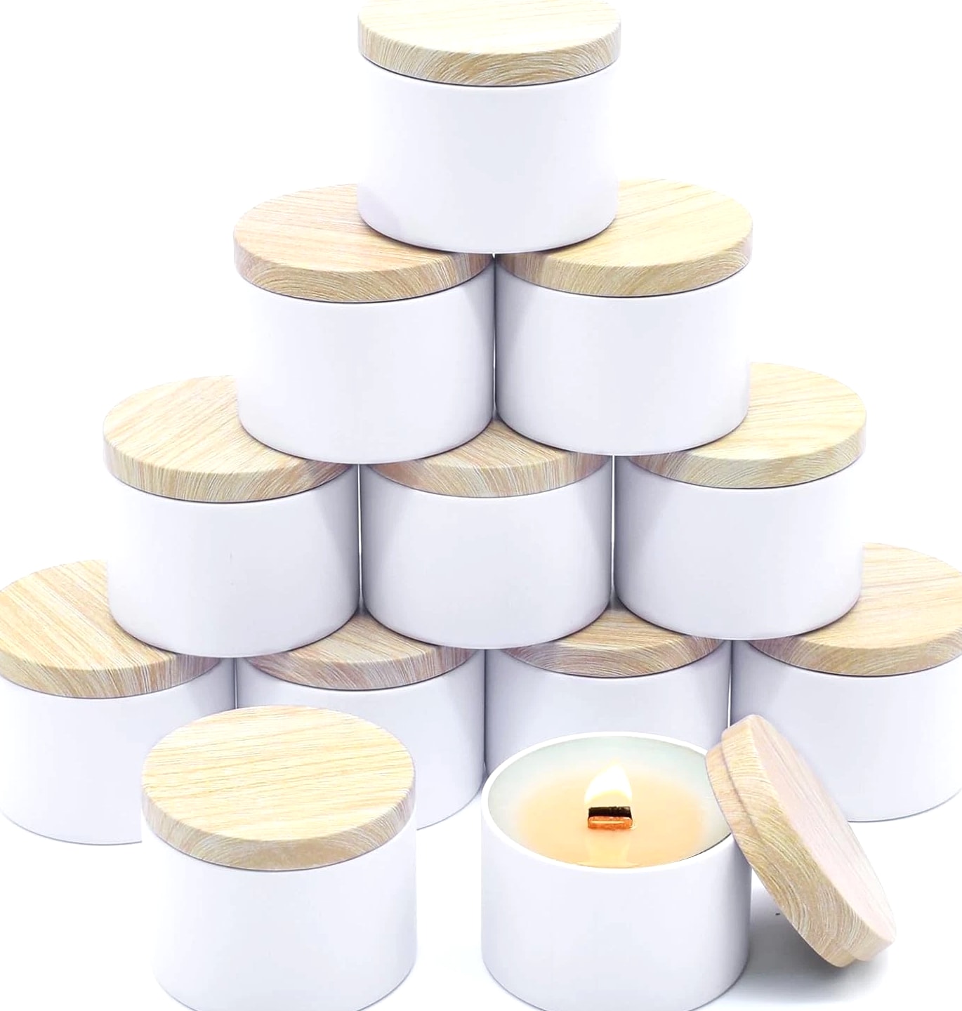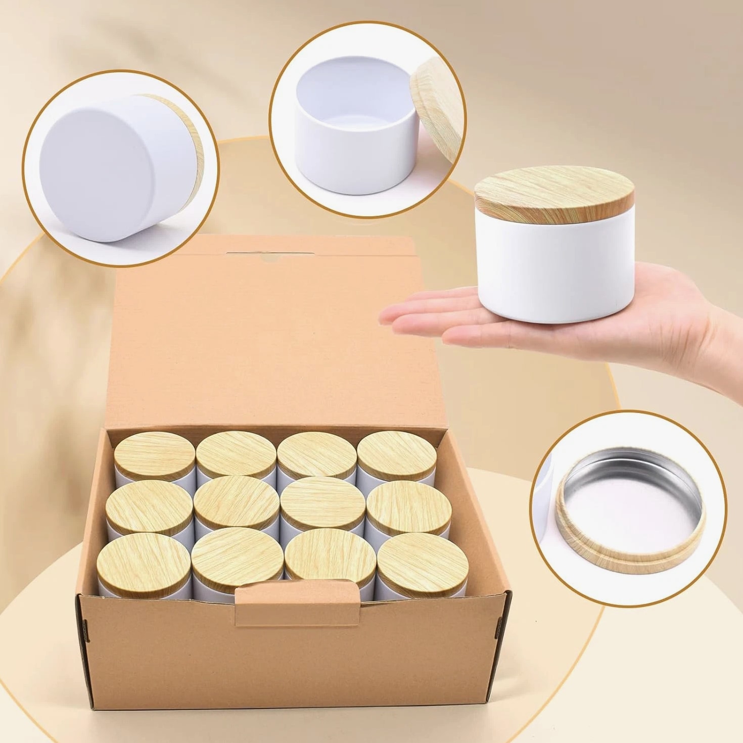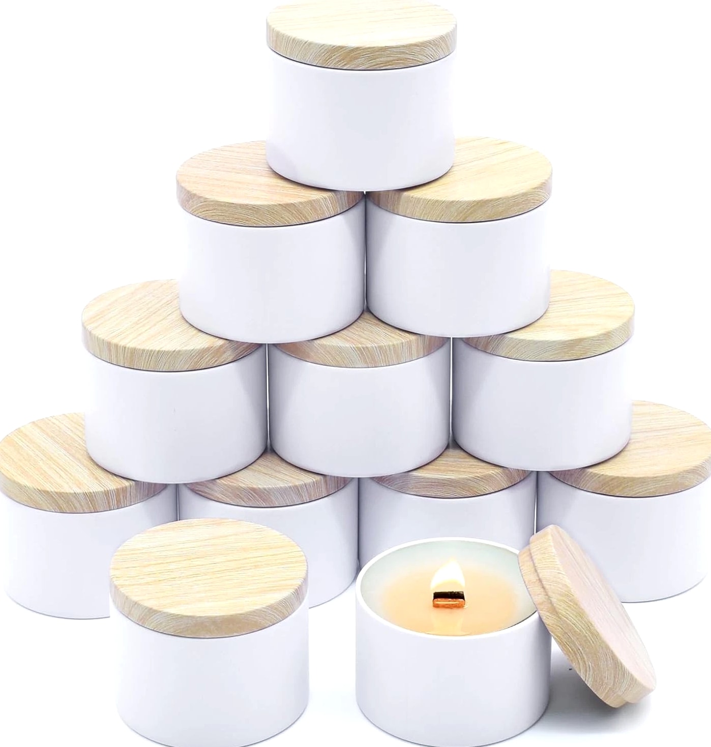 12 Pack 8 Oz Candle Jars with Metal Wood Grain Lids Empty Candle Making Containers Description Item model number candle jars for making candles Number of Items 12 Color White Tins with Metal Wood-Grain Lids Product Dimensions 3.15 x 3.15 x 2.4 inches Material Metal Item Weight 1.57 pounds Size 12pcs 8oz Capacity: 8oz =235ml; Dimensions : 3.15" (Diameter) x 2.35" (Height); Comes with 12pcs 8oz candle tins with lids for variety in your candle making projects; these 8oz tins for making candles are perfect gifts for Christmas, Birthday, Mother's day etc. High Quality Metal Candle Tins: Each candle container is made of premium iron/ tinplate, lightweight, heat resistant, withstands drops and bumps better than glass jars. the cylinder shape distributes heat evenly for longer burn times, while the seamless and leakproof lids can preserve the scent and keeps the candle fresh Premium Matte White Design: The all-white, matte-finish candle jars with metal wood-grain printing lid is simply beautiful and textured. Uniquely colored white extends the finish/color to the inside, so these small candle jars can create a professional-looking appearance, great for your own candle business Perfect for DIY Candle Making Projects: These candle making tins are easy to label, both on the top and side. In your business, they can make great samples and giveaways, especially the smaller sizes. Also the empty candle jars are great storage containers for craft projects and other small items: teas, herbs, spices, coffee, confectionery and much more Easy to Use & Clean: Candle vessels from YJHSS-US's candle making supplies work great for beginners, and the jars for candles can be easily cleaned with soap and water after use, allowing them to be repurposed 12pcs 8oz Candle Jars for Making Candles, 12-Pack Candle Tins with Lids, 8 oz Candle Tins for Making Candles Quality Materials Lightweight candle containers are made of fine metal, light weight, durable and is hard to dent, heat, corrosion resistant, withs