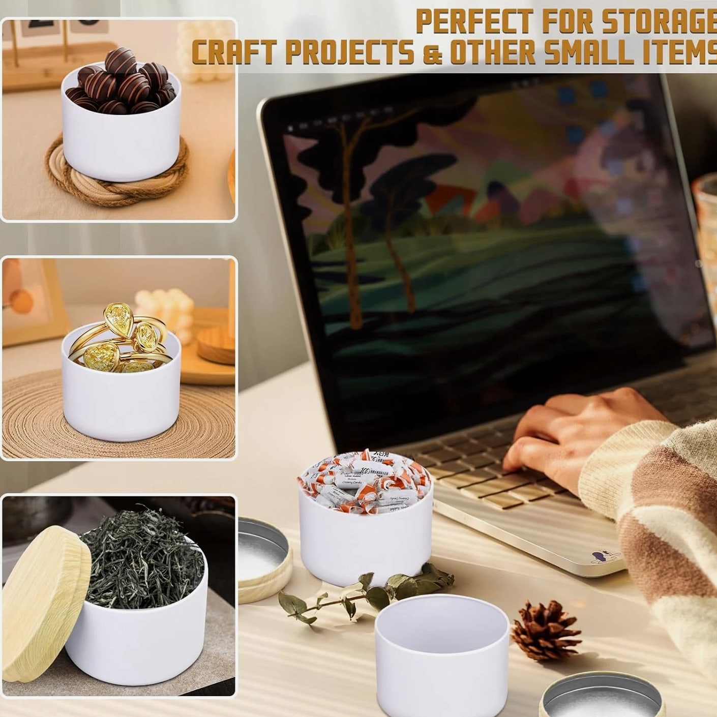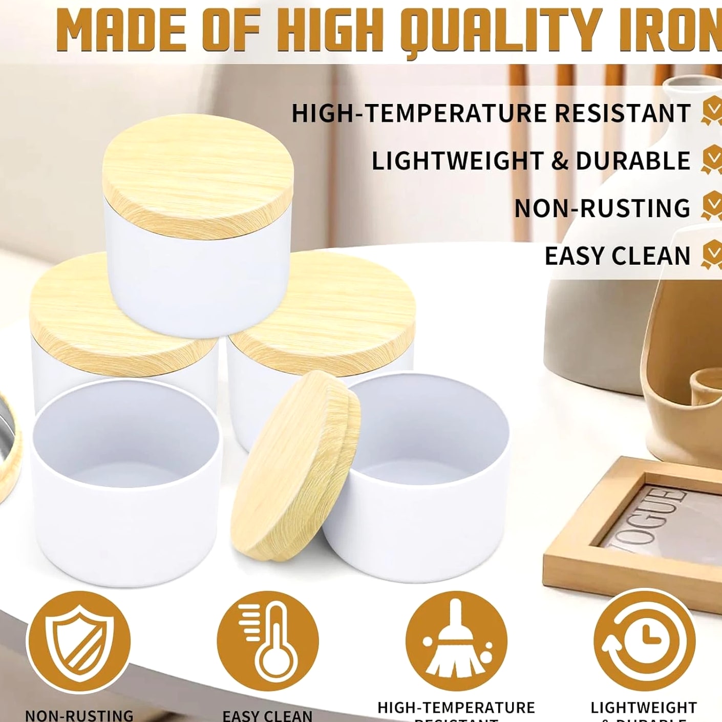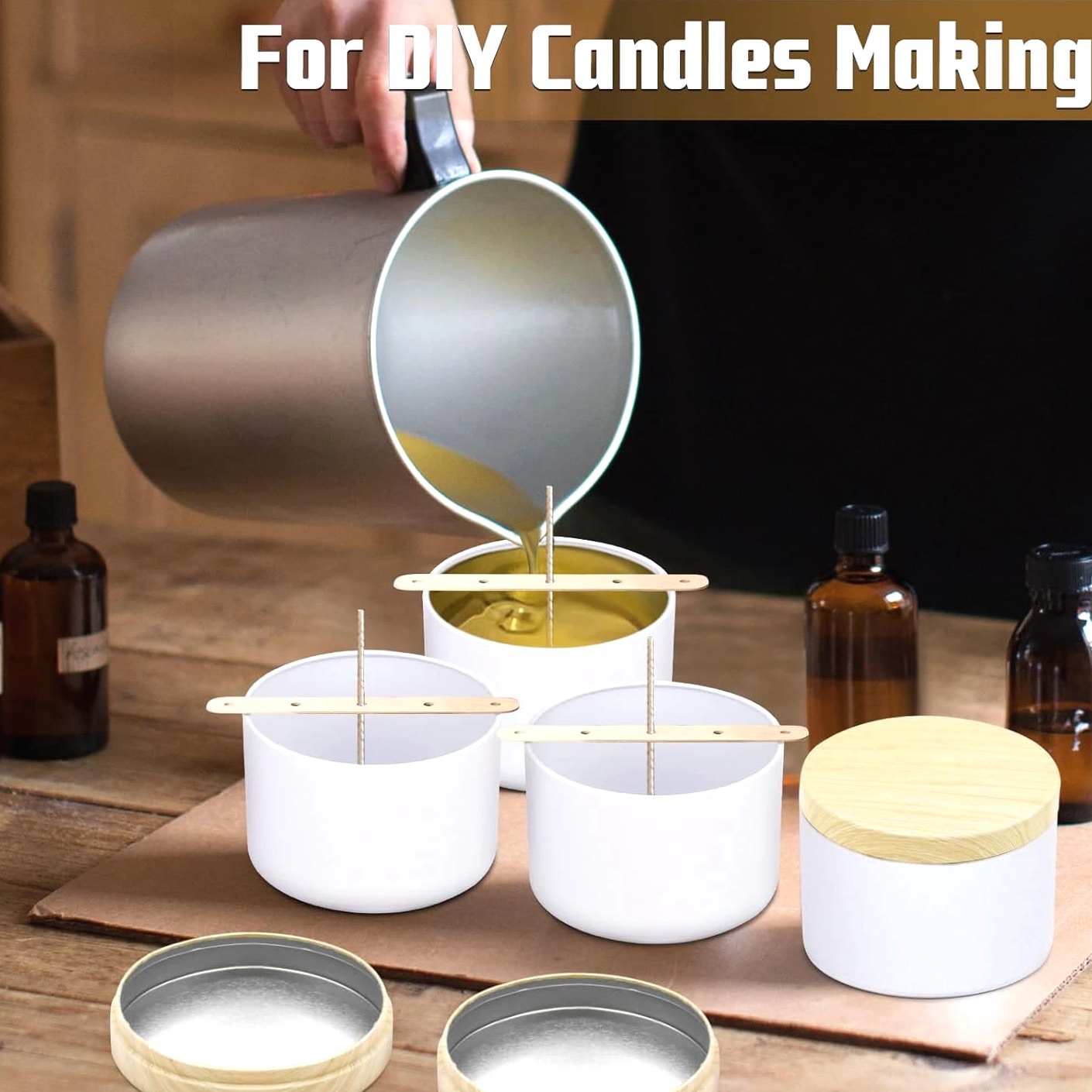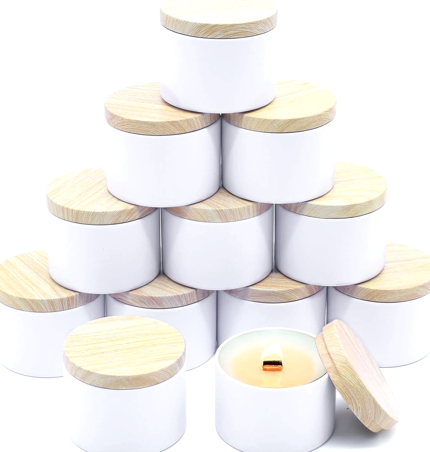 12 Pack 8 Oz Candle Jars with Metal Wood Grain Lids Empty Candle Making Containers Description Item model number candle jars for making candles Number of Items 12 Color White Tins with Metal Wood-Grain Lids Product Dimensions 3.15 x 3.15 x 2.4 inches Material Metal Item Weight 1.57 pounds Size 12pcs 8oz Capacity: 8oz =235ml; Dimensions : 3.15" (Diameter) x 2.35" (Height); Comes with 12pcs 8oz candle tins with lids for variety in your candle making projects; these 8oz tins for making candles are perfect gifts for Christmas, Birthday, Mother's day etc. High Quality Metal Candle Tins: Each candle container is made of premium iron/ tinplate, lightweight, heat resistant, withstands drops and bumps better than glass jars. the cylinder shape distributes heat evenly for longer burn times, while the seamless and leakproof lids can preserve the scent and keeps the candle fresh Premium Matte White Design: The all-white, matte-finish candle jars with metal wood-grain printing lid is simply beautiful and textured. Uniquely colored white extends the finish/color to the inside, so these small candle jars can create a professional-looking appearance, great for your own candle business Perfect for DIY Candle Making Projects: These candle making tins are easy to label, both on the top and side. In your business, they can make great samples and giveaways, especially the smaller sizes. Also the empty candle jars are great storage containers for craft projects and other small items: teas, herbs, spices, coffee, confectionery and much more Easy to Use & Clean: Candle vessels from YJHSS-US's candle making supplies work great for beginners, and the jars for candles can be easily cleaned with soap and water after use, allowing them to be repurposed 12pcs 8oz Candle Jars for Making Candles, 12-Pack Candle Tins with Lids, 8 oz Candle Tins for Making Candles Quality Materials Lightweight candle containers are made of fine metal, light weight, durable and is hard to dent, heat, corrosion resistant, withs