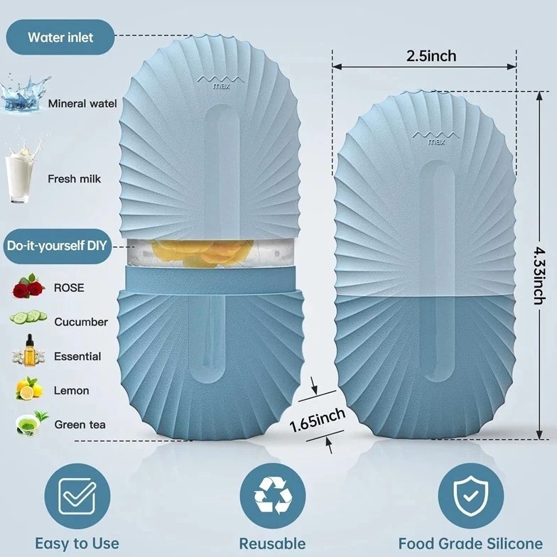 Specifications Material Plastic High-concerned chemical None Size 4.5mm Power Source None Item Type Other Number of Pieces One Unit Silicone Ice Mold for Face Beauty Ice Roller for Face Ice Roller for Eye Ice Cube Roller Massager Ice Facial Cube Facial Beauty Ice Roller Face Ice Cube Face Ice Massage Roller Face Ice Massage Roller Skin Beauty Facial Roller Remove Dark Circles Silicone Ice Face Roller Contour Shrink Pores Cold Compress Massage Ice Rolling Face Ice Tray Mold Cube Description Warm Tips: 1. Don't pour the water too full, and keep the connection without water overflow before freezer. 2. Wait a few minutes or rinse with water for 1-2 mins to loosen the lid before opening. Features: 1. High Quality Material This ice roller for face is made of high-quality silicone material, BPA-free; Durable and reusable ice face cube which is leak-proof and will not deform when washed. 2. Facial Ice Roller Our ice roller for face is a skincare tool that helps you improve skin problems and skin health, which is suitable for all skin types. It has multiple functions such as beauty, cleansing. We suggest using your ice cube each morning for an instant wake up for improving tired skin, giving your face a healthy glow. 3. Customize Preferences Facial ice roller can enhance the skin care effect as per your creativity and customized formula according to your specific skin needs, such as lemonade for whitening, and coconut for improving skin. Even you can use a juicer to squeeze them into juice, then add water, essential oils, and roses to the ice tray. 4. Easy to Use After filling and freezing for three to four hours, you can take it out of the refrigerator to thaw or soak it in hot water for a while, and then you can easily open it for use. Make sure not to fill the mold up completely because water expands when it's cold. To use, apply ice to skin in circular motions every 30 seconds. NOTE: Water droplets may be generated during use, please prepare a dry towel in advance. Small and L