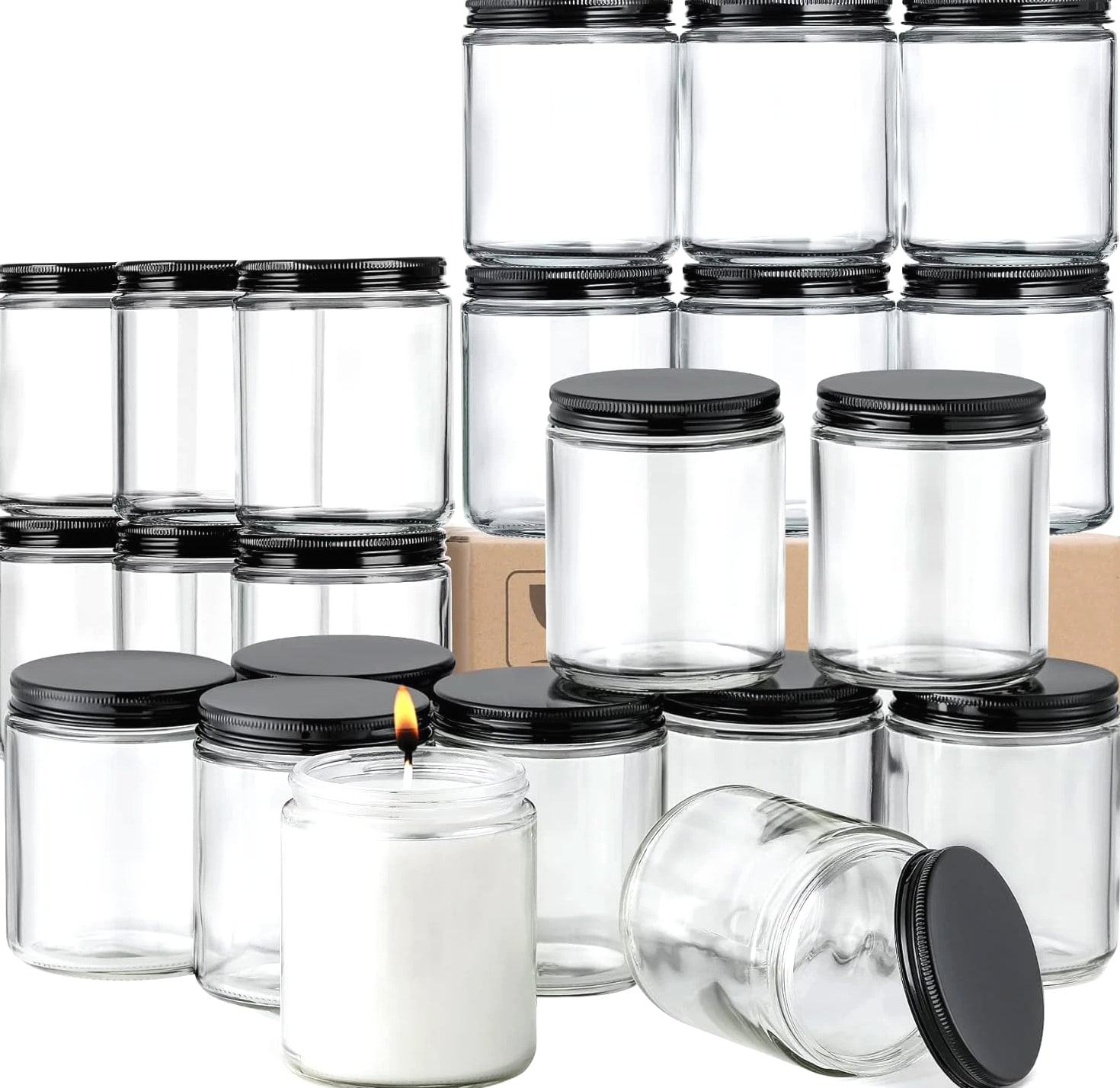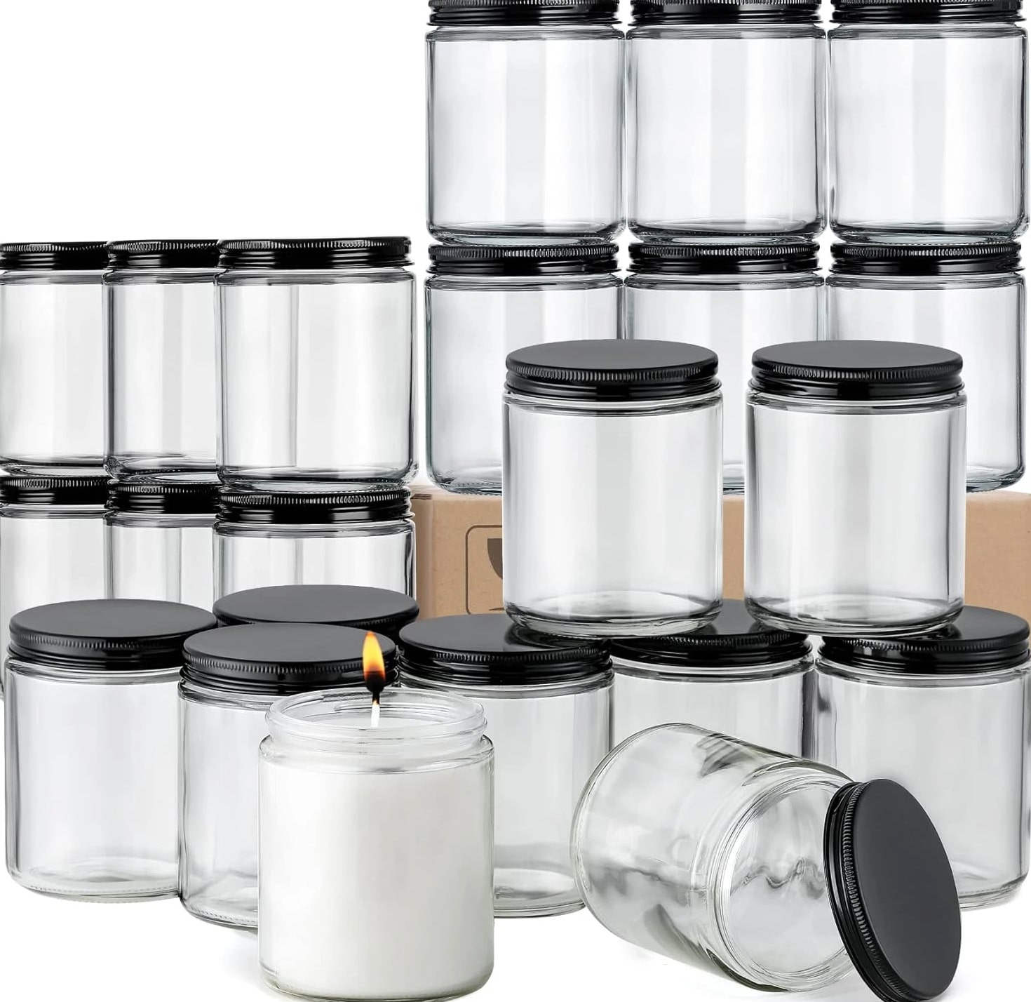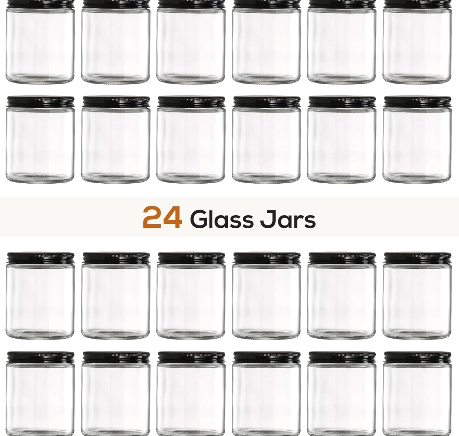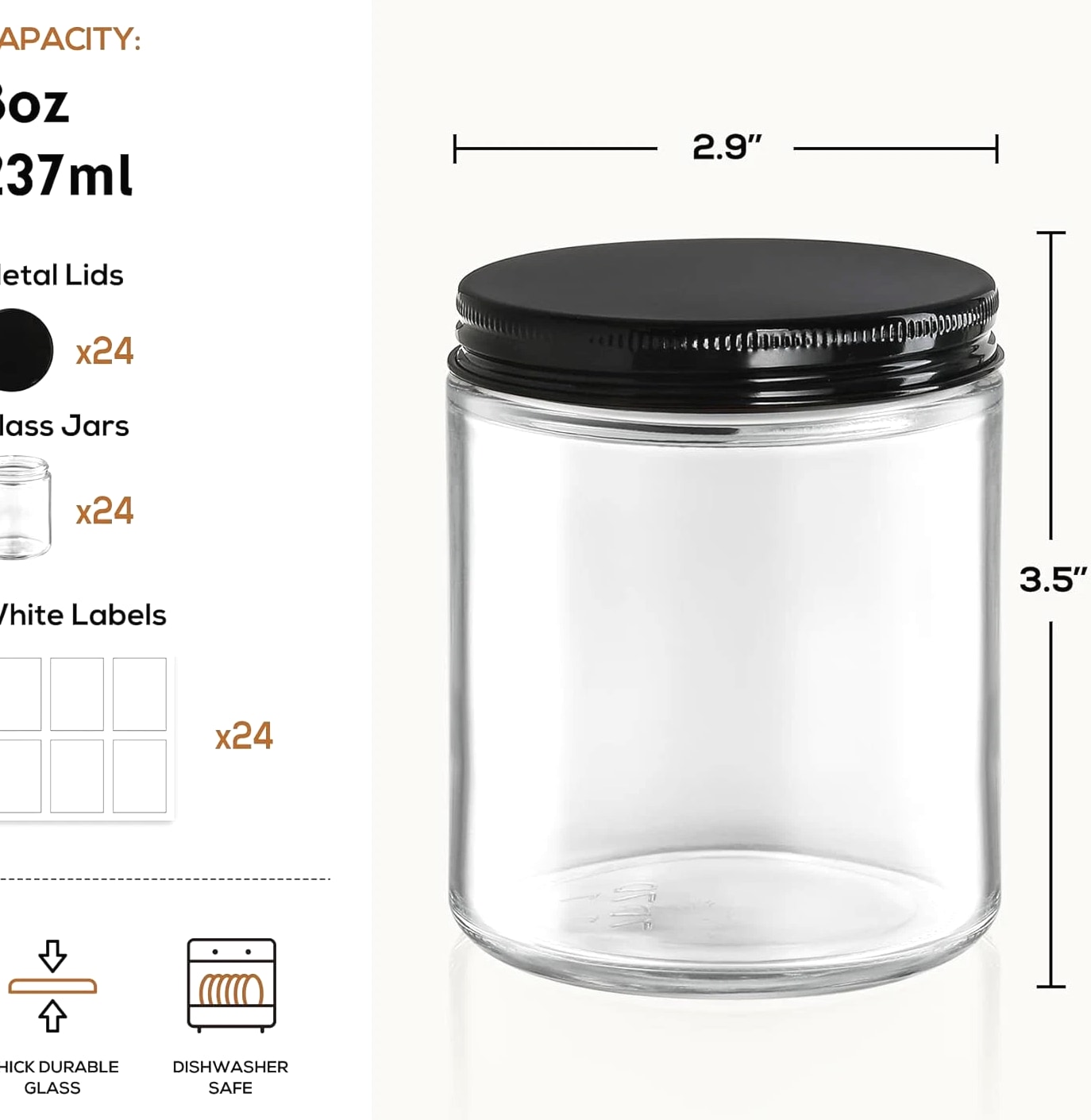 24 Pc, 8 OZ Thick Glass Jars with Metal Lids, Clear Round Candle Making Jars, Empty Food Storage Containers, Mason Canning Jar for Spice, Powder, Liquid, Sample, Lotion, Cosmetic, Dishwasher Safe Description Item model number Z99-24AZCLEAR Capacity 240 Milliliters Number of Items 24 Closure Type Screw Batteries Included? No Is Microwaveable Yes Unit Count 24.0 Count Batteries Required? No Item Volume 240 Milliliters Product Dimensions 2.9"L x 2.9"W x 3.5"H Material Glass Item Form Round Container Shape Round Material Type Free Lead Free Item Package Quantity 24 Is Dishwasher Safe Yes Item Weight 8 ounces Material Feature Freezer Safe, Microwave Safe, Oven Safe, Dishwasher Safe, Reusable Special Features Air Tight, Dishwasher Safe Part Number Z99-24AZCLEAR Color Clear Shape Round Recommended Uses For Product candle making jar, spices food liquid storage jar Product Care Instructions Dishwasher Safe ★Product Includes - 24 pcs 8oz (240ml) clear round glass jar + 24 black metal lids + 24 white labels. ★Safe Packaging - These jars are packaged in bubble bags with grid-shaped partitions and thick carton box to prevent damage in transit. ★Thick Glass - Strong, dishwasher safe, high temperature resistant. ★Airtight Lids - Lids are lined with a thin foam sheet to ensure airtight seal. No worry about leaking while traveling with them. ★Various Uses - Act as small/mini mason jars or sample bottle. You can store solid, liquid or powder, such as spice, salt, pepper storage, candle making, ointments, handmade lotion, honey, cosmetic jars, glass baby food storage and more. Product description Safe Packaging These jars are packaged in bubble bags with grid-shaped partitions and thick carton box to prevent damage in transit. Airtight - Leakproof Lids are lined with a thin foam sheet to ensure airtight seal. Dishwasher Safe Thick Glass - Strong, dishwasher safe, high temperature resistant.