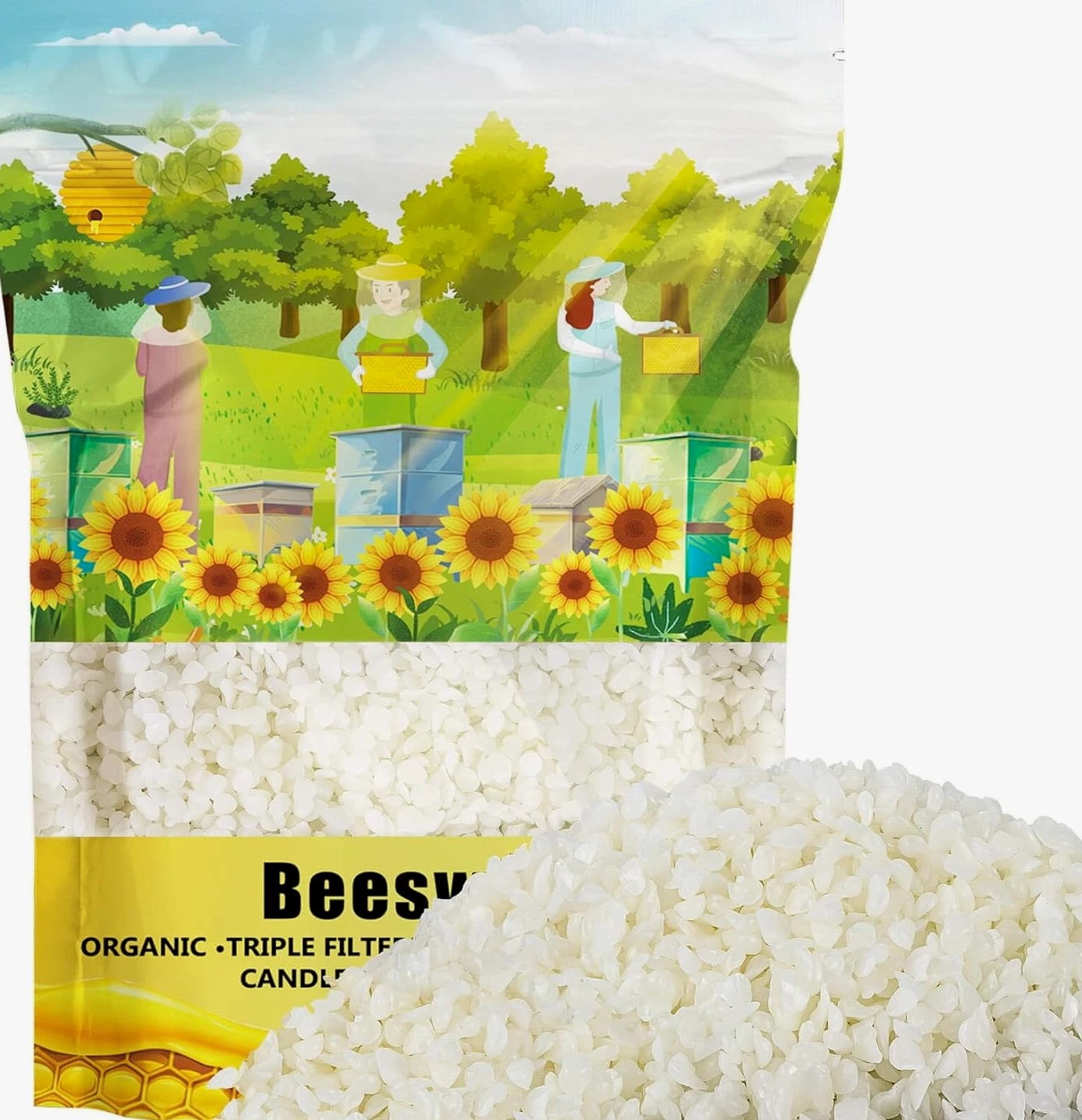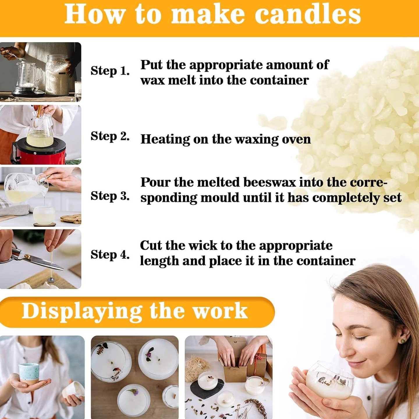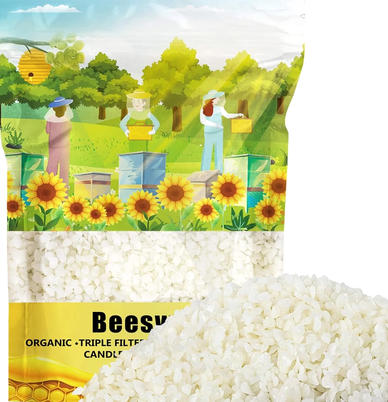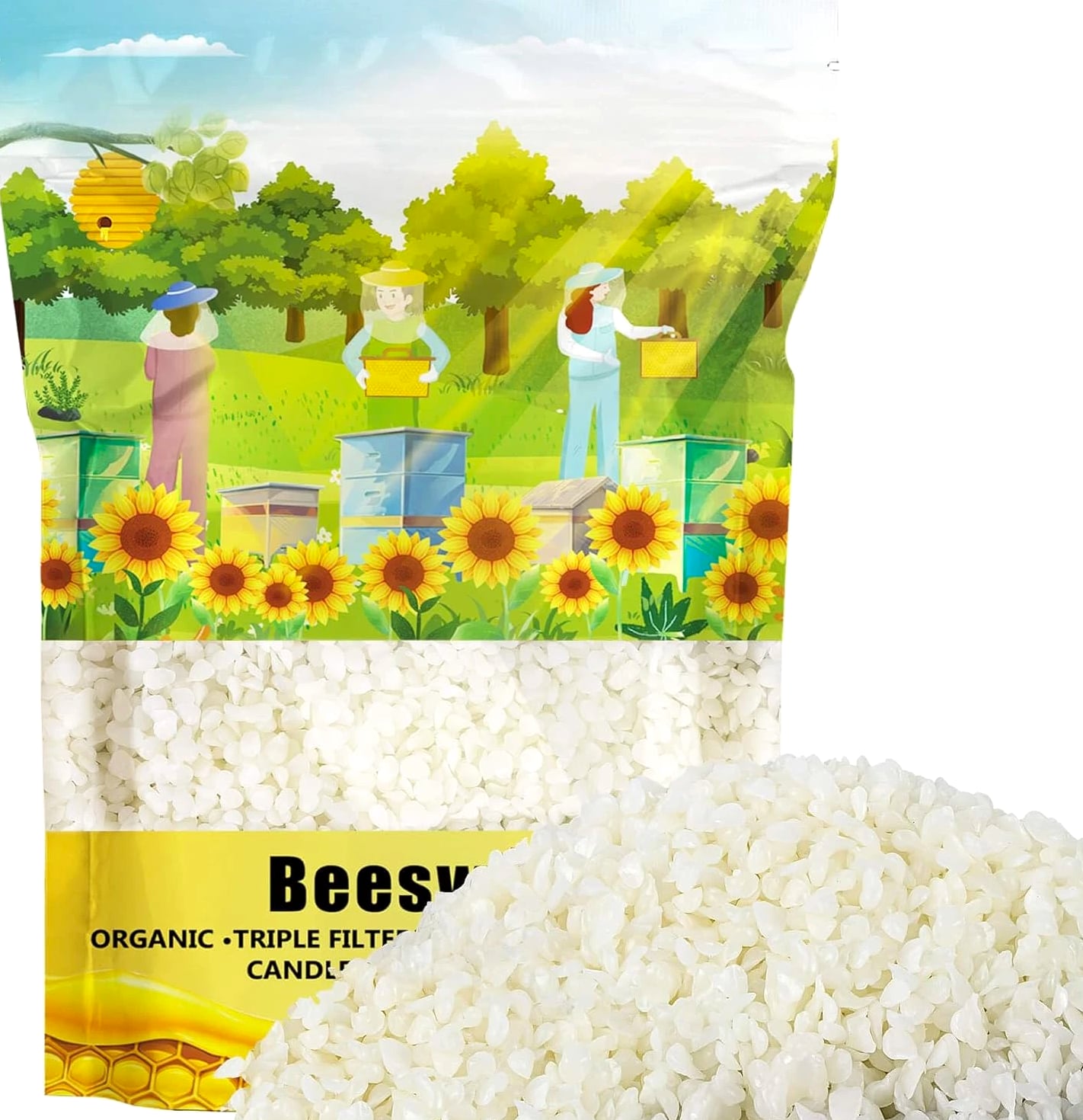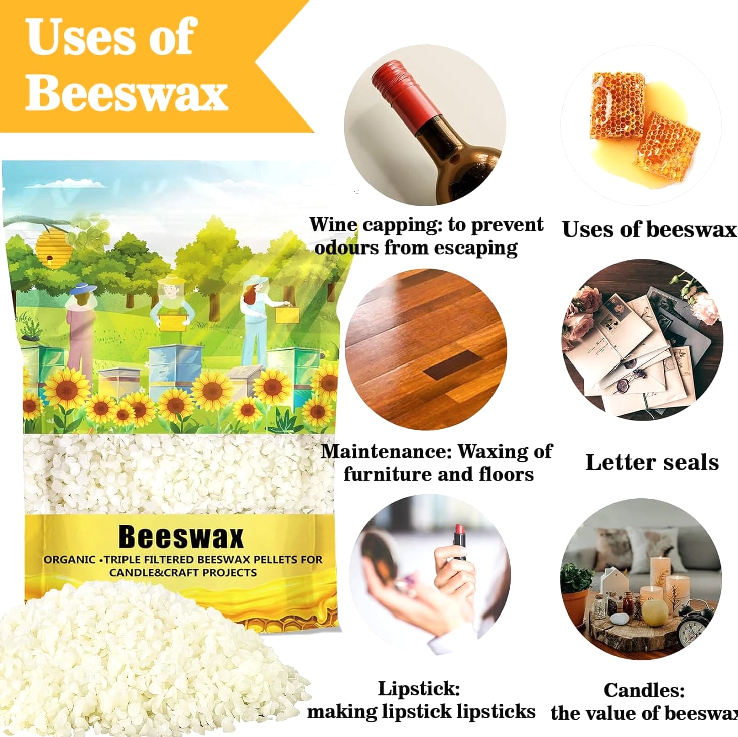 White Beeswax Pellets - 428G Beeswax Pastilles Bulk Bees Wax Pellets Triple Filtered for DIY Making Candles, Skin Care, Lip Balm, Soap, Lotion and Soap Making Supplies Description Item Weight: 15.2 ounces Product Dimensions: 0.1 x 0.1 x 0.1 inches Package Included: This package contains 428g (0.95lb) white pure beeswax pellets; variations of 1-10 g may occur. These organic beeswax pellets are perfect for using small amounts or experimenting with new homemade recipes and mixing with essential oils to make beeswax candles, beeswax wood polish, beeswax for skin care, beeswax for sewing thread and more. Beeswax Pellets: Our premium beeswax pellets have been purified by removing pollen, propolis and other impurities, free from paraffin, soy, palm wax, and any harmful additives. These beeswax pastilles are biodegradable and sustainably sourced. Elevate your life with the comforting feeling of high-quality beeswax, enhancing your lifestyle and the environment. Beeswax for Skin Care: Discover the benefits of bee wax organic for skin! Our beeswax pellets for skin are not only a wonderful source of Vitamin A but also act as powerful antioxidants. The unique properties of beeswax help lock in moisture, providing a protective barrier for your skin against harsh elements. Ideal for DIY cosmetics, our organic beeswax for skin is perfect for crafting your own lip gloss, hand creams, and lotions. Bees Wax for Candles Making: As the premier choice for candle-making, bee wax is the only completely carbon-neutral option available. Experience improved burn efficiency with a larger, brighter flame that fills your space with the natural sweet scent of warm honey from our beeswax pellets. These beeswax tealight candles made from our pure beeswax not only create a cozy atmosphere but also purify the air by neutralizing positive ions, promoting a healthier environment. Use as Natural Protective Finish: Organic beeswax can form a protective layer. You can use it for polishing.