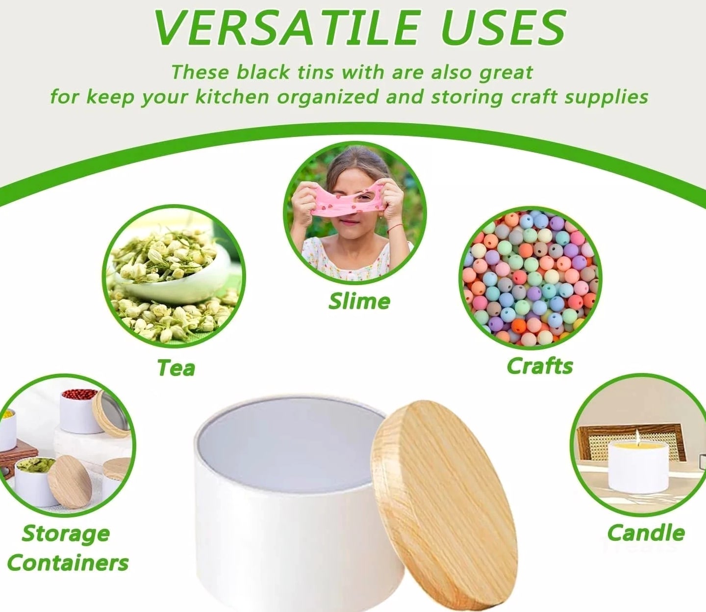 【Large Dimension & Capacity】: Dimensions: 2.58" (Diameter) x 2.05" (Height) white round metal candle tin. Capacity: 4 oz = 1 cup = 118 ml. One pack includes 24 pcs 4oz white empty candle jars and 24 pcs wood-grain lids. 【High Quality Metal Storage Containers】: The candle tin with lid is made of high-quality tinplate, lightweight and durable, heat and corrosion resistant, withstands drops and bumps better than glass jars. The white candle tin features a seamless, one-piece leak-proof design that not only prevents leaks, but also effectively retains the fragrance of handmade candles. Great for DIY candle making projects and can be reused or recycled. 【Attentive Design】: The candle jar is designed with an all-round matte finish to provide comfortable touch. And the candle tin is designed as a single piece with a tight seam between the jar and the lid, which ensures that the entire candle tin is well sealed. What's more, it has no sharp edges that won't hurt your hands during use. 【Versatile Candle Tin Containers】: The white candle tin not only can be used to make a variety of handicrafts with the family, but also be used to DIY candles as gifts for lover and friends on anniversaries, birthdays and parties. Additionally, the white candle tin also serves as container for small items, such as tea leaves, coffee beans, mini hair clips, jewelry and so on. 【Satisfactory After-sales Services】: Value for money guaranteed, if you have any dissatisfaction with the white candle tins for any reason, you can contact us for a free replacement or money back guarantee. This product is a set of 24 round white candle tins with matte metal lids that have a wood grain design. Each tin has a capacity of 4oz (118 milliliters) and measures 2.58" in width and 2.05" in height. These tins are perfect for making homemade candles and can be used for storage and organization purposes in the kitchen. These tins are not dishwasher safe but their compact size makes them easy to clean