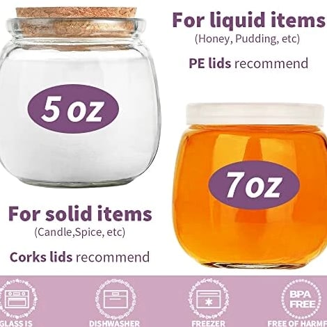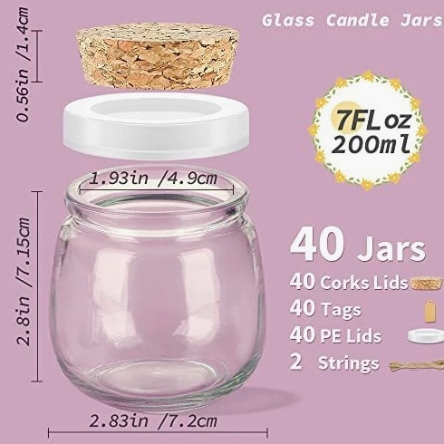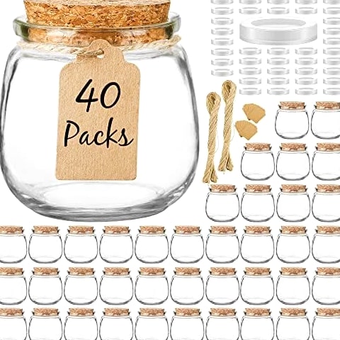 Package Includes: 40 x Glass jars; 40 x PE Lids; 40 x Cork Lids; Tag strings; Size: Each jar measuring 2.87"D x 2.75"H with an opening of 1.9" Features They're made with heavy-duty durable, food-grade glass and comes with two different lids for various occasions. These storage jars can be put into the baking and microwave oven, safe and healthy. The lid is not recommended. You can hold jam, jelly, wedding favors, spices, honey, cosmetics or homemade candles with the storage jars. You can paint and decorate the classic jars however you want and use them to create party lights. Each set comes safely packaged in a box with dividers to prevent breakage during shipping. Note: You need to soak this yogurt cup with warm water. Do not directly put into hot water as it will cause cracking. 【6 kinds of accessories】- Perfectly satisfying your daily lifestyle demands. 40 PE lids + 40 cork lids + 40 paper tag + 1 twine(131 ft)+ 40 pcs 7 oz pudding jars, each measuring are H: 2.82", an opening of 1.9" 【Great Gift Jar】 - The small yogurt jars with cork lids looks very aesthetic and cute, perfect for party favors, wedding favors, shower favors, fill with mousse, small desserts, candies. Decorate with twine and tag fill with homemade candles, body salt, sugar scrub, personality and stylish. 【Airtight PE Lids】- The yogurt container with PE lid is sealed tight, leak-proof, keep your food fresh for longer, suitable for yogurt, pudding, jelly, milk, jam, nuts, snacks, spices and more. Small size but million use. 【High-Quality Glass】- These small mason jars made of high-quality food-grade glass, BPA free, preservative and high temperature resistance, reusable, easy to clean, can be put the mini mason jars into the microwave oven, dishwasher safe. 【Decoration & Organization】- Adorable appearance, you can use it to decorate your home and organize your kitchen, save space, keep your kitchen clean & tidy. Also you can make a craft or decorate it at will, it would look beautiful