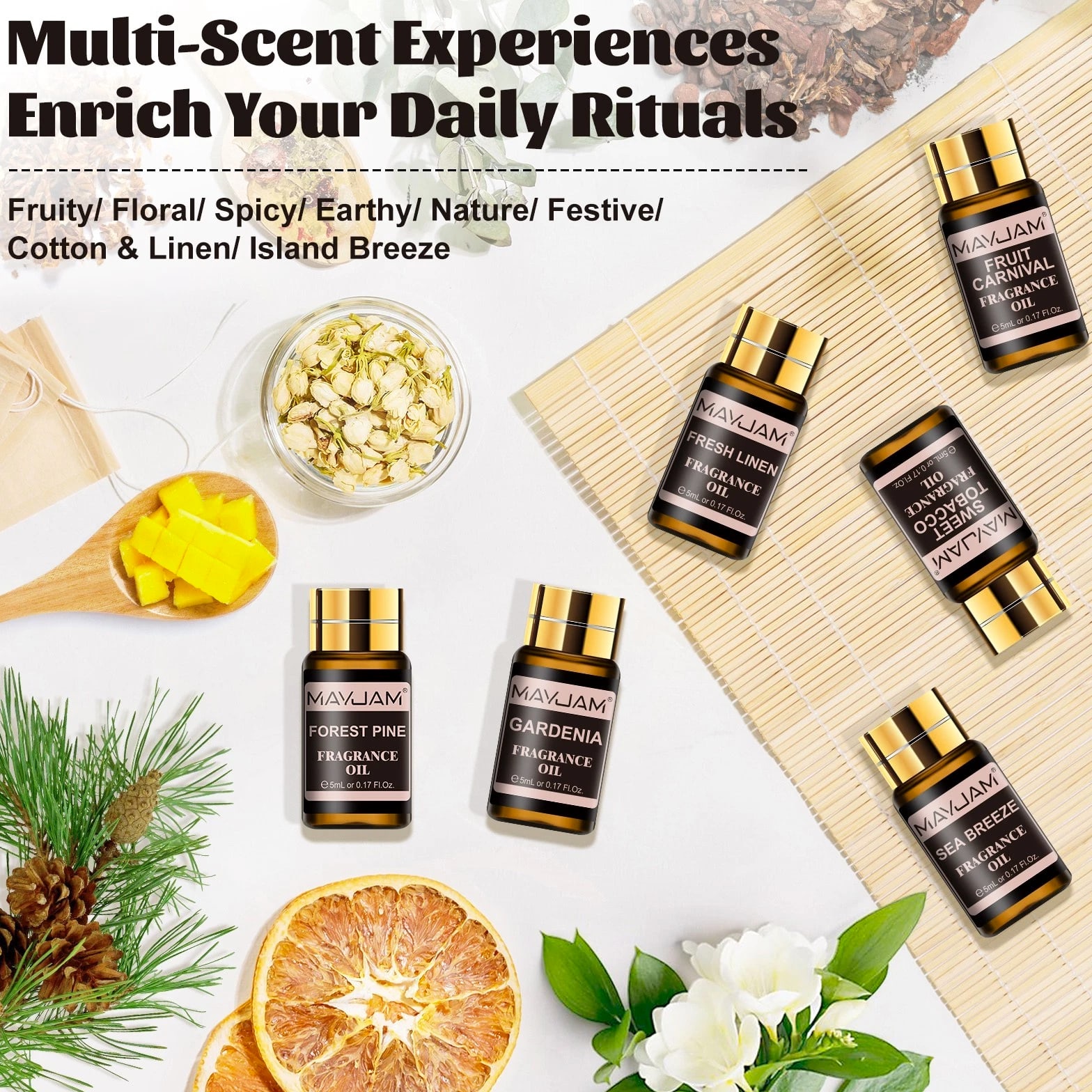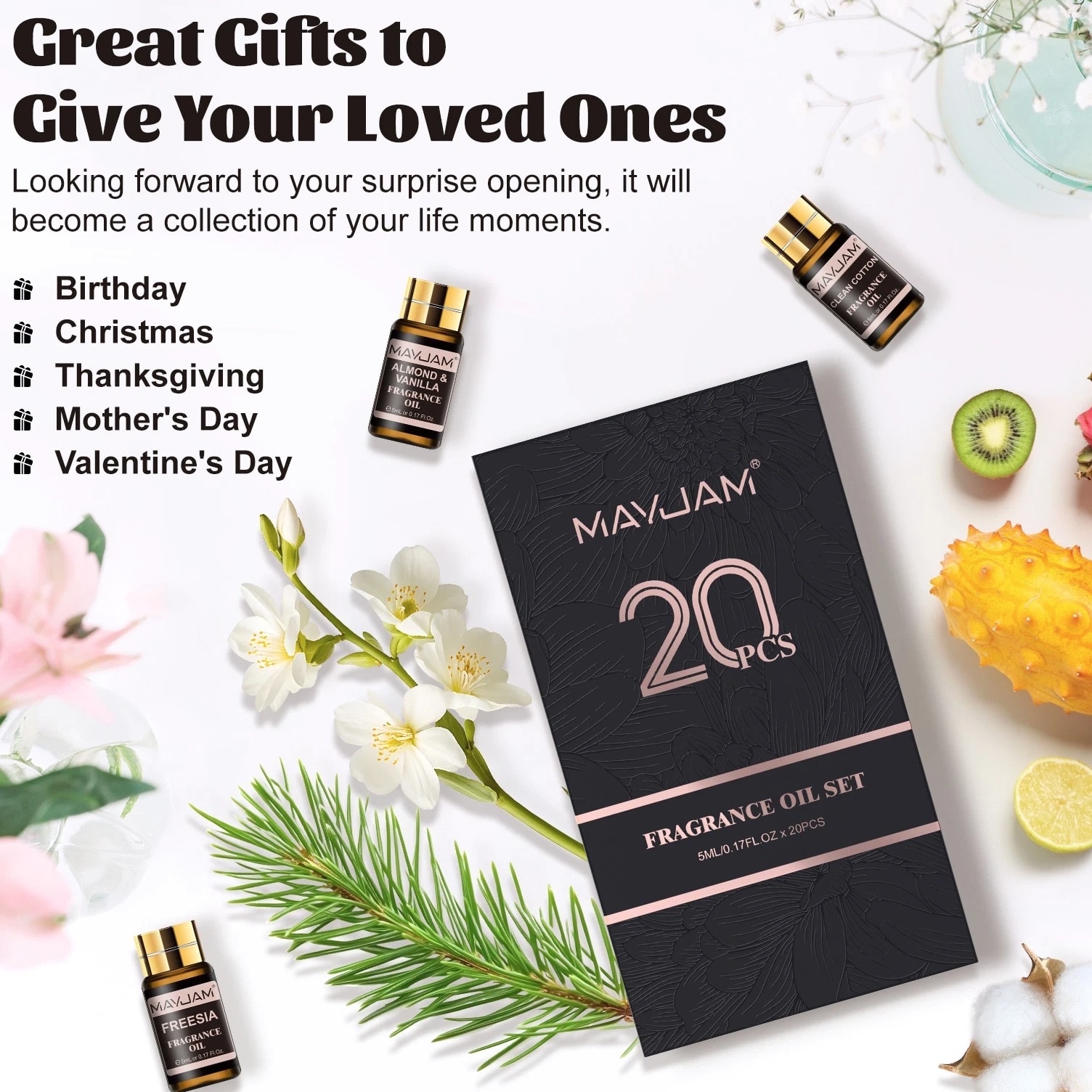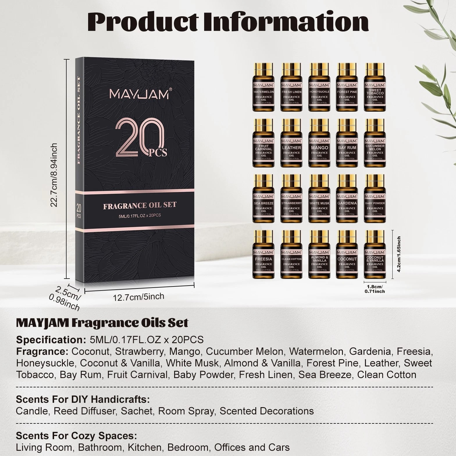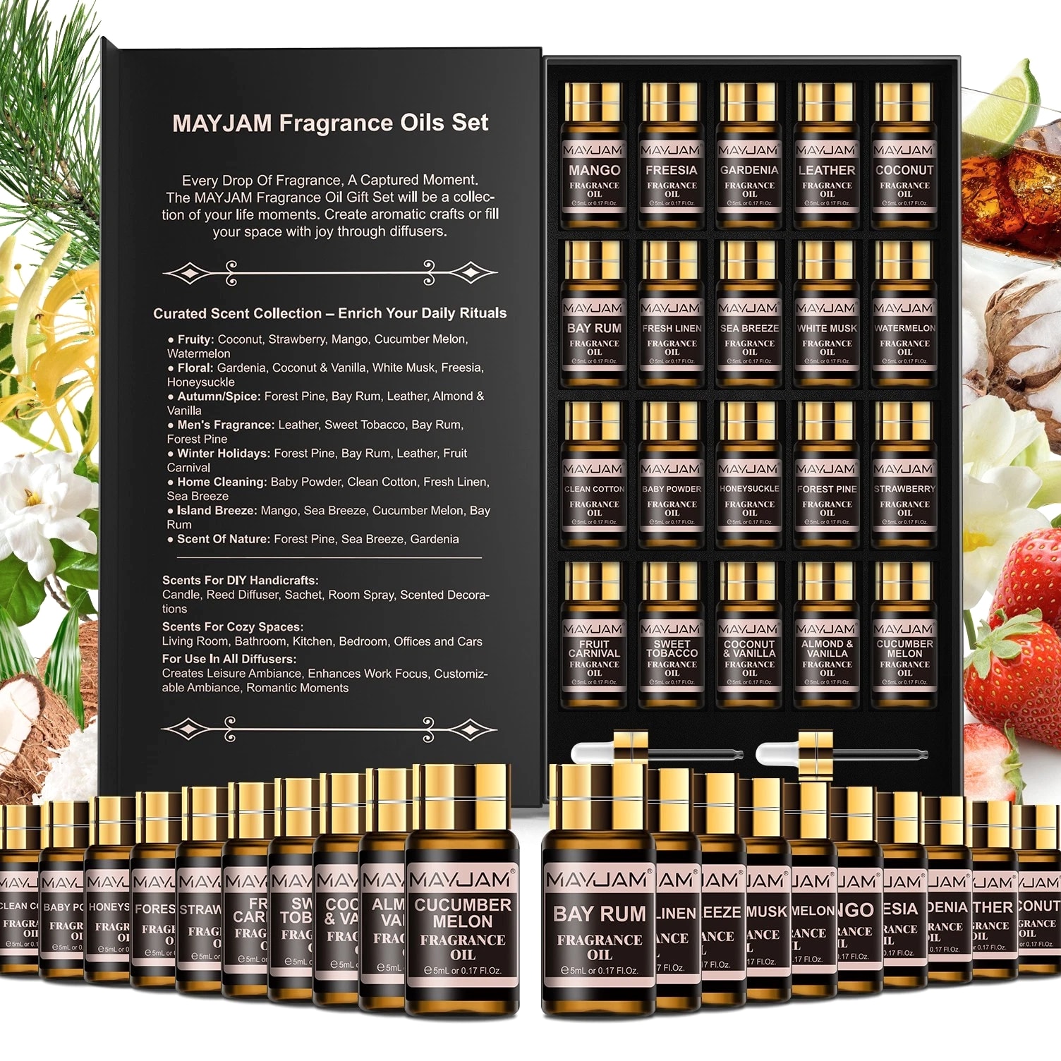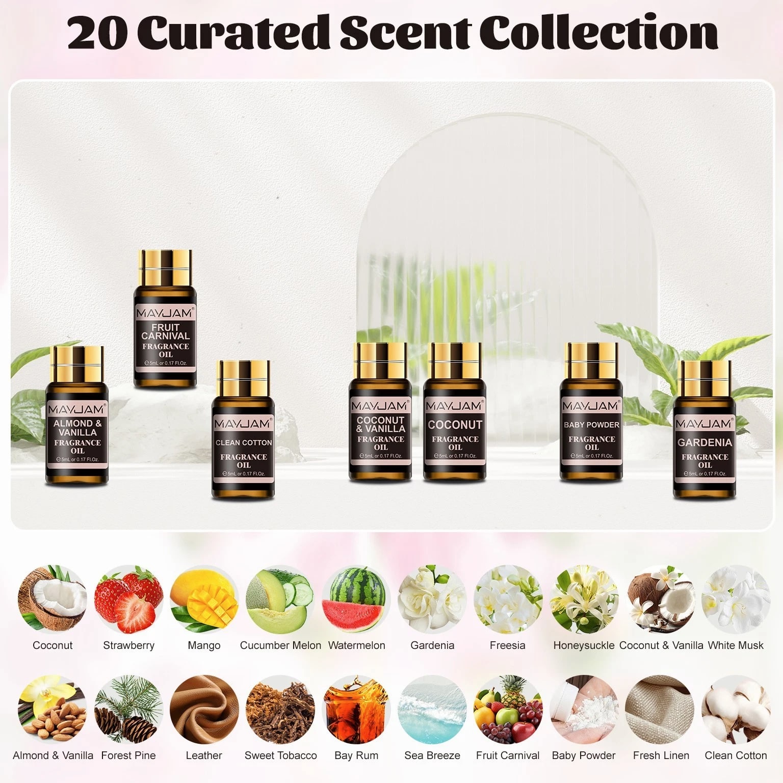 MAYJAM 100ml Essential Oils 100% Pure Natural Therapeutic Grade Oil Aromatherapy 9.99 USD Free shipping MAYJAM 3.38 oz Essential Oils 3.38 fl oz 100% Pure Natural Therapeutic Grade Oil 9.88 USD Free shipping MAYJAM Essential Oils - 3.38 fl oz - 100% Pure & Natural - Therapeutic Grade Oil 9.99 USD Free shipping MAYJAM 3.38 Fl Oz Essential Oils - 100% Pure and Natural - Therapeutic Grade Oil 8.99 USD Free shipping MAYJAM 20 Pcs Pure Essential Oil Set Aromatherapy Gift Diffuser Fragrance Oil 5ml 13.49 USD Free shipping MAYJAM 35 Pcs 5ml Essential Oil Set Aromatherapy Gift 100% Pure Oils for Diffuser 20.51 USD Free shipping Description Description: *MAYJAM fragrance oils are highly concentrated and feature a soothing and pleasant aroma. Fruity & floral fragrance oils for diffusers for home have an extremely rich, complex and long-lasting fragrance, ideal for enhancing any atmosphere *You can drop 2-3 drops of fragrance oil on the aroma diffuser/car diffuser/reed diffuser/crystal diffuser/DIY aroma spray/humidifier/oil burner, the faint natural scent will slowly fill the space, you can feel the most natural plant scent in every breath. And the diffused wood can be used in wardrobes, bedrooms, study rooms, offices, cars and other spaces. *Select plant essential oil blends to refresh every breath you take. Each fragrance oil comes in 5ml amber brown bottles. This will keep the oils fresh and help against light degradation. *Comes with a beautiful box, wonderful fragrance oils gift option, which is fashion enough and would be wonderful to send it to family or friends. Specification: Capacity: 5ml/pc Quantity: 20pcs/set(Fresh Linen/Coconut & Vanilla/Sea Breeze/Clean Cotton/Baby Powder/ Coconut/Strawberry/Mango/Cucumber Melon/Watermelon/Gardenia/Freesia/Honeysuckle/ White Musk/Almond & Vanilla/Forest Pine/Leather/Sweet Tobacco/Bay Rum/Fruit Carnival) Curated scent collocation: Fruity: Coconut, Strawberry, Mango, Cucumber Melon, Watermelon Floral: Gardenia, Coconut & Vanilla,