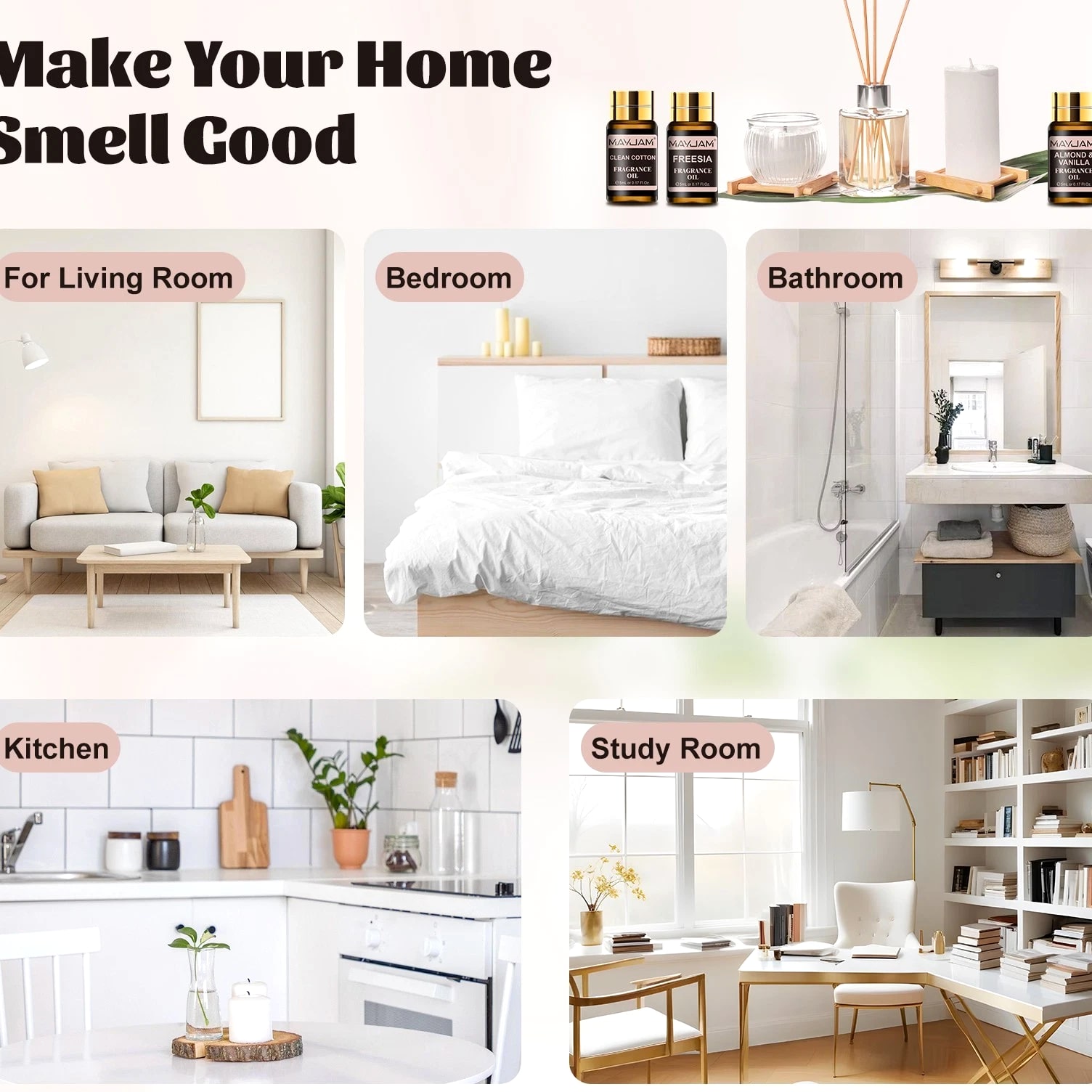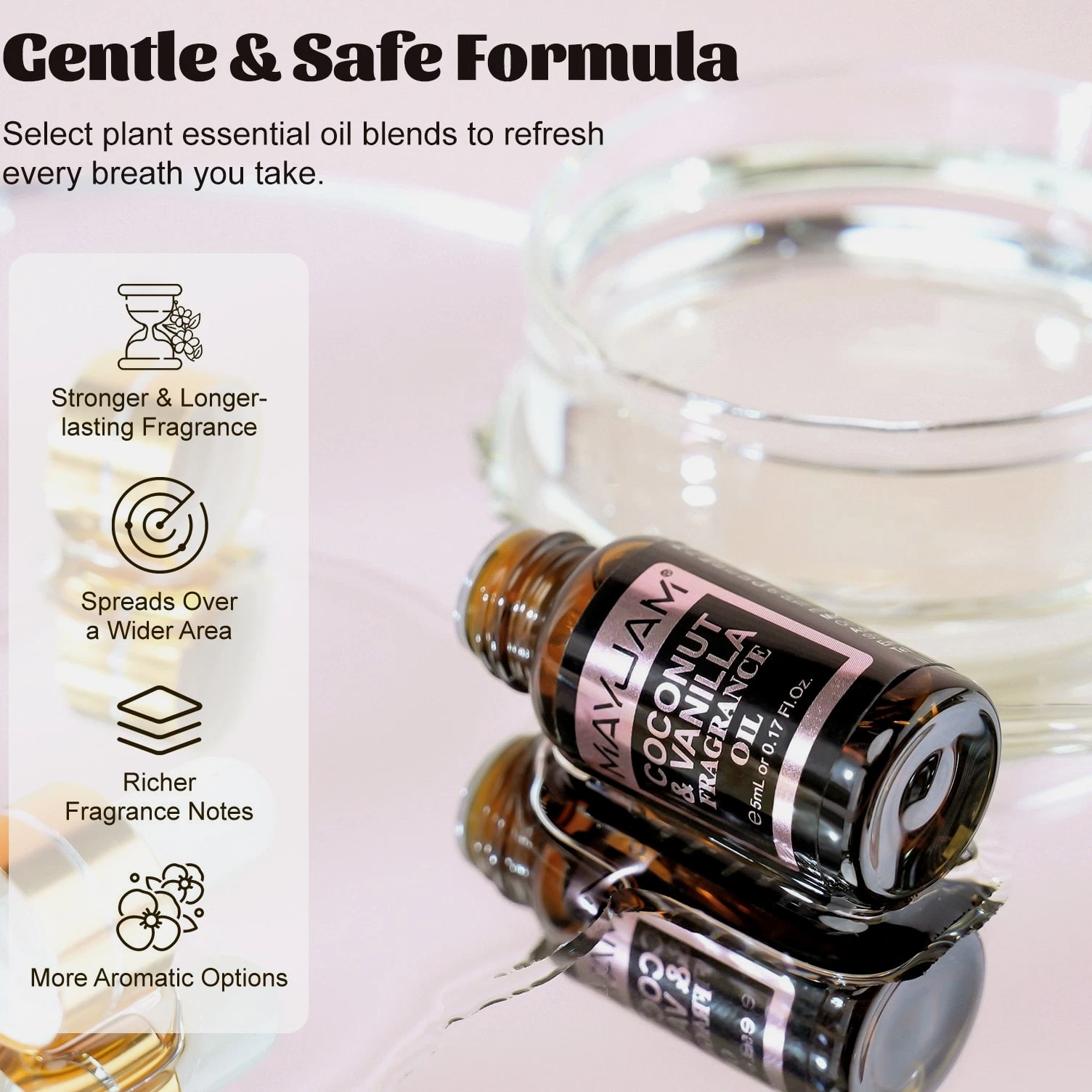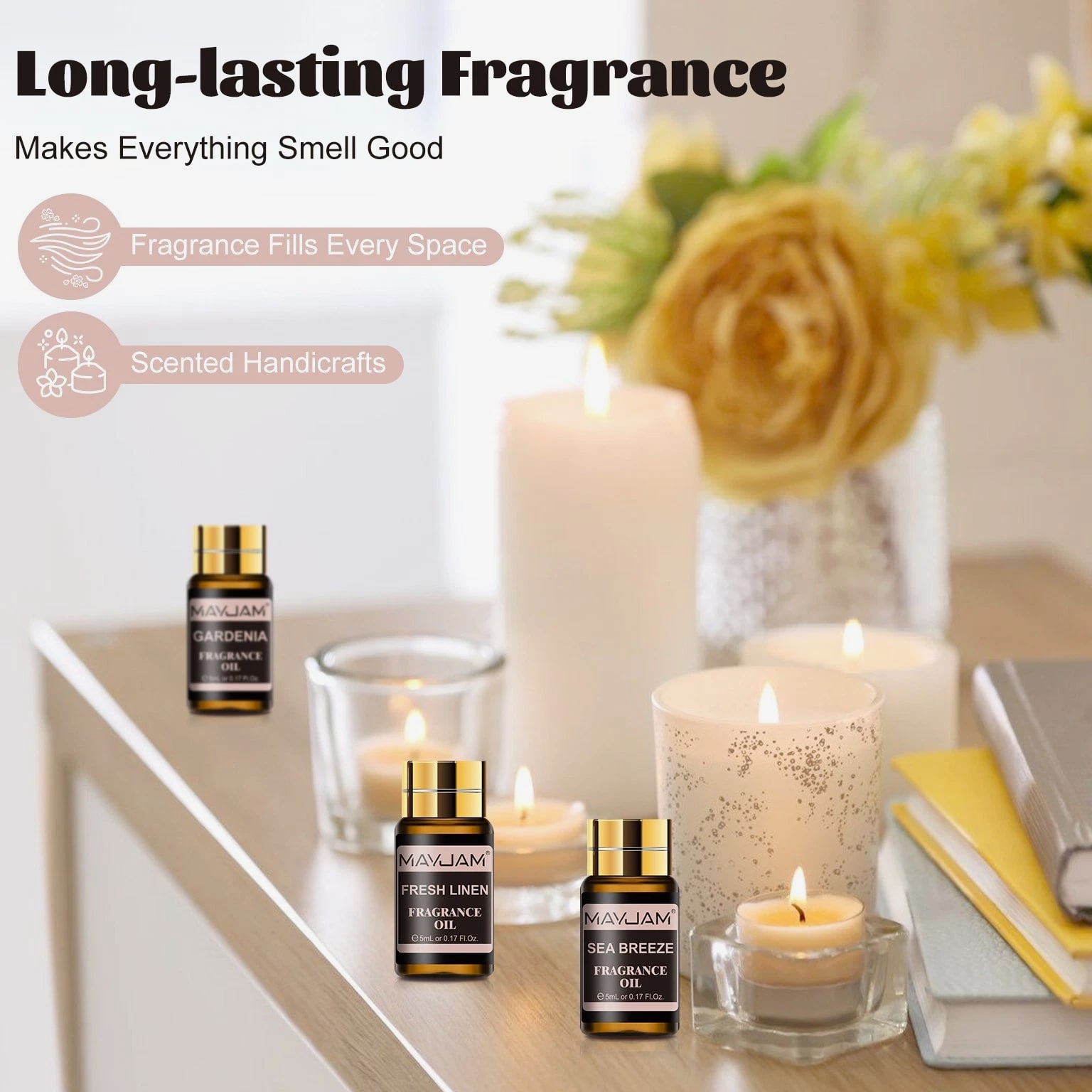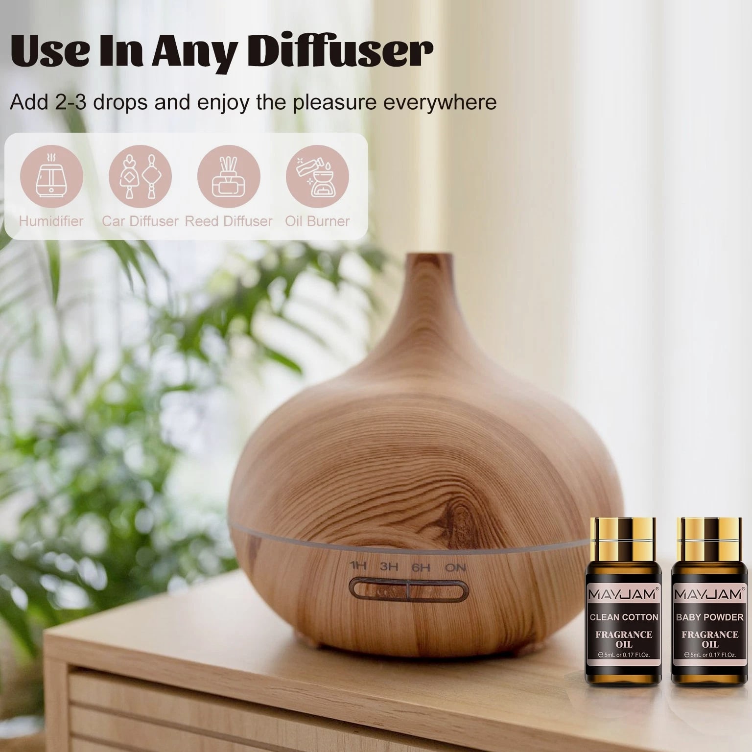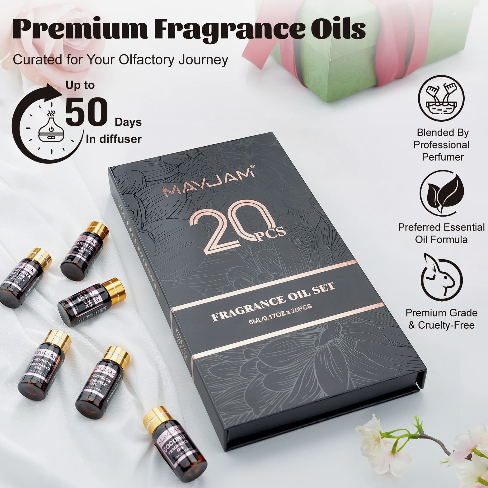 MAYJAM 100ml Essential Oils 100% Pure Natural Therapeutic Grade Oil Aromatherapy 9.99 USD Free shipping MAYJAM 3.38 oz Essential Oils 3.38 fl oz 100% Pure Natural Therapeutic Grade Oil 9.88 USD Free shipping MAYJAM Essential Oils - 3.38 fl oz - 100% Pure & Natural - Therapeutic Grade Oil 9.99 USD Free shipping MAYJAM 3.38 Fl Oz Essential Oils - 100% Pure and Natural - Therapeutic Grade Oil 8.99 USD Free shipping MAYJAM 20 Pcs Pure Essential Oil Set Aromatherapy Gift Diffuser Fragrance Oil 5ml 13.49 USD Free shipping MAYJAM 35 Pcs 5ml Essential Oil Set Aromatherapy Gift 100% Pure Oils for Diffuser 20.51 USD Free shipping Description Description: *MAYJAM fragrance oils are highly concentrated and feature a soothing and pleasant aroma. Fruity & floral fragrance oils for diffusers for home have an extremely rich, complex and long-lasting fragrance, ideal for enhancing any atmosphere *You can drop 2-3 drops of fragrance oil on the aroma diffuser/car diffuser/reed diffuser/crystal diffuser/DIY aroma spray/humidifier/oil burner, the faint natural scent will slowly fill the space, you can feel the most natural plant scent in every breath. And the diffused wood can be used in wardrobes, bedrooms, study rooms, offices, cars and other spaces. *Select plant essential oil blends to refresh every breath you take. Each fragrance oil comes in 5ml amber brown bottles. This will keep the oils fresh and help against light degradation. *Comes with a beautiful box, wonderful fragrance oils gift option, which is fashion enough and would be wonderful to send it to family or friends. Specification: Capacity: 5ml/pc Quantity: 20pcs/set(Fresh Linen/Coconut & Vanilla/Sea Breeze/Clean Cotton/Baby Powder/ Coconut/Strawberry/Mango/Cucumber Melon/Watermelon/Gardenia/Freesia/Honeysuckle/ White Musk/Almond & Vanilla/Forest Pine/Leather/Sweet Tobacco/Bay Rum/Fruit Carnival) Curated scent collocation: Fruity: Coconut, Strawberry, Mango, Cucumber Melon, Watermelon Floral: Gardenia, Coconut & Vanilla,