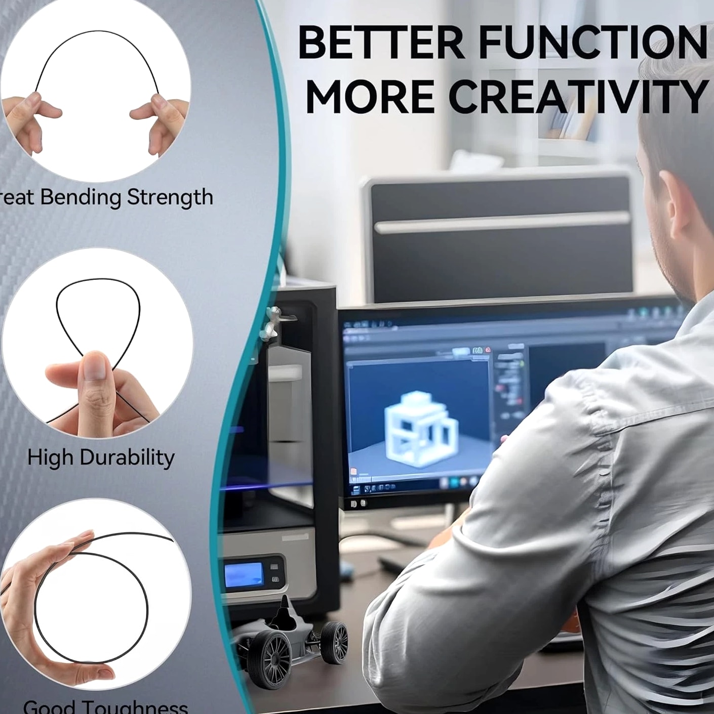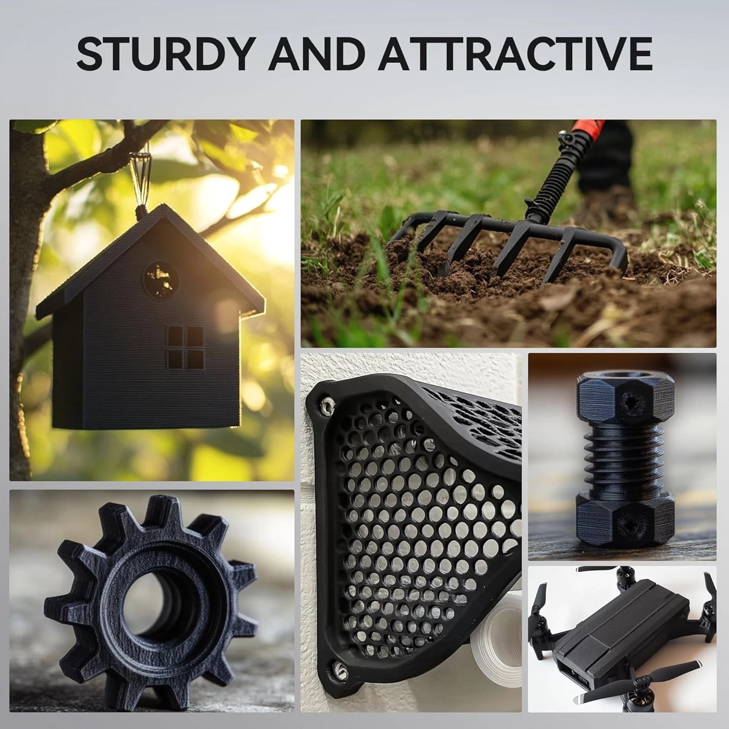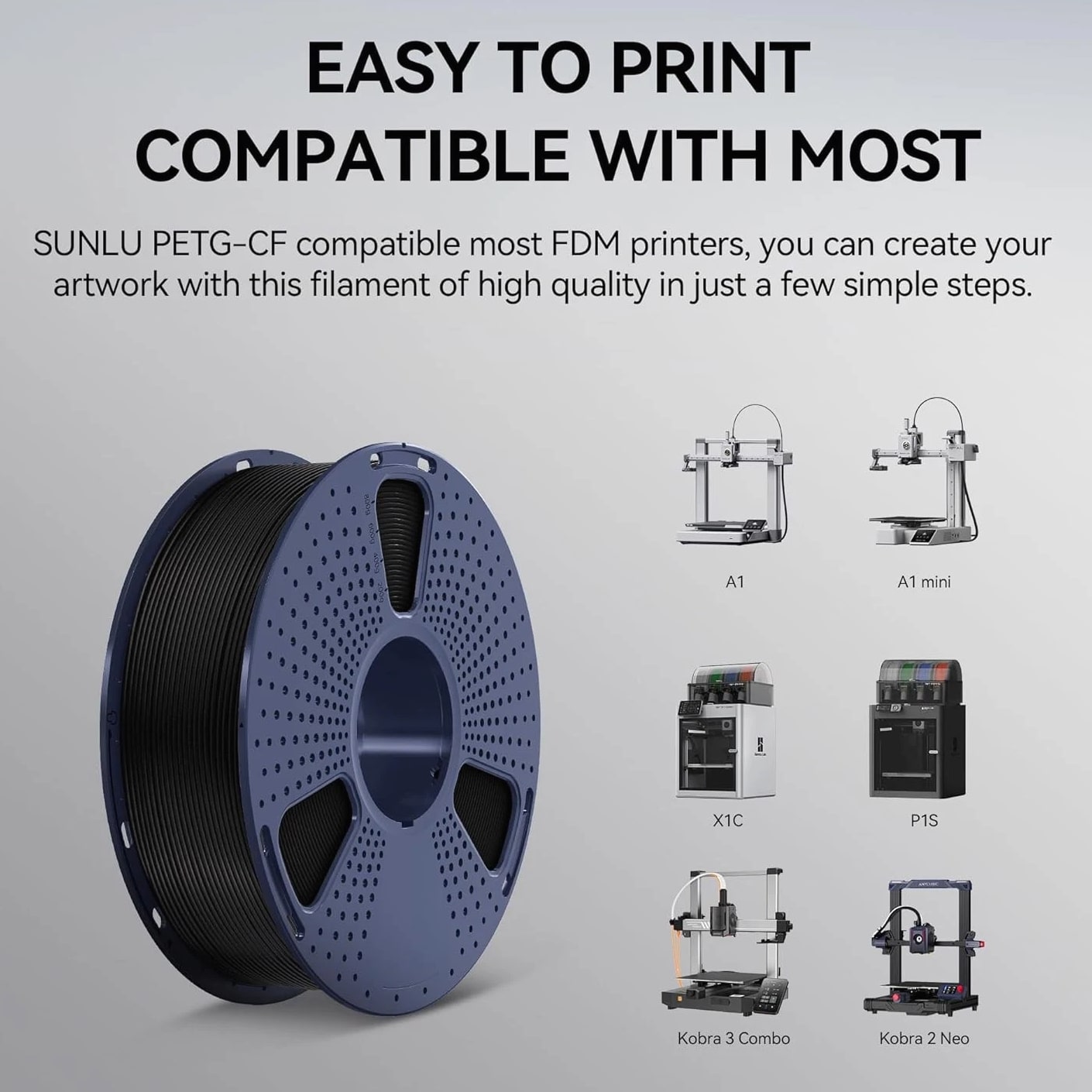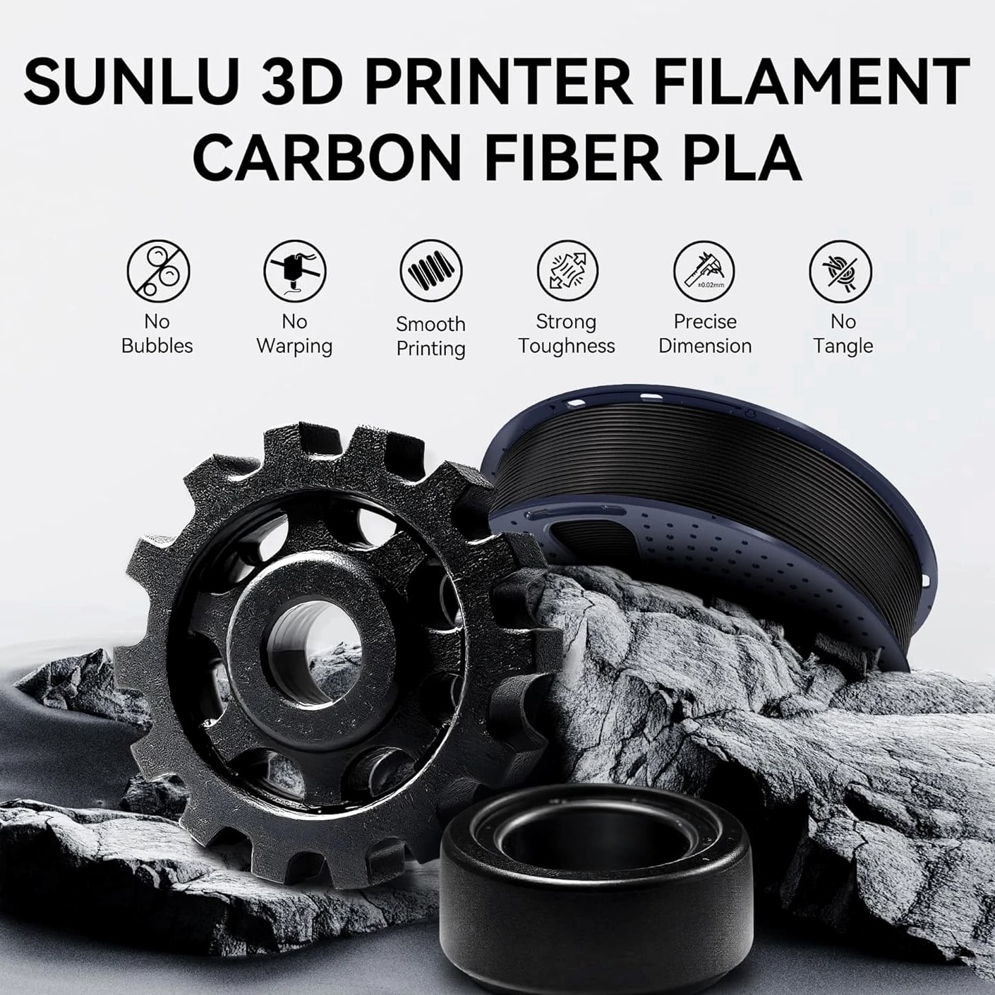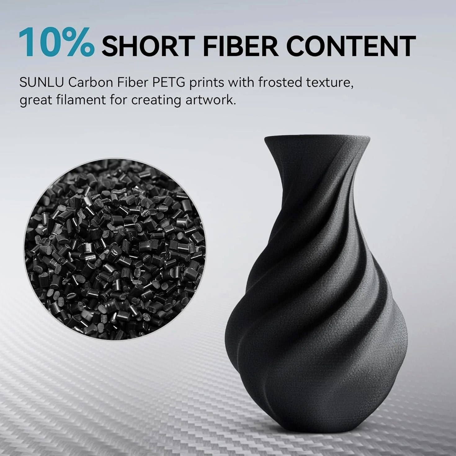 SUNLU PETG-Carbon Fiber 1.75mm 【SUNLU Carbon Fiber PETG Filament】- SUNLU PETG-CF 3D printer filament is reinforced with 10% carbon fiber to increase the strength of PETG while maintaining its impact resistance. 【High Impact Strength】- With its high impact resistance, PETG is ideal for printing parts that need to endure bumps and drops, ensuring long-lasting performance without cracks or breaks. 【Heat-Resistant】- The heat distortion temperature is up to 130°C. PETG-CF improved temperature and heat resistance while maintaining the impact resistance characteristic of PETG Filament. 【Robust Durability】- PETG prints are robust and maintain their properties over time, making them suitable for both indoor and outdoor applications where weather resistance is a necessity. 【Less Stringing & No Blocking】- SUNLU PETG filament is specially engineered to reduce stringiness and eliminate clogging, ensuring a smooth and consistent print every time. 【Matte Frosted Texture】- Newly introduced carbon fiber PETG filament. Designed for matte effect printing. Ideal for creations that require a sophisticated and flawless look. 【1.75mm Diameter】- Dimensional Accuracy +/- 0.03mm. SUNLU filament has wide compatibility due to the small diameter error, it's suitable for most 1.75mm FDM 3D printers. 【PETG Recommend Settings】- We recommend printing the PETG-CF filament at a nozzle temperature of 240-250°C, bed temperature of 50-70°C, printing speed of 50-150mm/s.