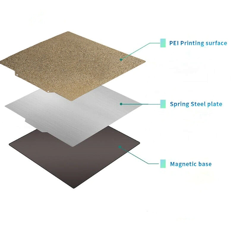Product Description Advantages: Never warps & never rusts. Easy to get the first layer even for a new user Flexible, Removable, sticks to magnets very well Suits variety of filaments, especially for PLA Free clean- just flex the plate a little then take the prints off after cooled Fast heater performance, less waiting time after printing. A lifetime 3D printer bed Packing list PEI Printing Surface Spring Steel Plate Magnetic Base Material: 100% real Ultem1000( PEI)amber color, matte surface.-0.125mm thickness - Made in Europe This spring steel sheet is flat, flexible, stainless steel, sticks to magnets very well. How to use? After applying the PEI sheet on our special spring stainless steel sheet, You can simply use 4 clips or magnets to hold it on the heatbed, then enjoy the printing. Easily remove 3D prints on printer by removing the spring steel plate, flexing it, and popping the print off. It's simple and makes the print removal process much easier.