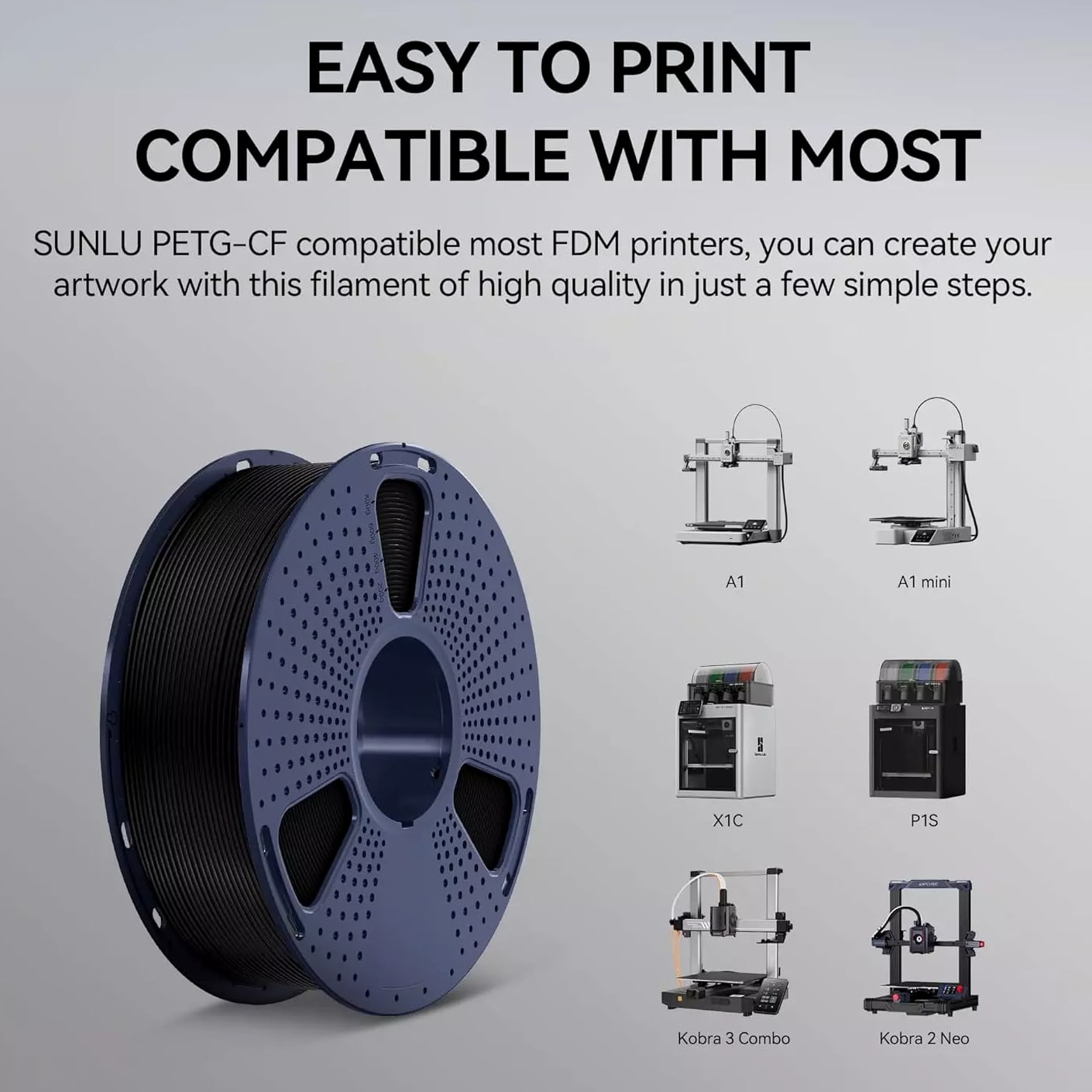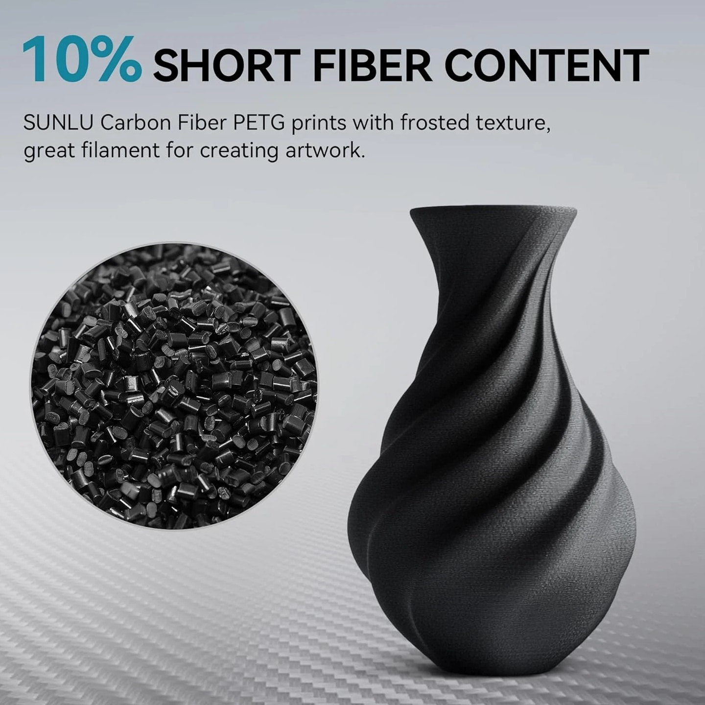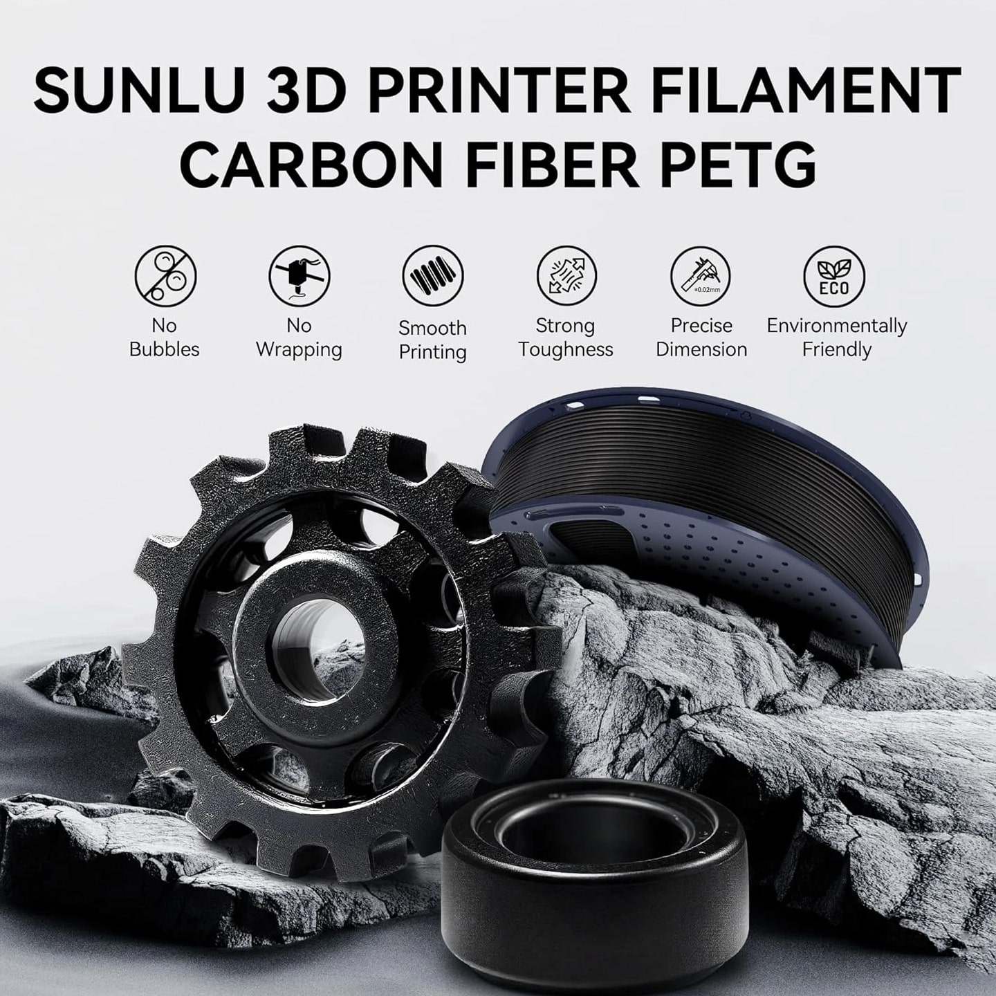 SUNLU Carbon Fiber Filament, PETG-CF 3D Printer Filament 1.75mm, Excellent Mechanical Properties, High Impact Strength, Heat-Resistant, Fit Most FDM Printers, PETG CF 1KG Spool. (Matte Black) About this item 【SUNLU Carbon Fiber PETG Filament】- SUNLU PETG-CF 3D printer filament is reinforced with 10% carbon fiber to increase the strength of PETG while maintaining its impact resistance. 【High Impact Strength】- With its high impact resistance, PETG is perfect for printing parts that need to endure bumps and drops, ensuring long-lasting performance without cracks or breaks. 【Heat-Resistant】- The heat distortion temperature reaches 130°C. PETG-CF improved temperature resistance while maintaining the impact resistance characteristic of PETG Filament. 【Robust Durability】- PETG prints are robust and maintain their properties over time, making them suitable for both indoor and outdoor applications where weather resistance is a necessity. 【Less Stringing & No Clogging】- SUNLU PETG filament is specially engineered to reduce stringiness and eliminate blocking, ensuring a smooth and consistent print every time. 【Frosted Matte Texture】- Newly introduced carbon fiber PETG filament. Designed for matte effect printing. Ideal for creations that require a sophisticated and flawless look. 【1.75mm Diameter】- Dimensional Accuracy +/- 0.03mm. SUNLU filament has wide compatibility due to the small diameter error, it's suitable for most 1.75mm FDM 3D printers. 【PETG Recommend Settings】- We recommend printing the PETG-CF filament at a nozzle temperature of 240-250°C, bed temperature of 50-70°C, printing speed of 50-150mm/s. 【Wide Compatibility】- SUNLU PETG filament has a diameter accuracy of +/-0.03mm, small diameter error, wide compatibility, and can be used on various common 3D printers. 【SUNLU Main 3D Products】- SUNLU offers a wide range of high-quality 3D printing products, including 3D printing filaments, 3D printers and various materials.